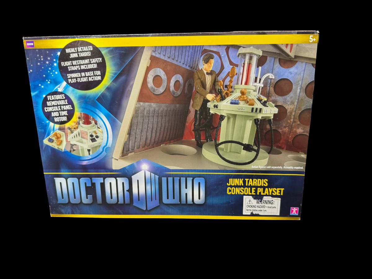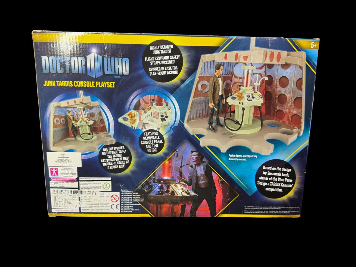 Components include TARDIS floor, rear walls, roof, console, time rotor, and flight restraint safety straps. The box has general storage related wear. Pre-auction estimate: $100-$150.