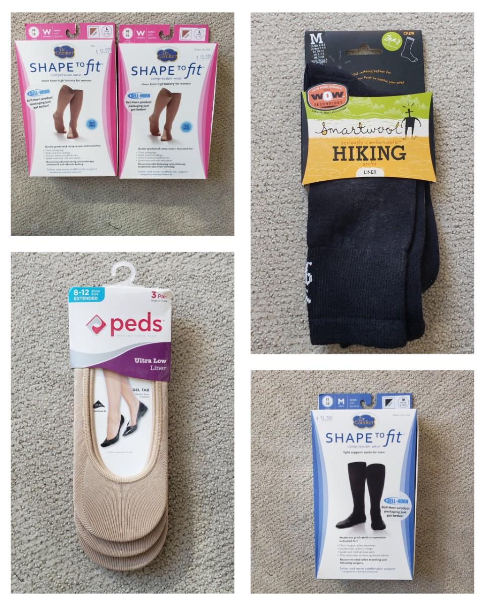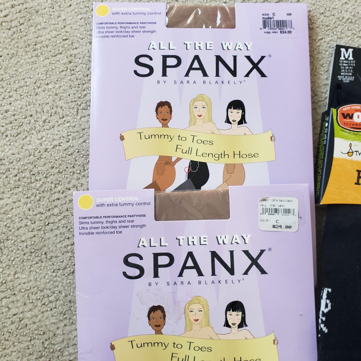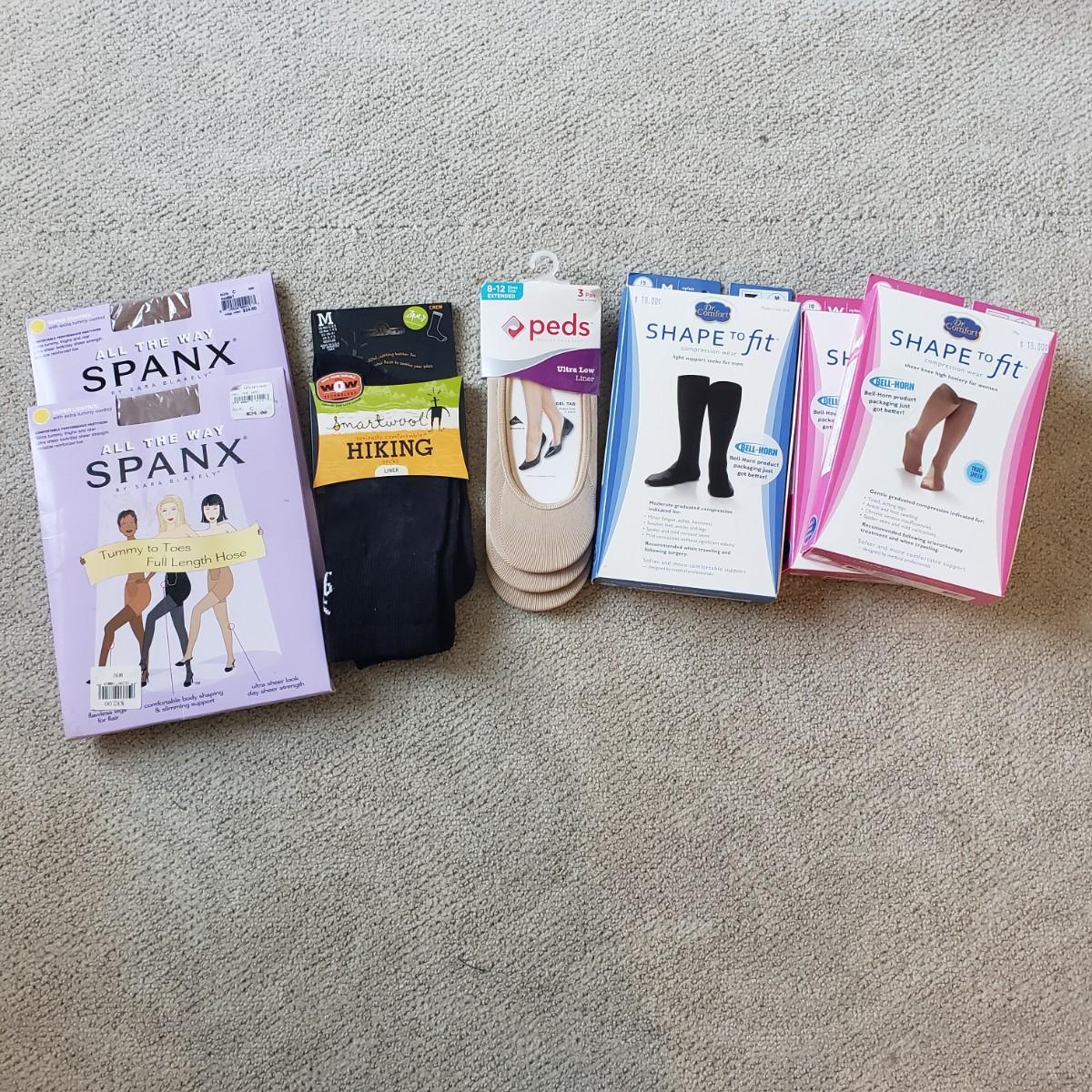 This lot contains NIB products. There are compression socks, Spanx hose, Peds liner socks and Smartwool socks. See pictures for colors, and sizes.