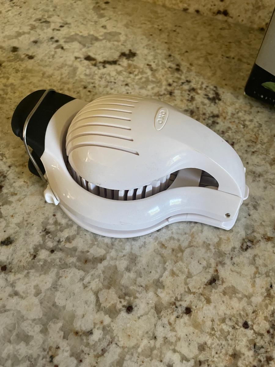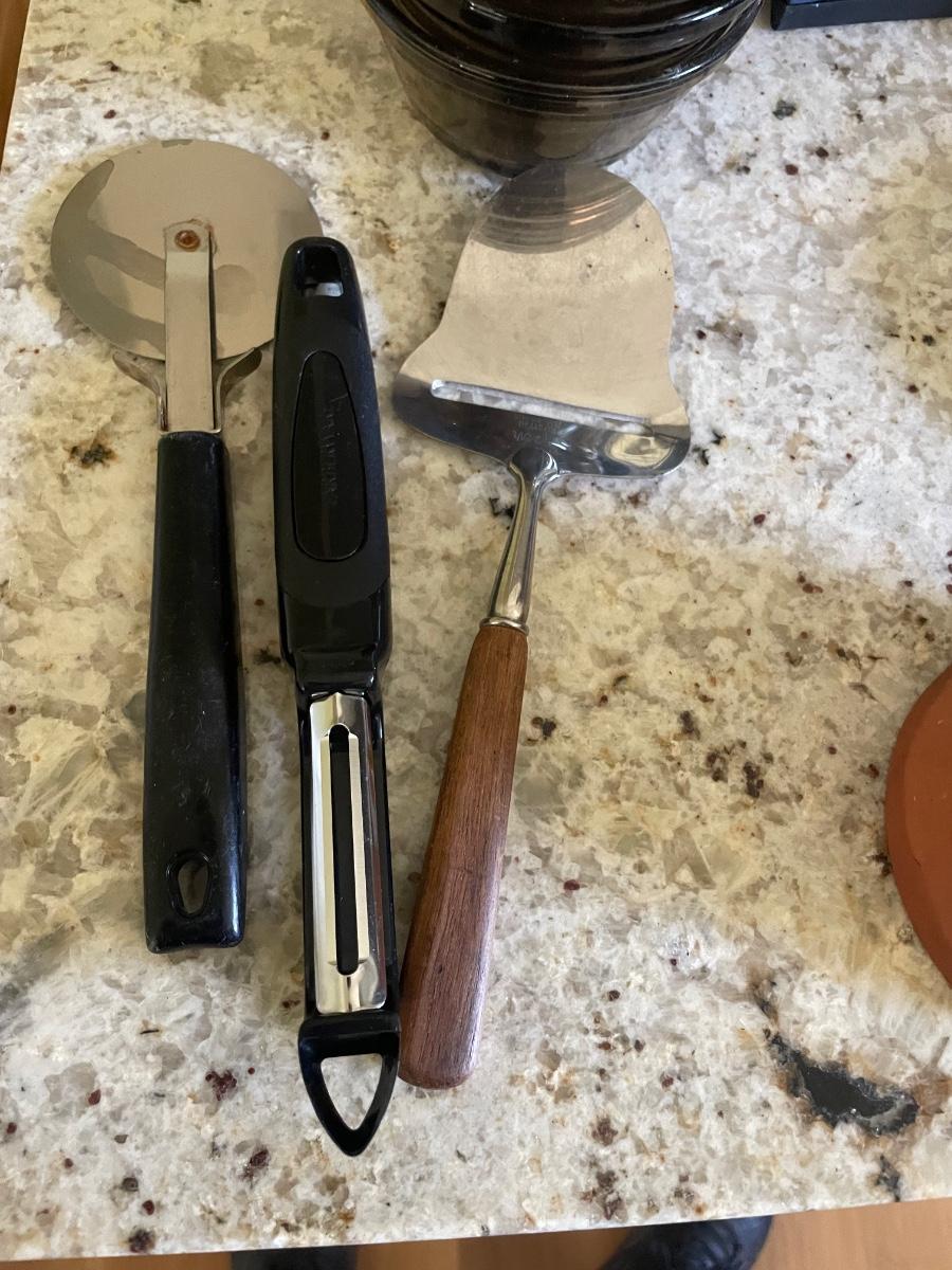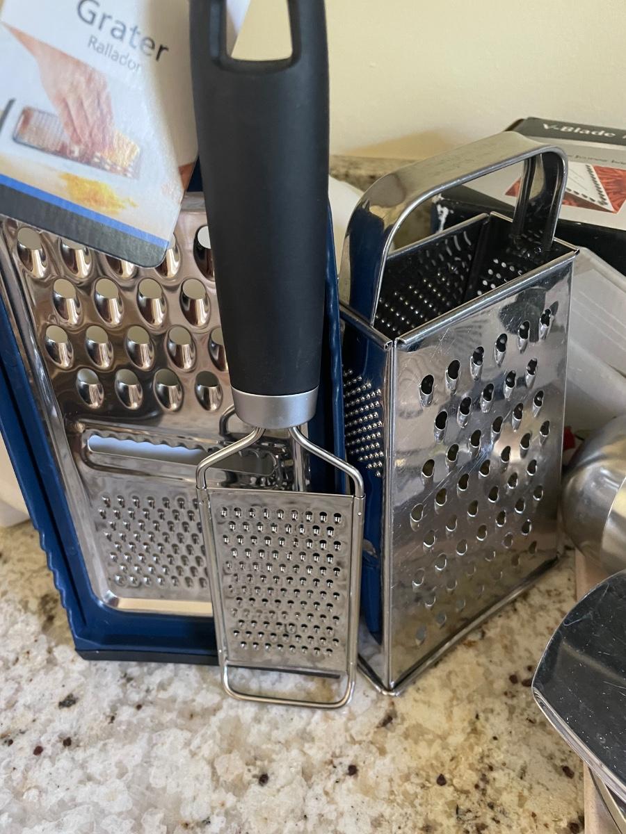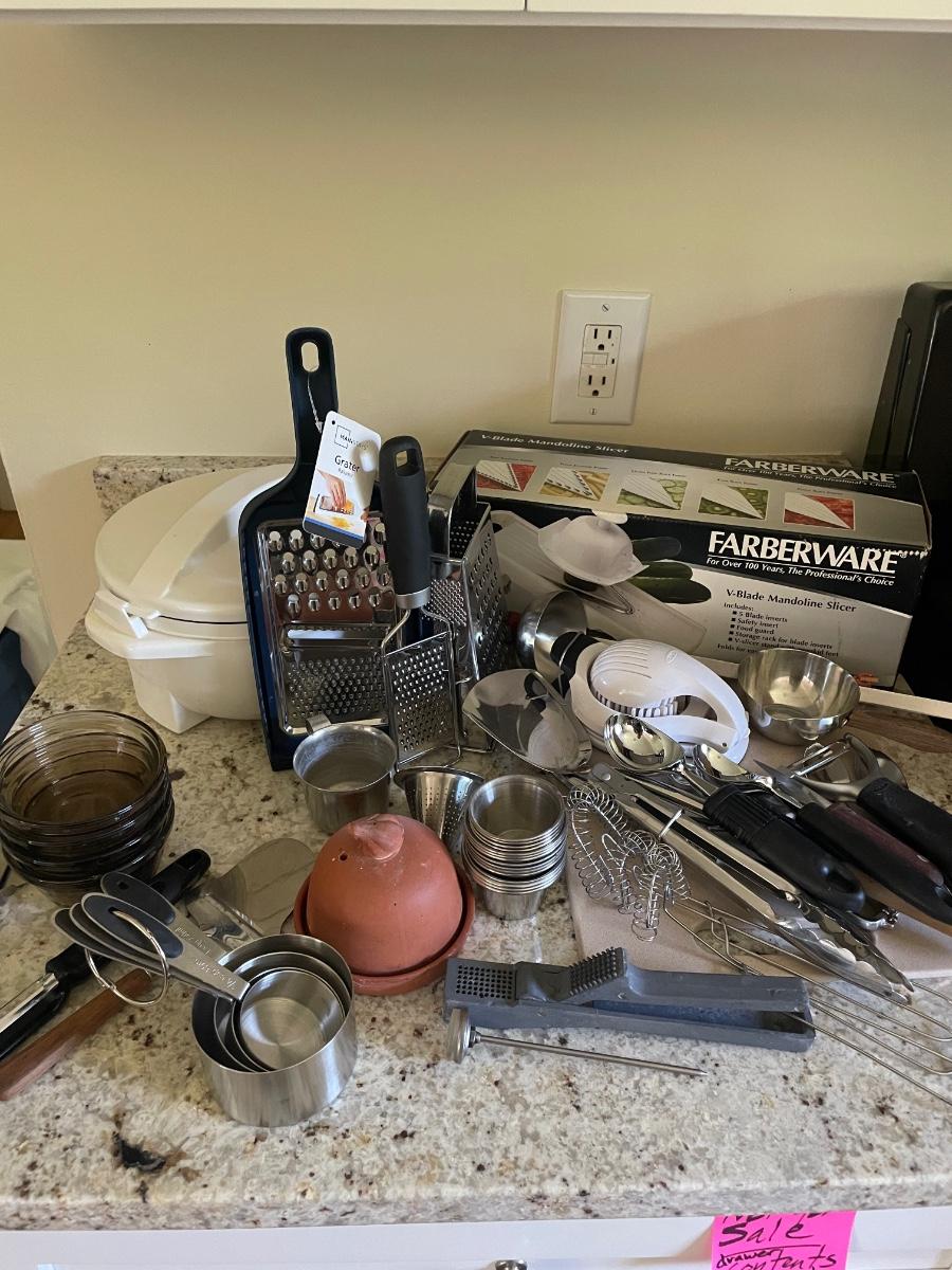 A great assortment of kitchen essentials that includes a new in box Faberware mandolin. Lot also includes lots of utensils, graters, plastic topped aluminum bowl with locking lid, small glass bowls, condiment cups, terracotta garlic keeper (note it does have a chip) plus lots more.