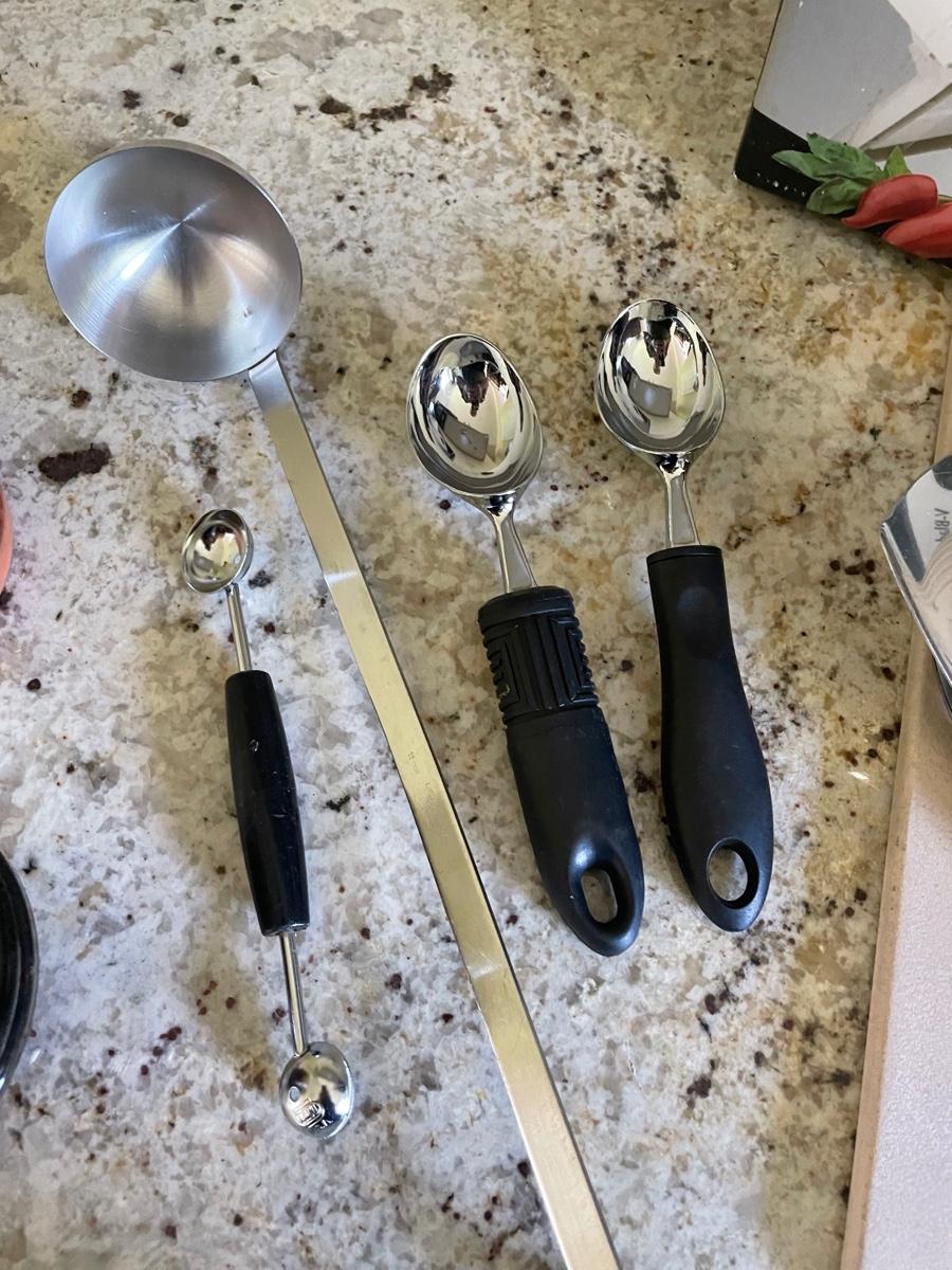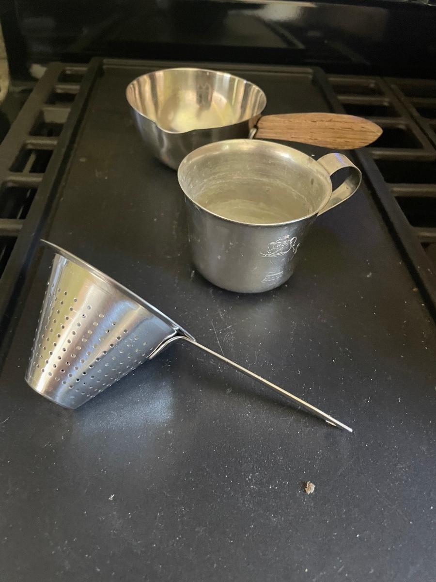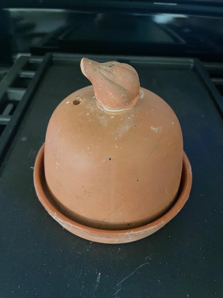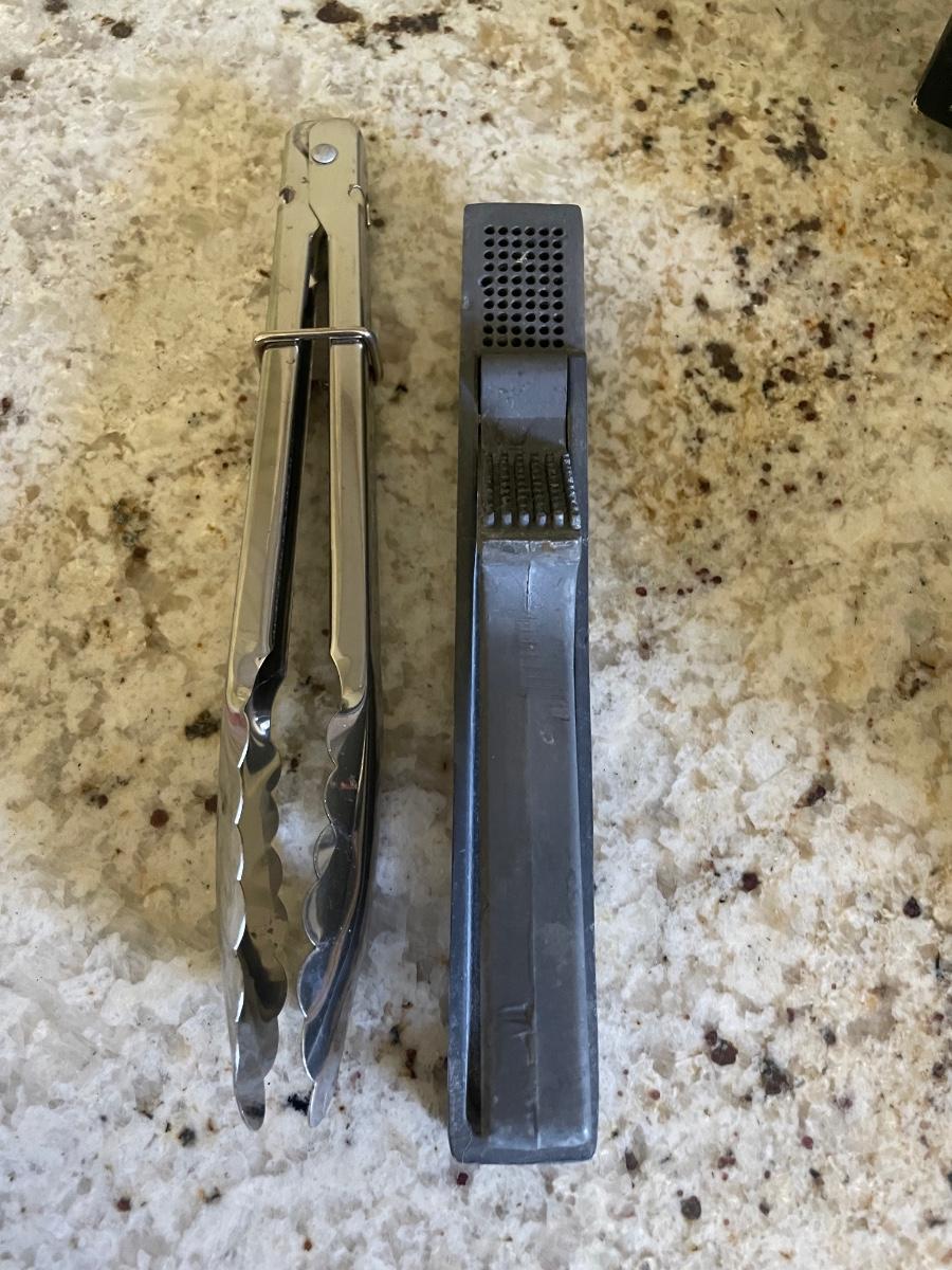 A great assortment of kitchen essentials that includes a new in box Faberware mandolin. Lot also includes lots of utensils, graters, plastic topped aluminum bowl with locking lid, small glass bowls, condiment cups, terracotta garlic keeper (note it does have a chip) plus lots more.