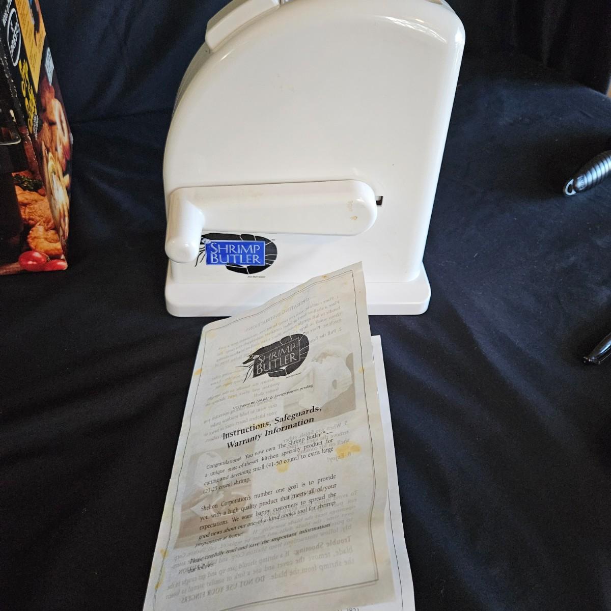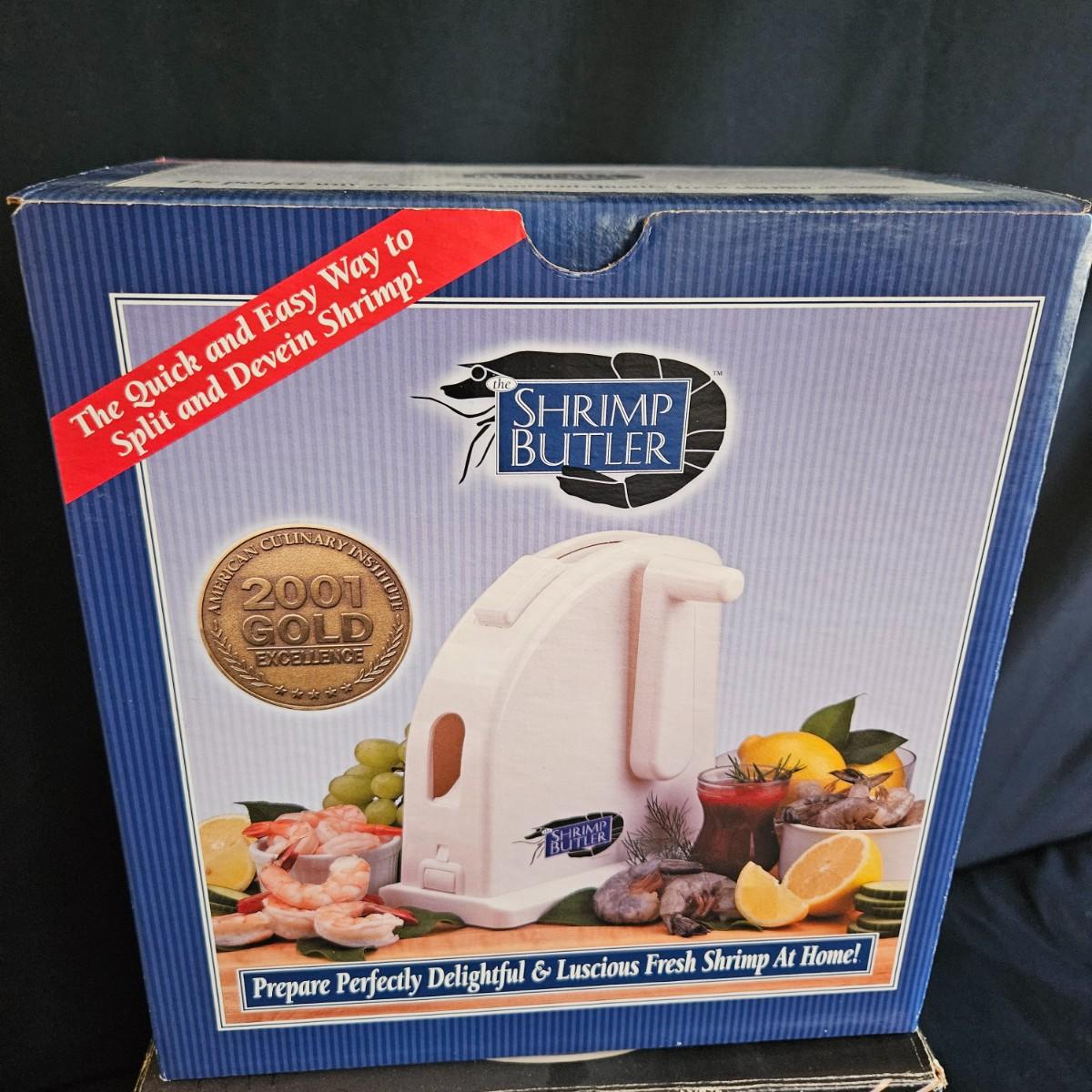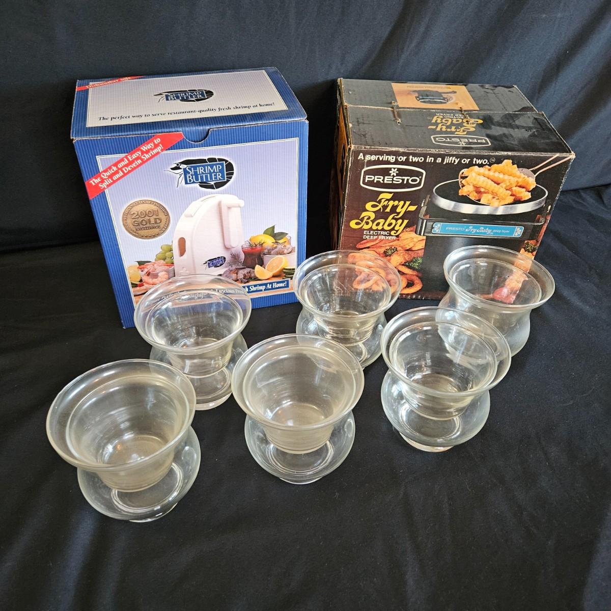 An assortment of kitchen items that include what appears to be a NIB Fry-Baby, itis in an unopened box and measures approximately 9" x 8.5 x 8.5"H. There is also a Shrimp Butler for cleaning shrimp and is in its original packaging and six shrimp cocktail cups that are two pieces that nest. Shipping available