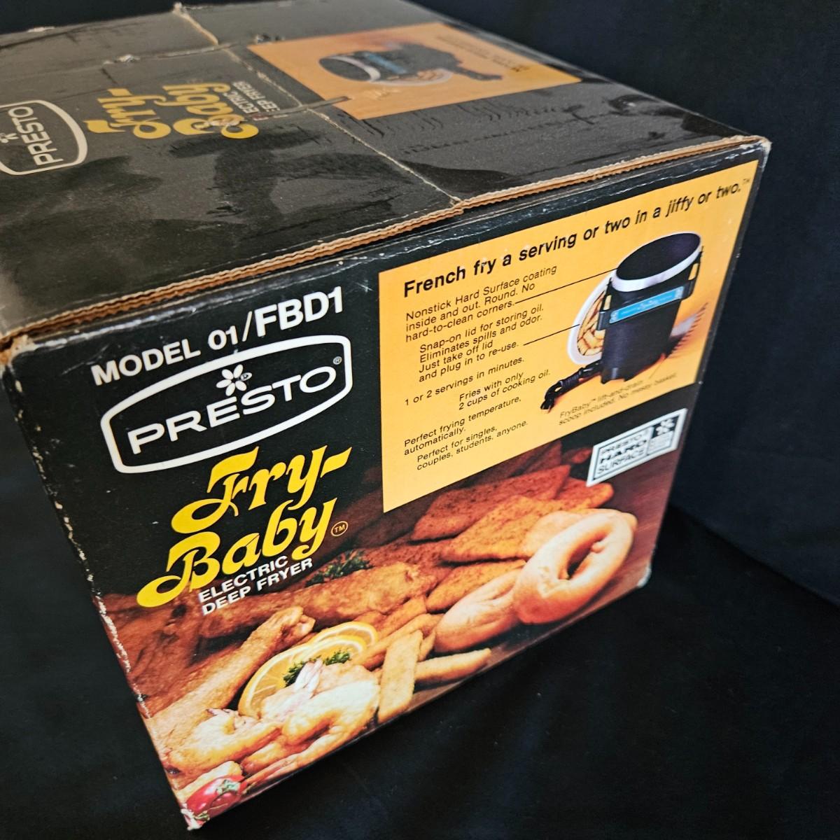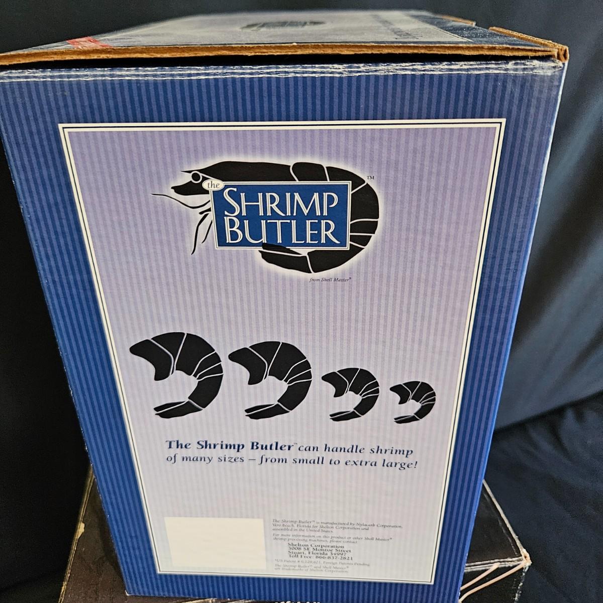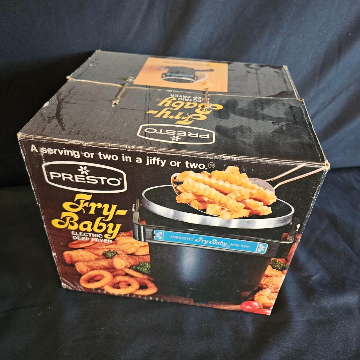 An assortment of kitchen items that include what appears to be a NIB Fry-Baby, itis in an unopened box and measures approximately 9" x 8.5 x 8.5"H. There is also a Shrimp Butler for cleaning shrimp and is in its original packaging and six shrimp cocktail cups that are two pieces that nest. Shipping available