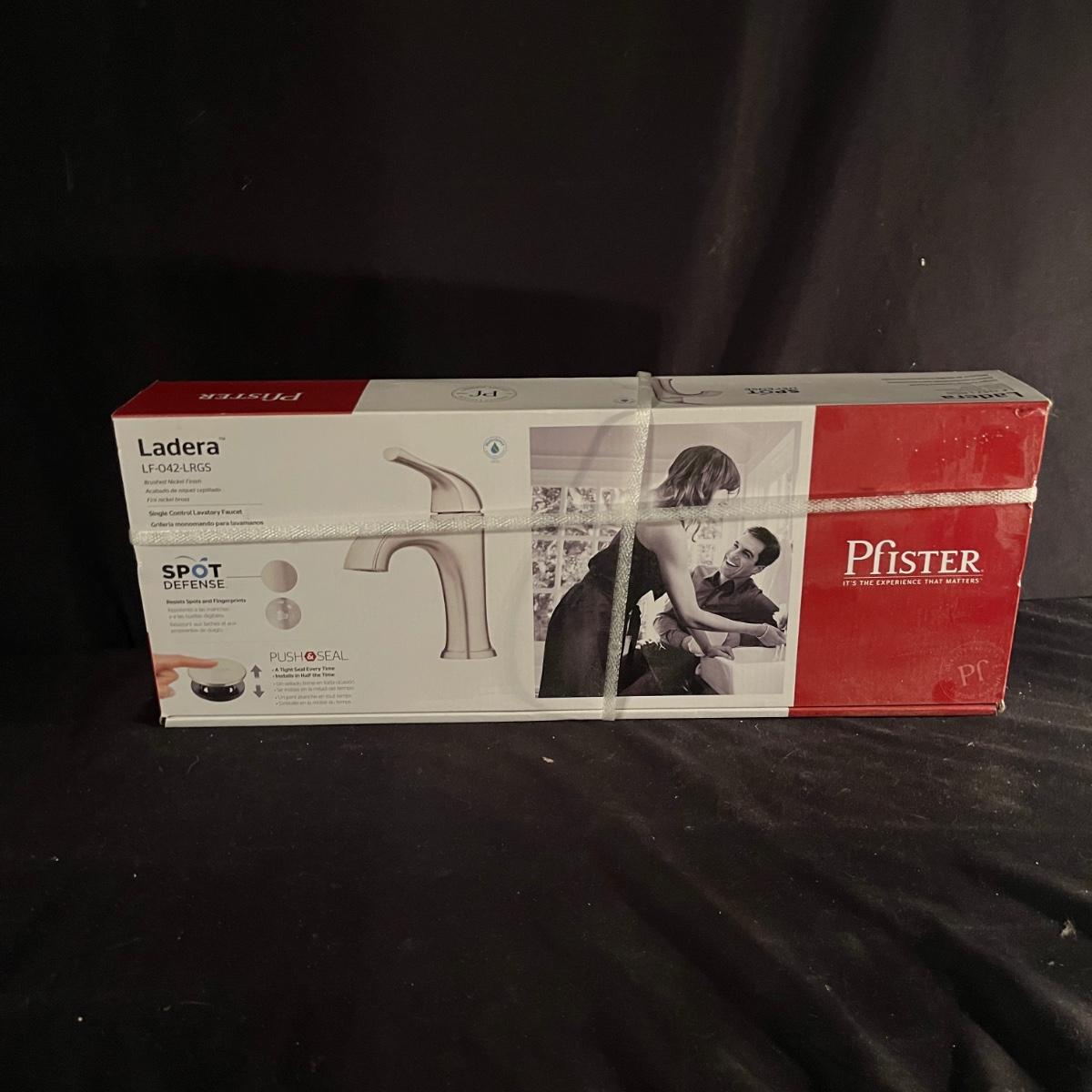 Lot includes a Glacier Bay sink and grab bar, Pfister faucet, Moen towel racks, towel ring and toilet paper holder and two corner shelves. All items are NIB.