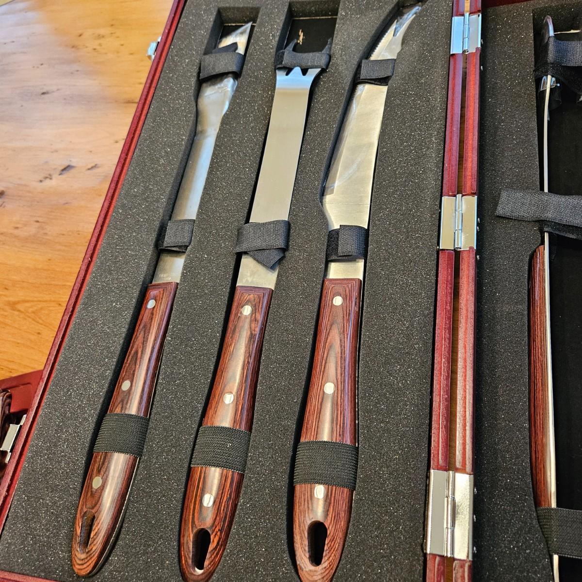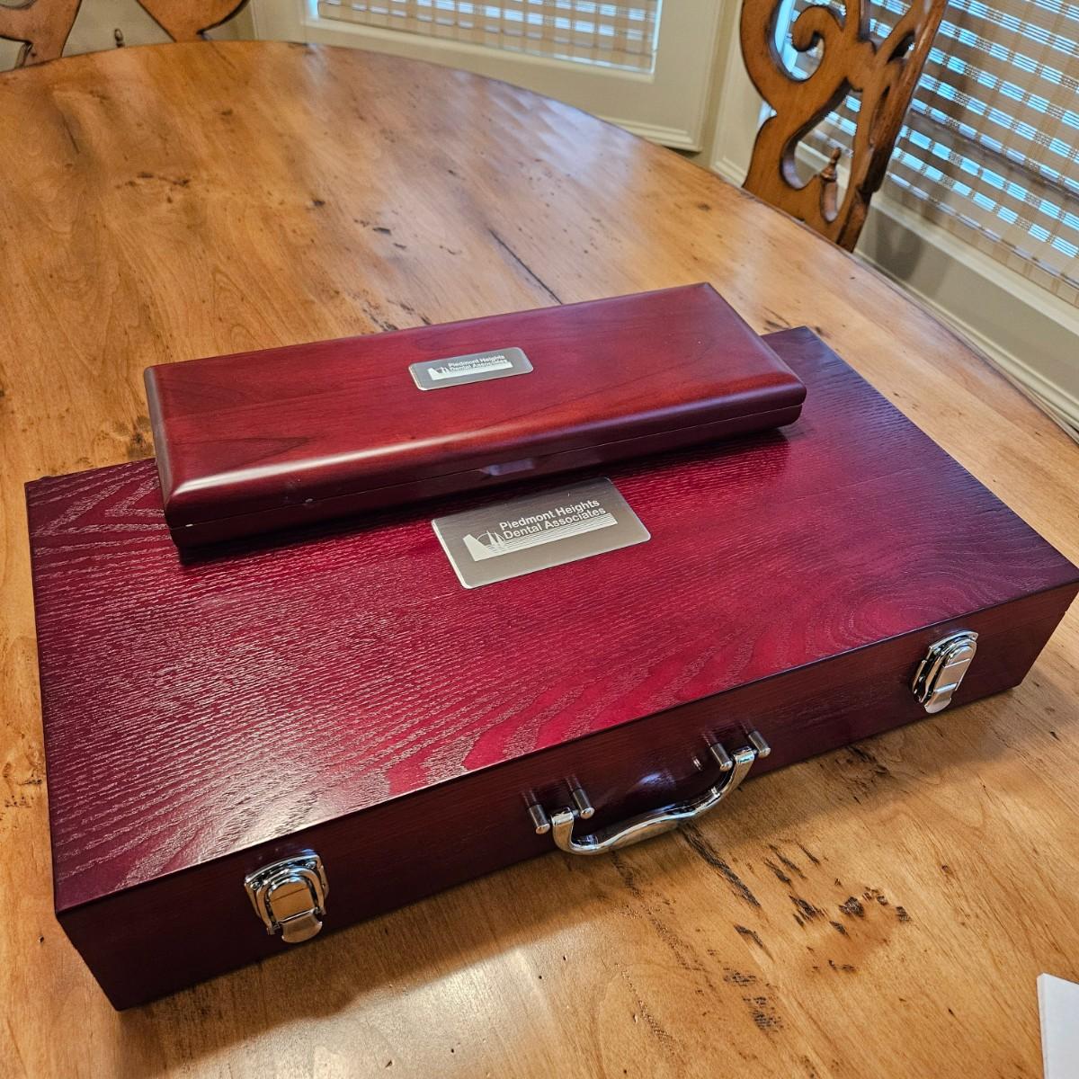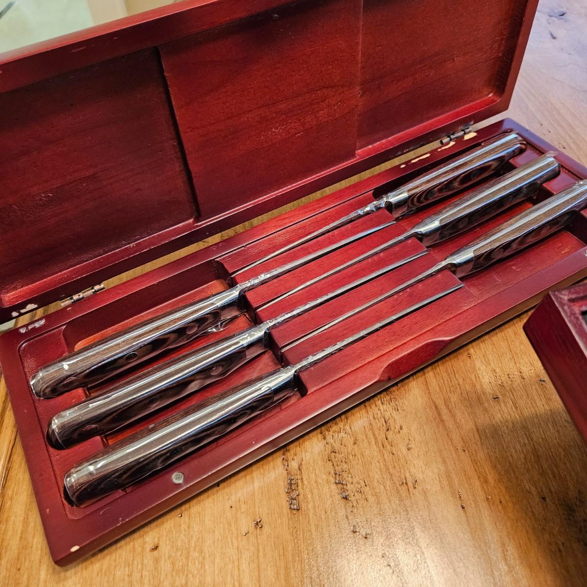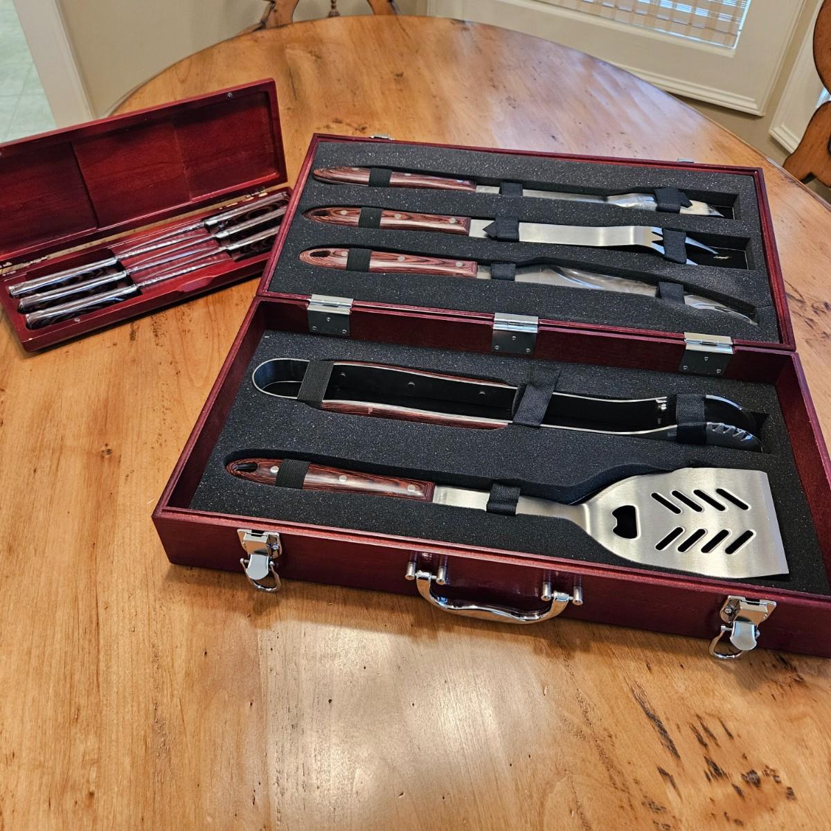 A grill set and steak knives with what appears to be Rosewood handles. Both sets come with storage boxes with a plaque that says Piedmont Heights Dental Associates. Neither set appears to have been used. The largest box measures approximately 21" x 11.5" x 4". Shipping available