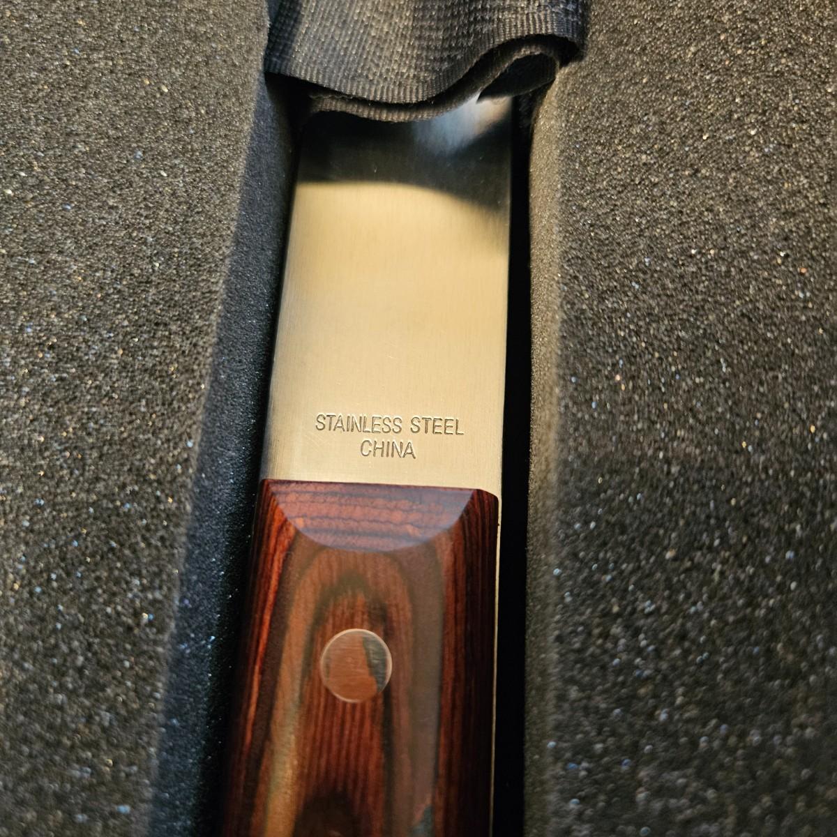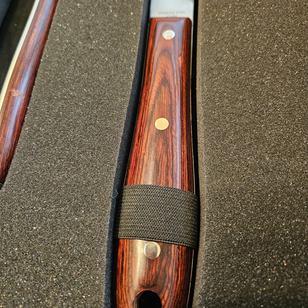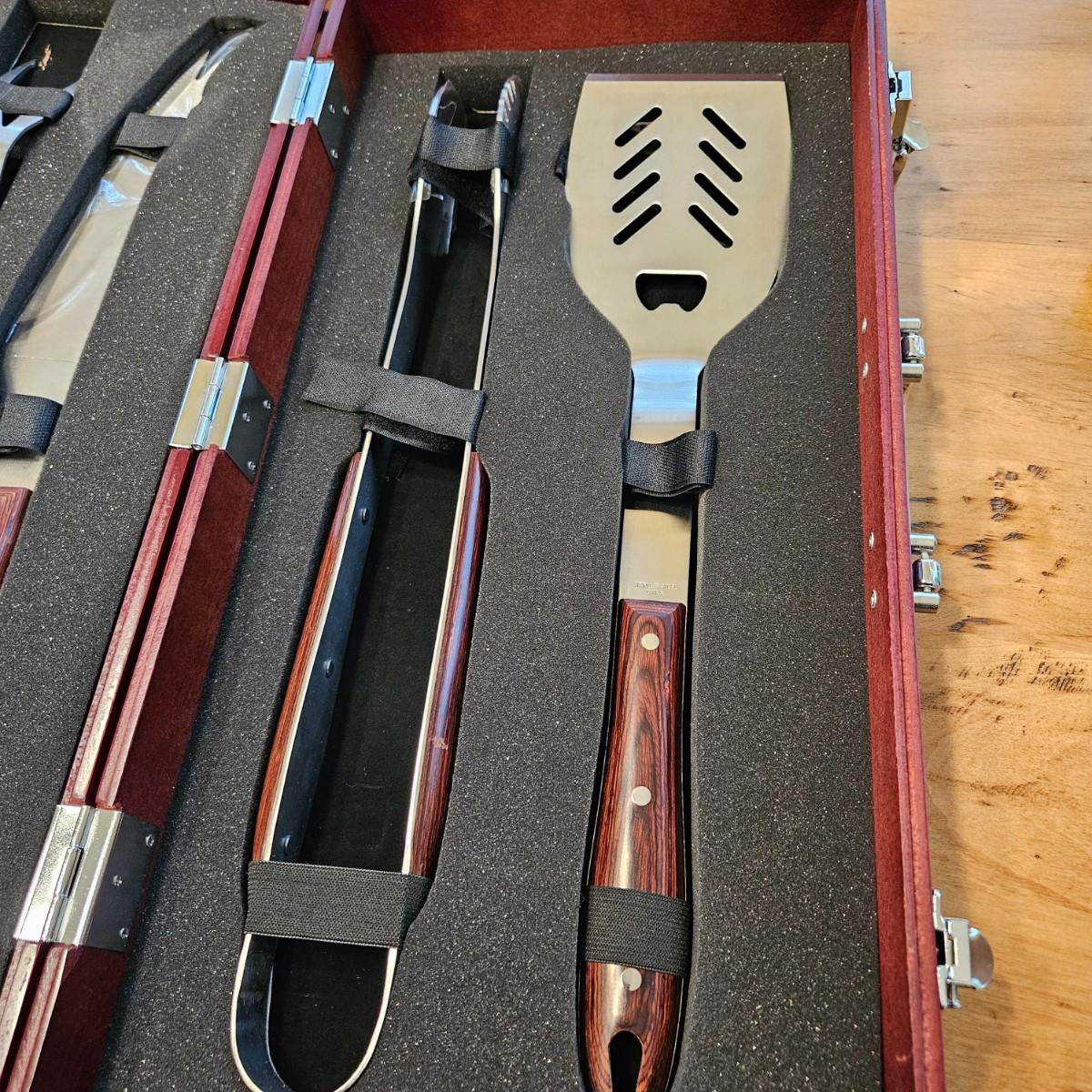 A grill set and steak knives with what appears to be Rosewood handles. Both sets come with storage boxes with a plaque that says Piedmont Heights Dental Associates. Neither set appears to have been used. The largest box measures approximately 21" x 11.5" x 4". Shipping available