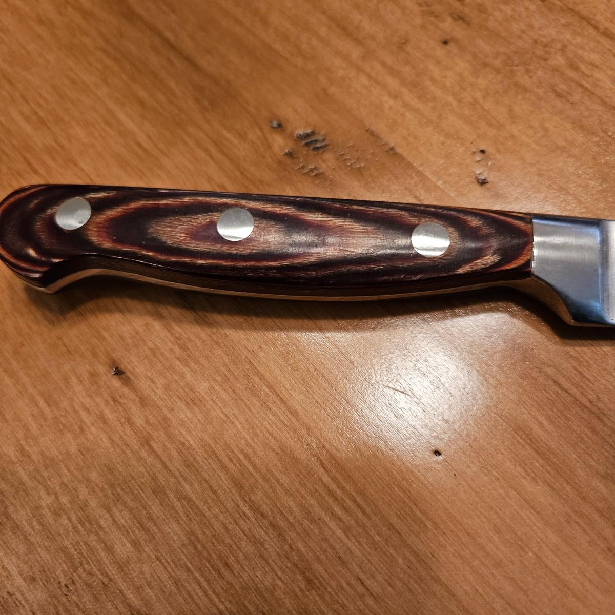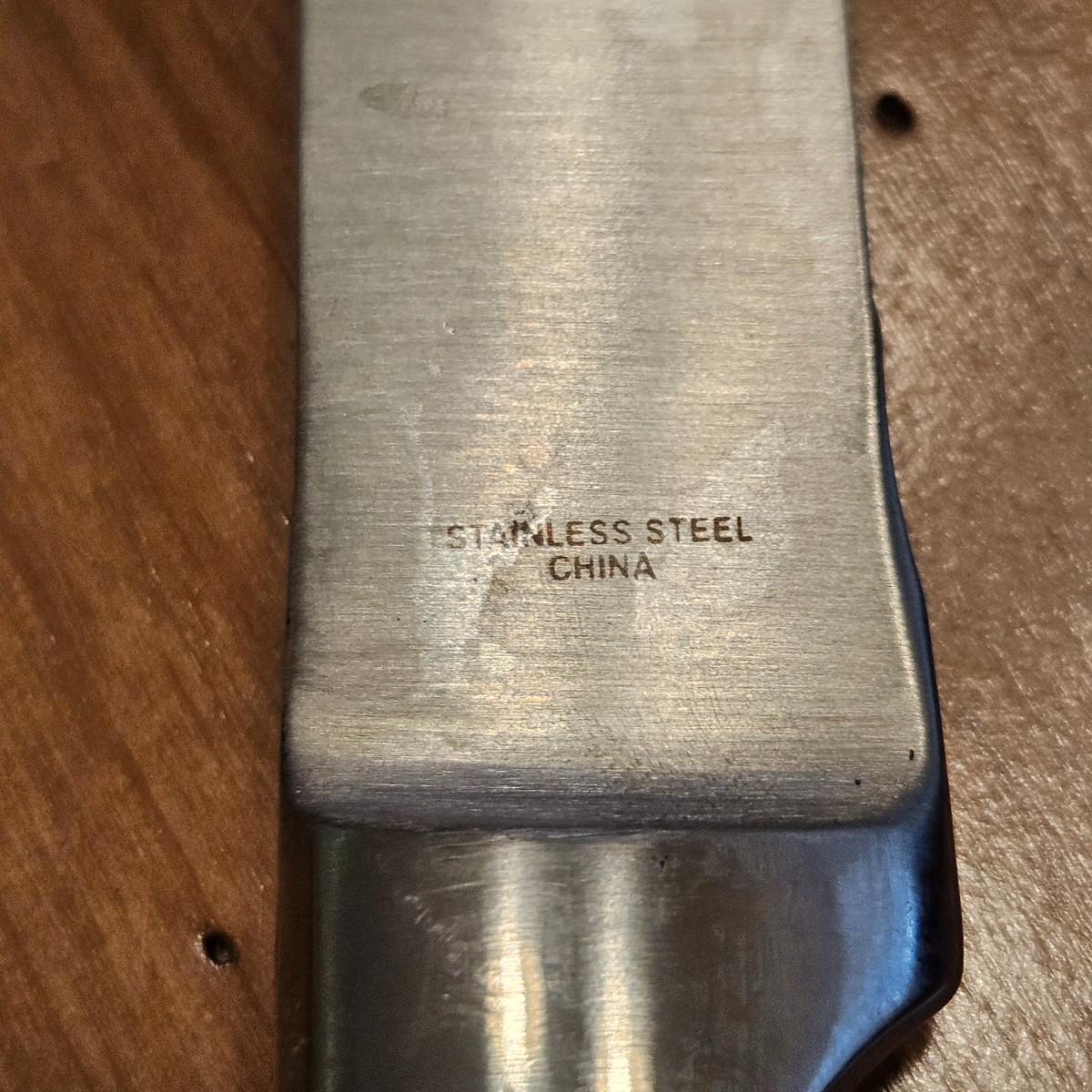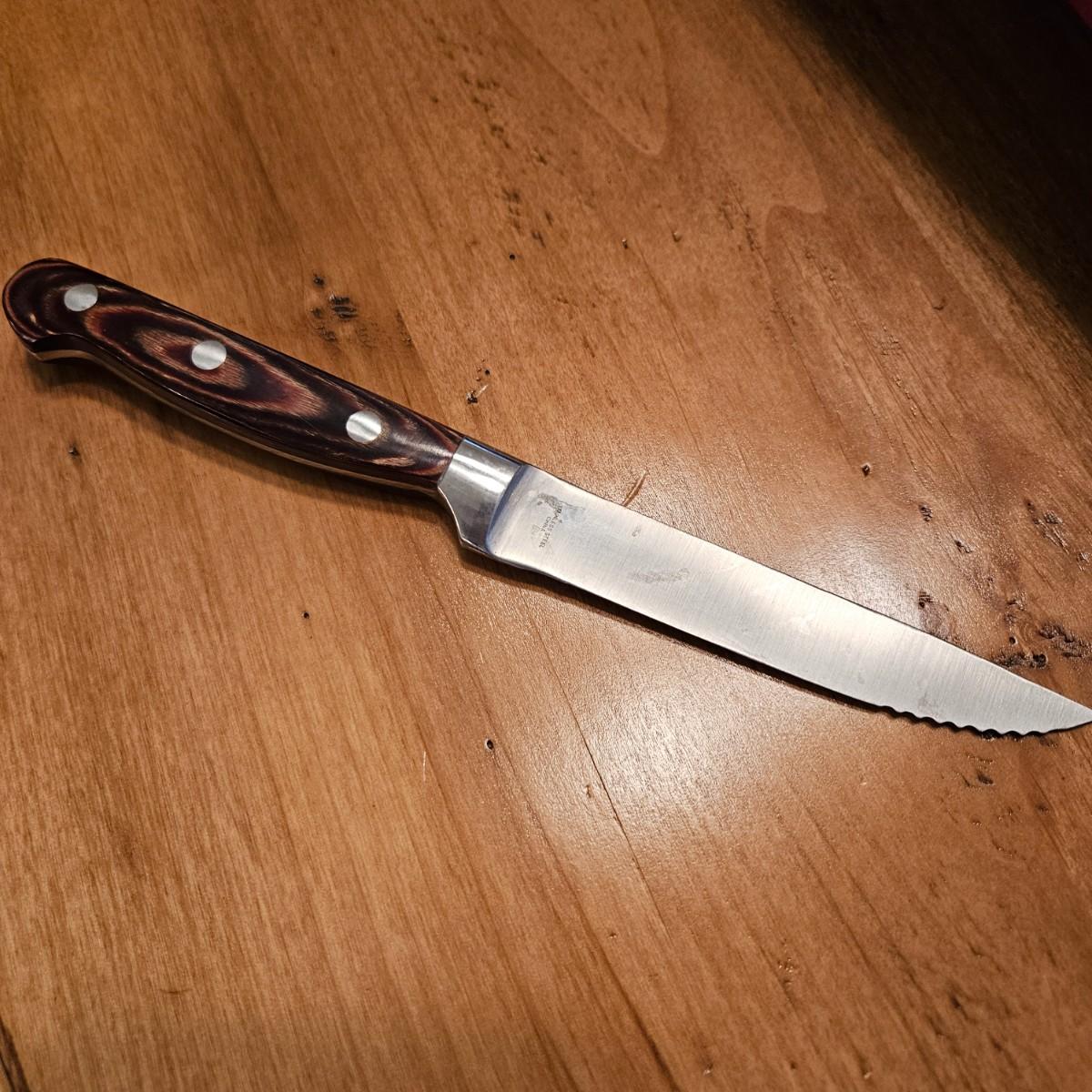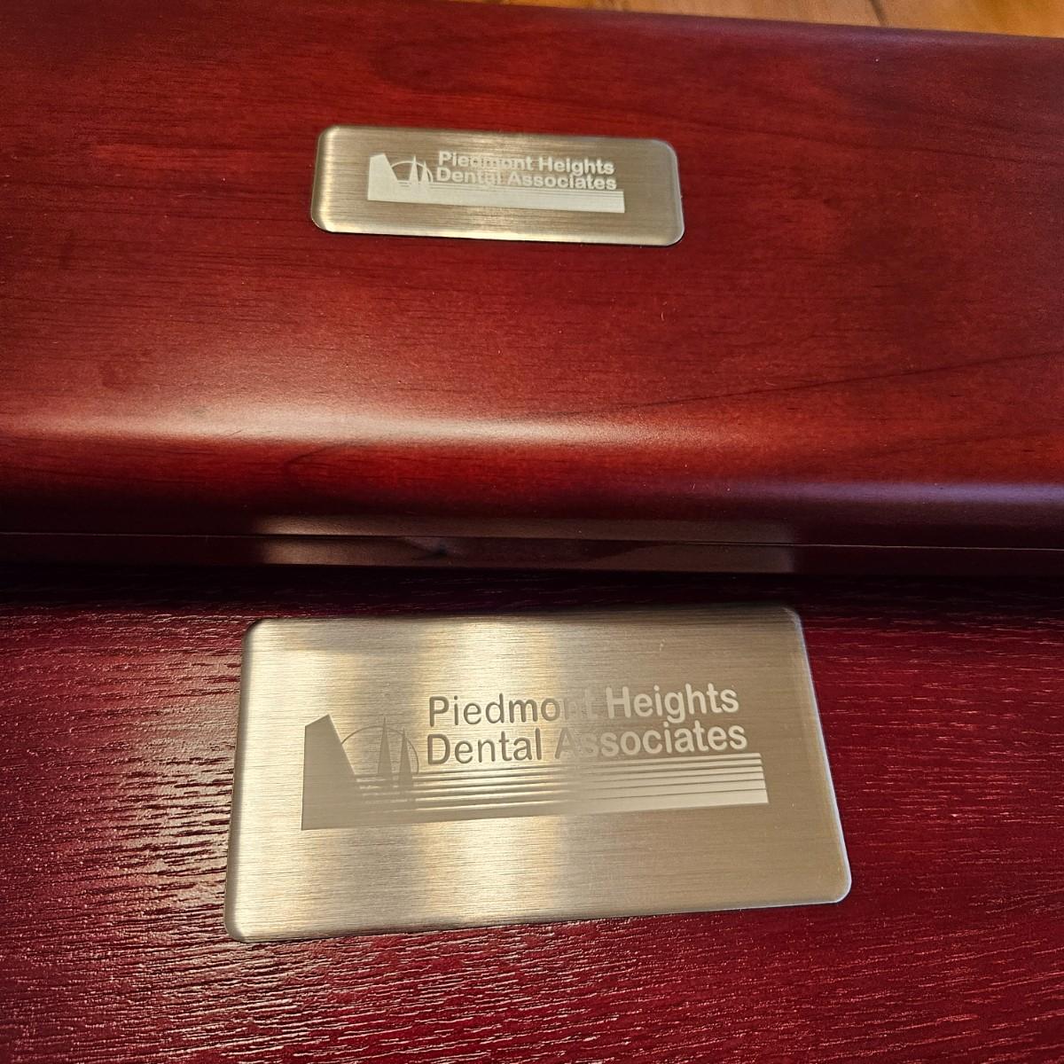 A grill set and steak knives with what appears to be Rosewood handles. Both sets come with storage boxes with a plaque that says Piedmont Heights Dental Associates. Neither set appears to have been used. The largest box measures approximately 21" x 11.5" x 4". Shipping available
