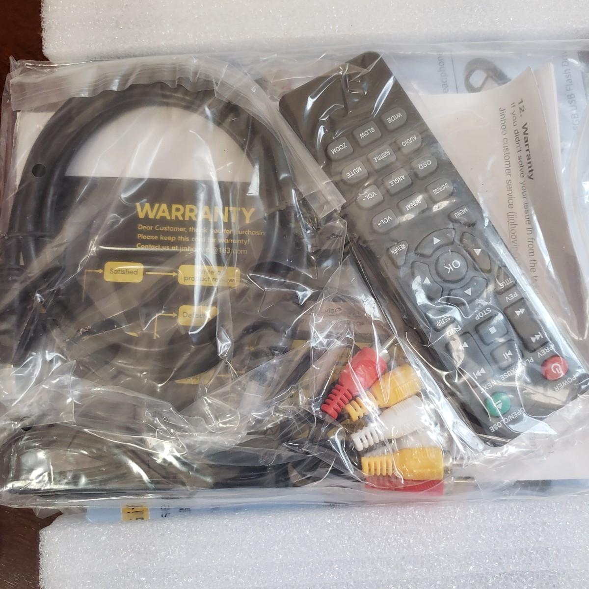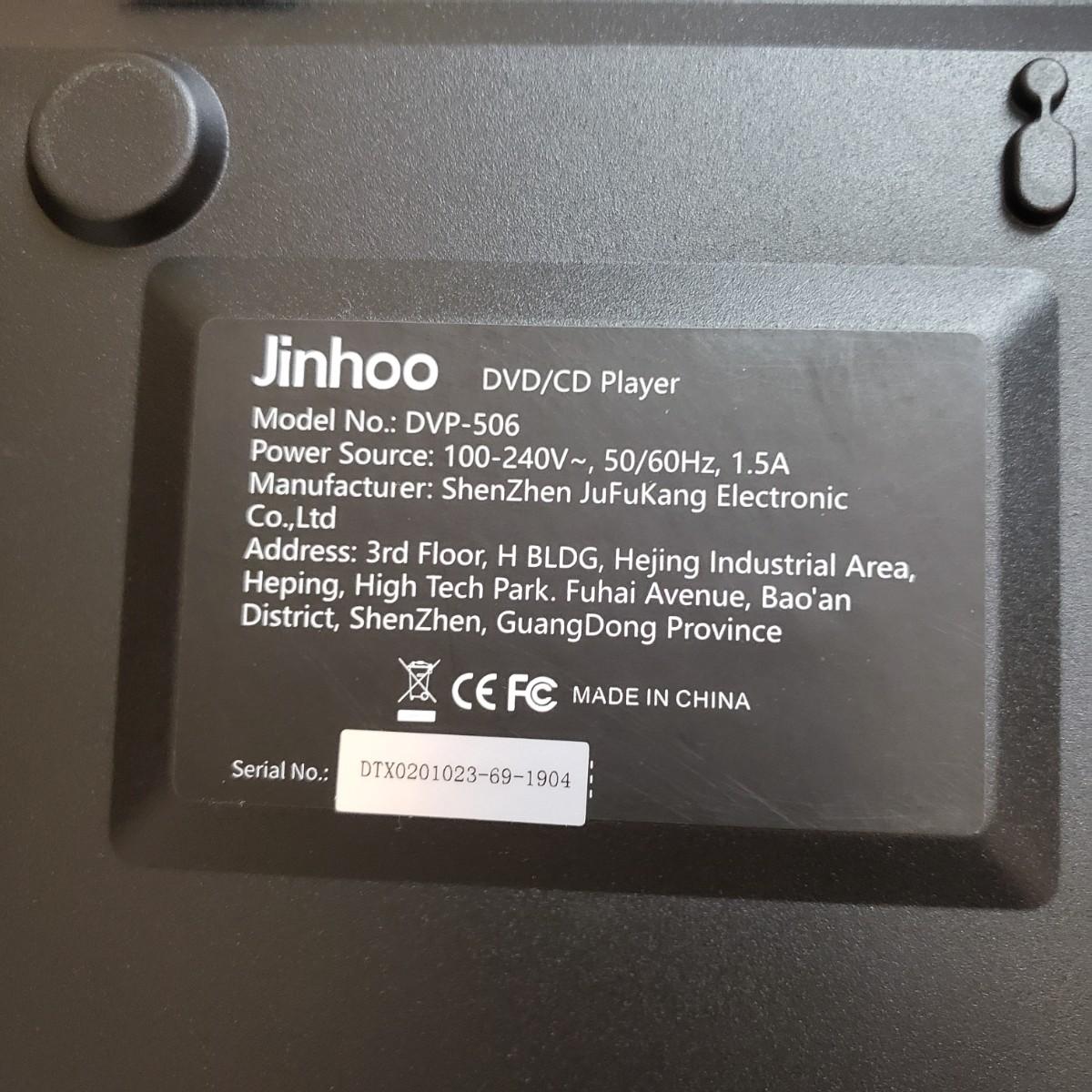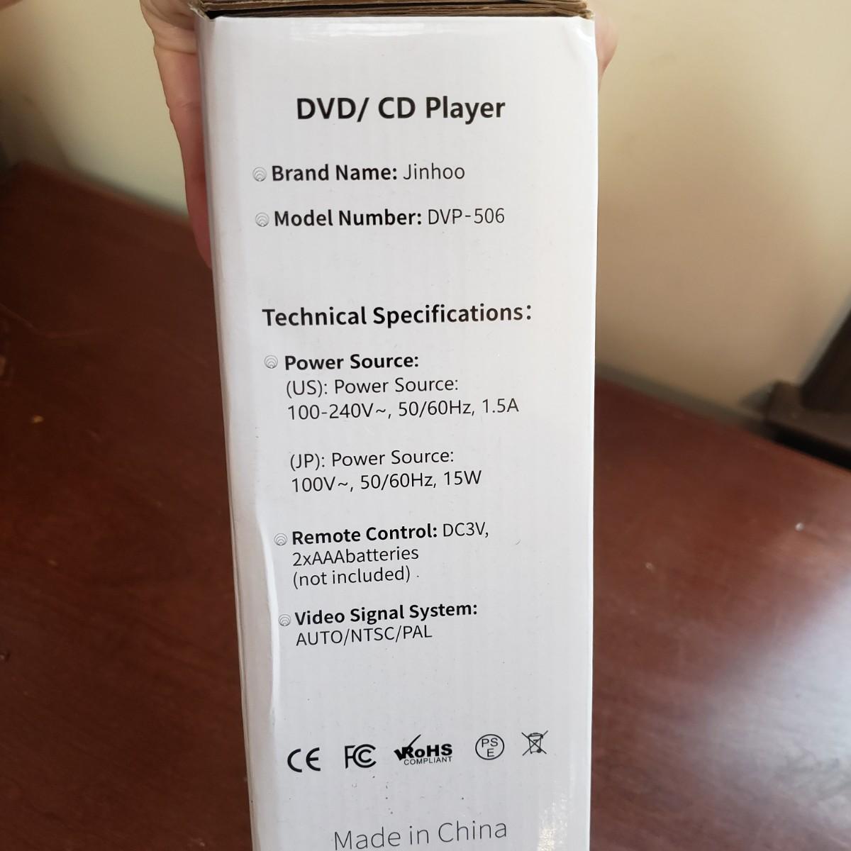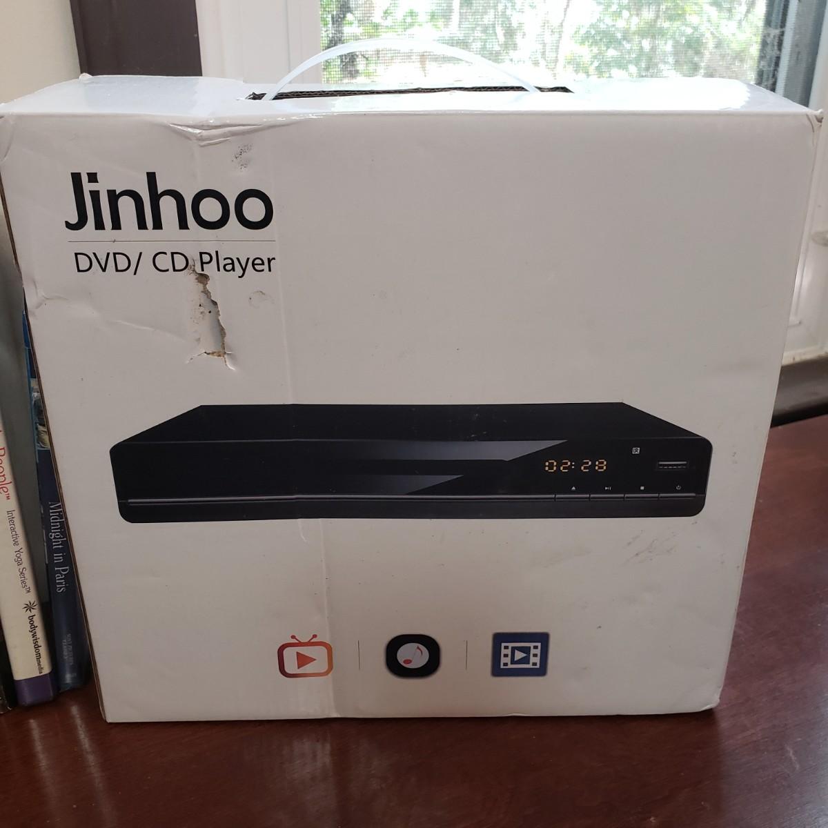 This NIB Jinhoo DVD/CD player powers on when plugged in, see picture. The player comes with red/yellow cords, as well as a remote. Also included are various DVDs, see pictures for titles.