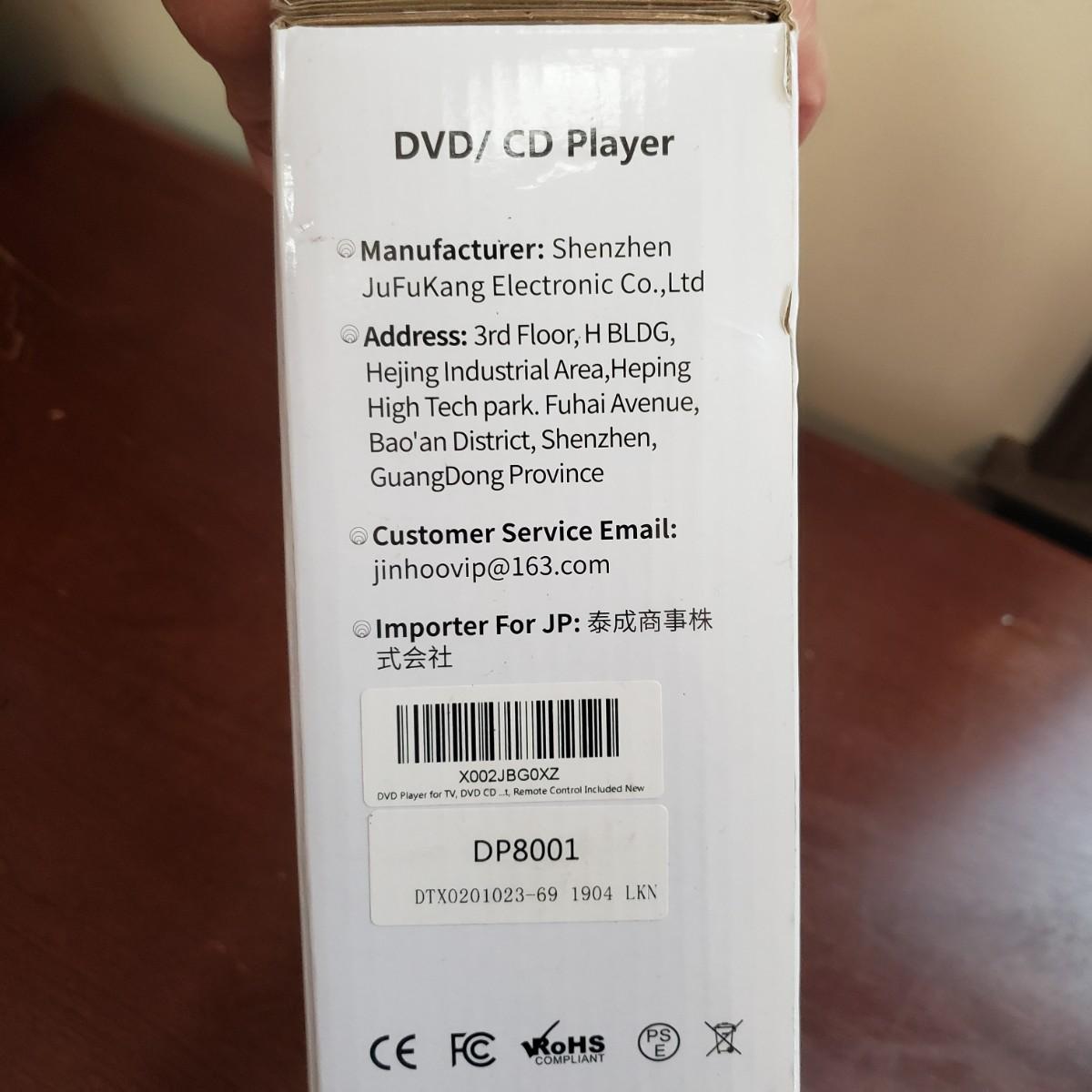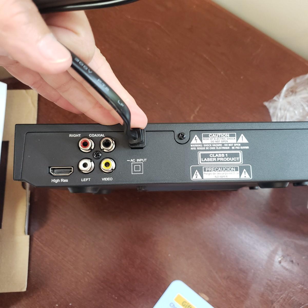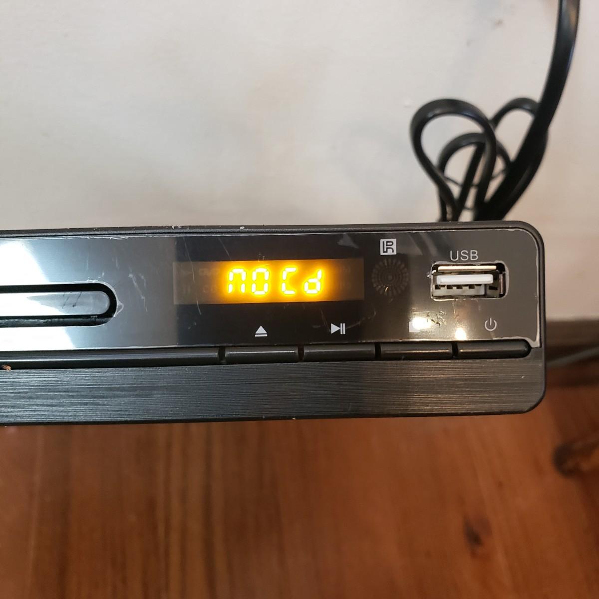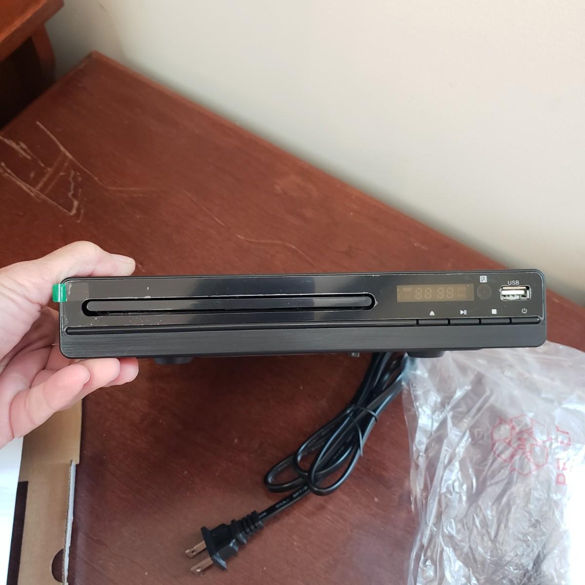 This NIB Jinhoo DVD/CD player powers on when plugged in, see picture. The player comes with red/yellow cords, as well as a remote. Also included are various DVDs, see pictures for titles.