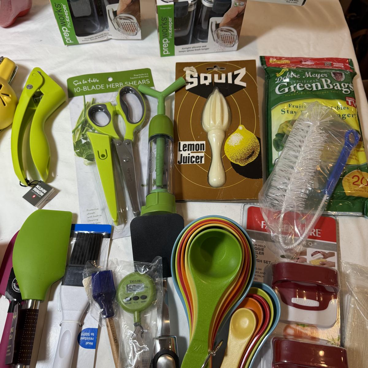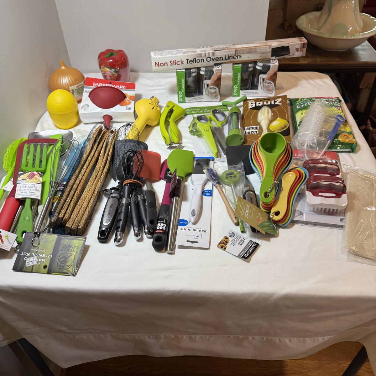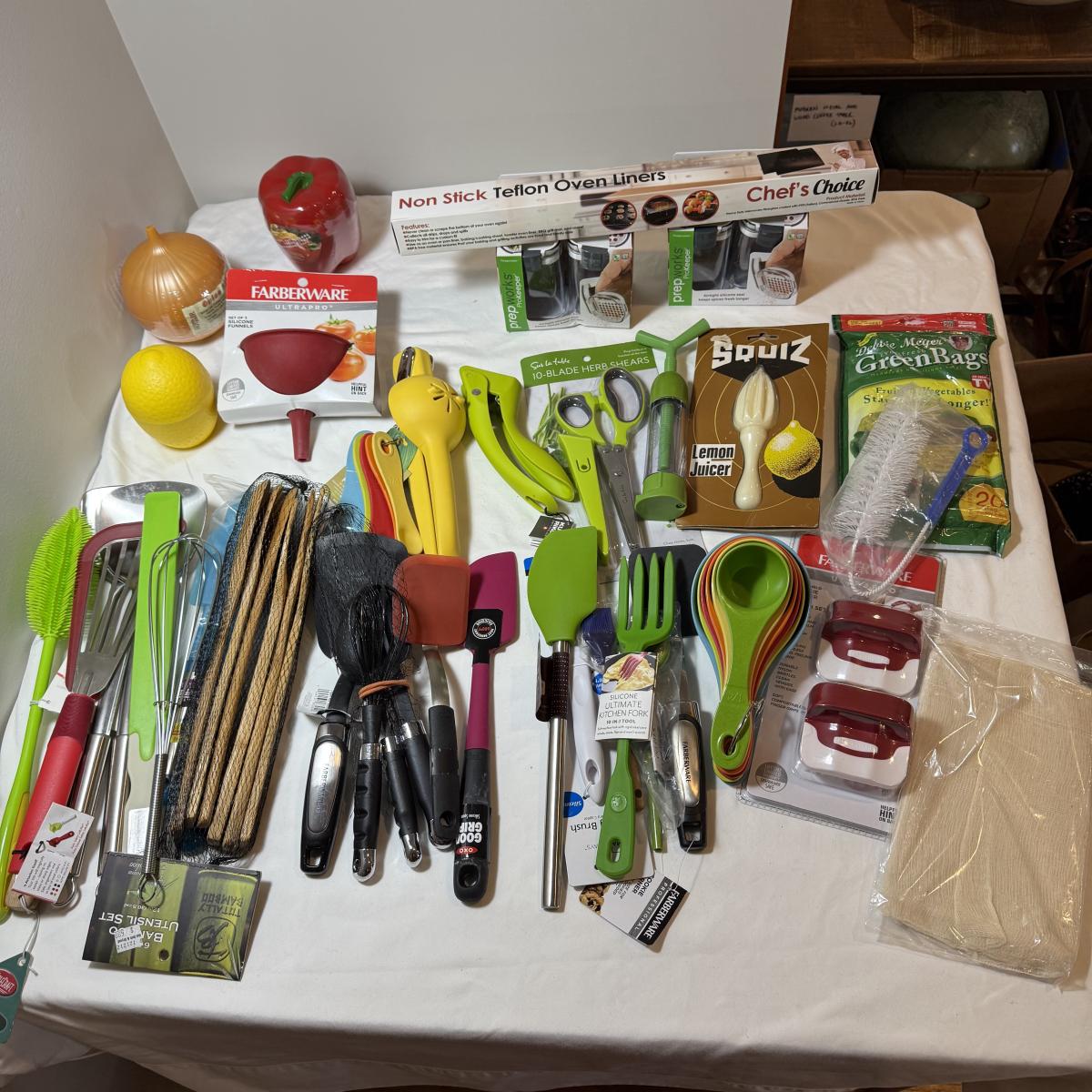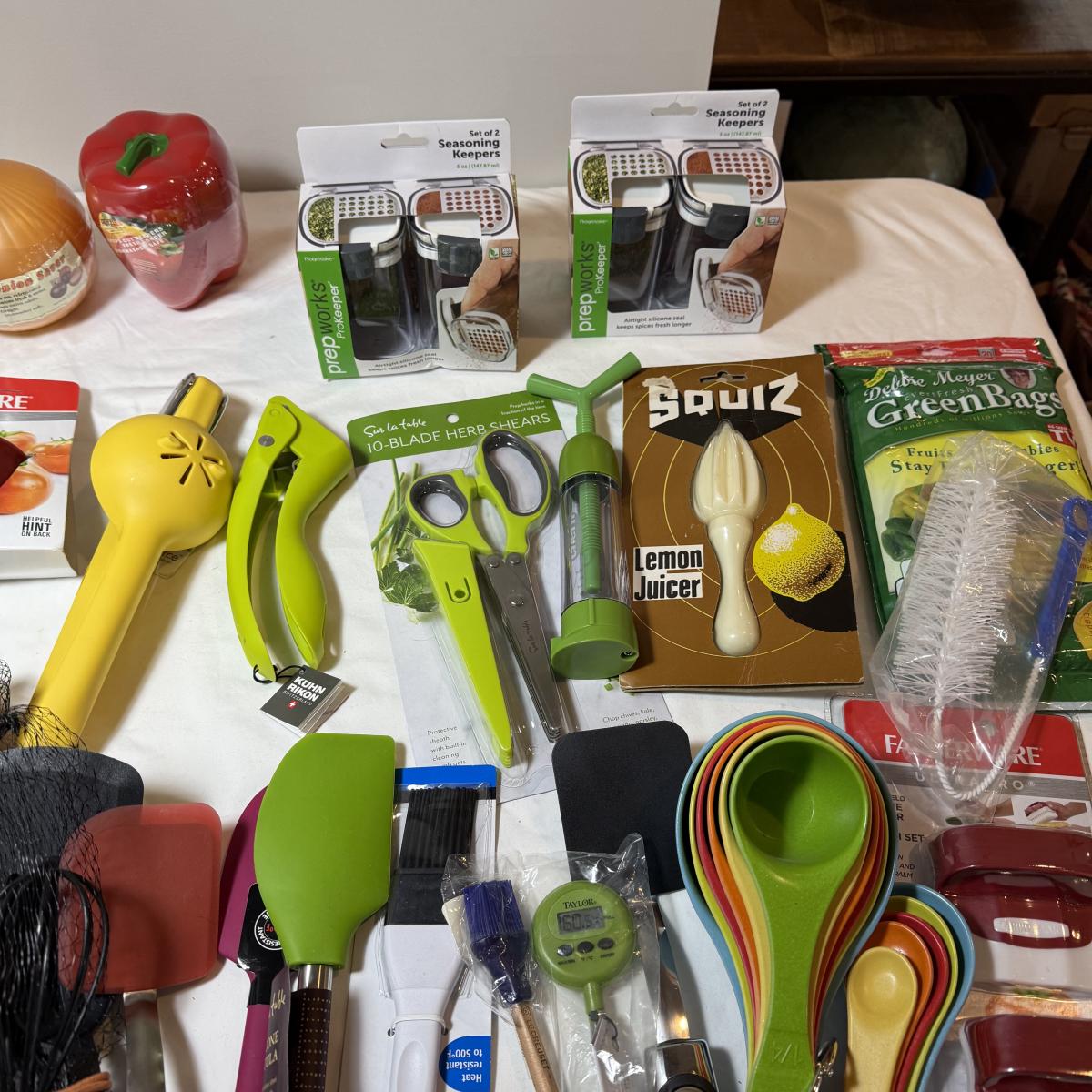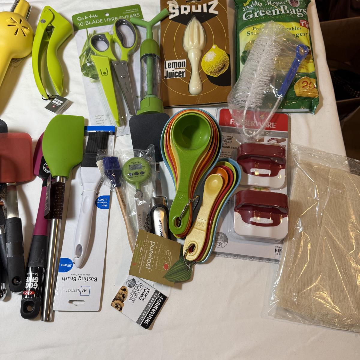 This is a huge lot that contains loads of what appears to be “new in box” kitchen utensils, gadgets and measuring cups. Included are fruit/veggie storage containers, several different styles of spatulas, and spoons, measuring cups, spoons, spice containers, funnels, juicer and more. Items are an assortment of wooden, metal, silicone, and plastic materials. See pictures for details. Shipping available.