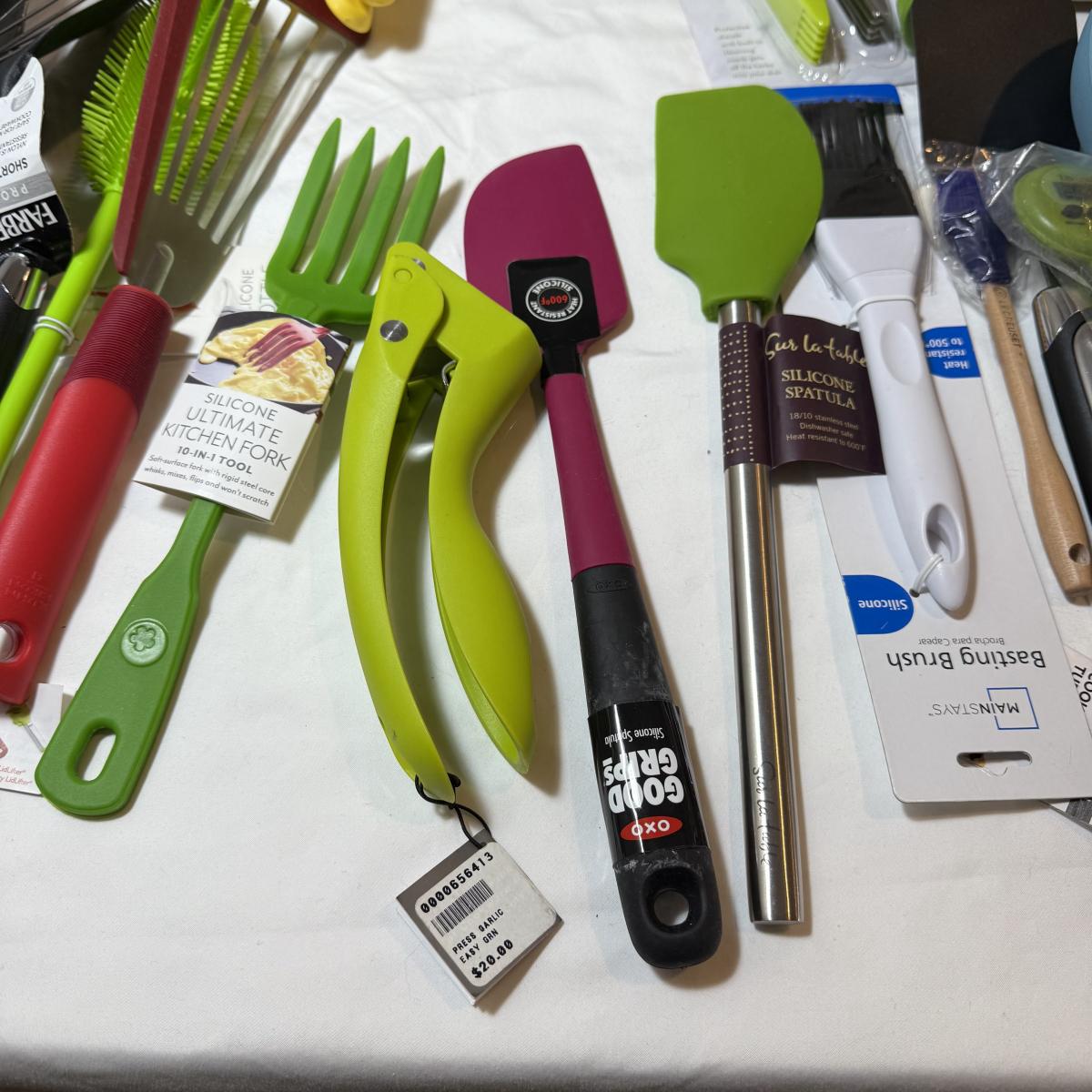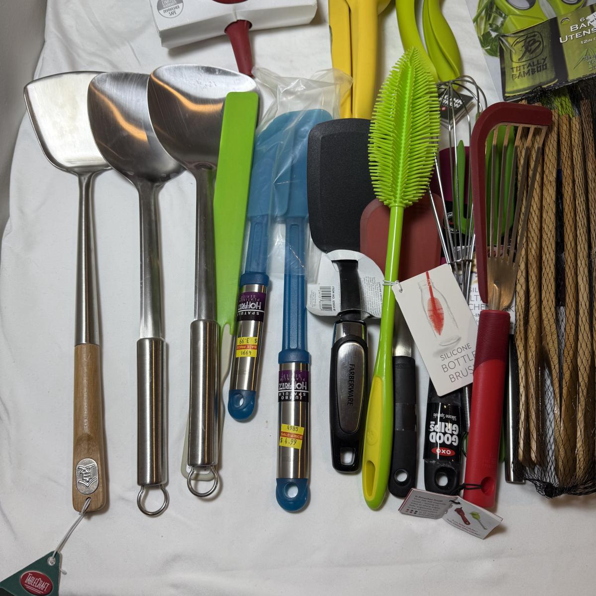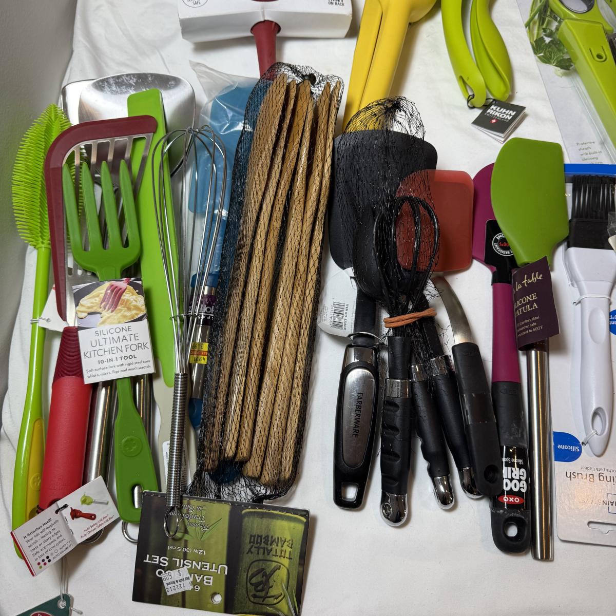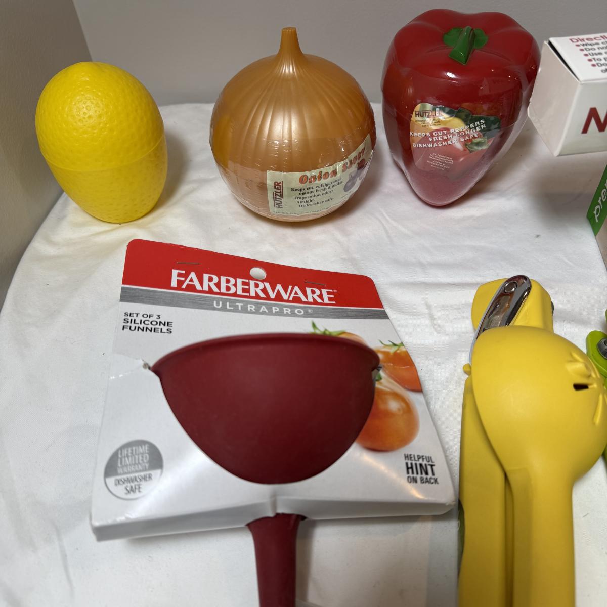 This is a huge lot that contains loads of what appears to be “new in box” kitchen utensils, gadgets and measuring cups. Included are fruit/veggie storage containers, several different styles of spatulas, and spoons, measuring cups, spoons, spice containers, funnels, juicer and more. Items are an assortment of wooden, metal, silicone, and plastic materials. See pictures for details. Shipping available.