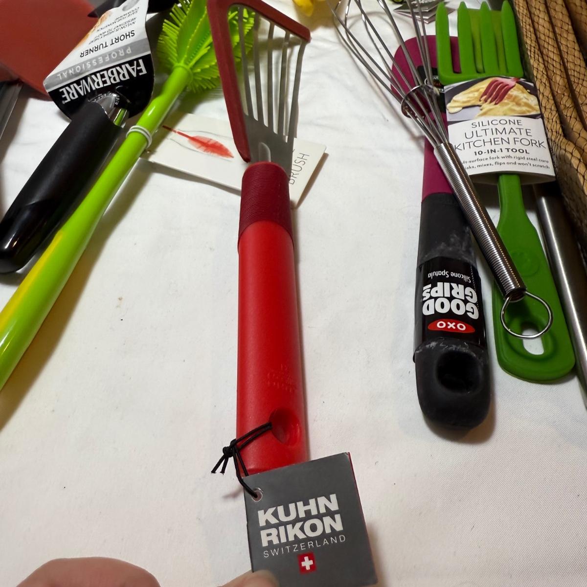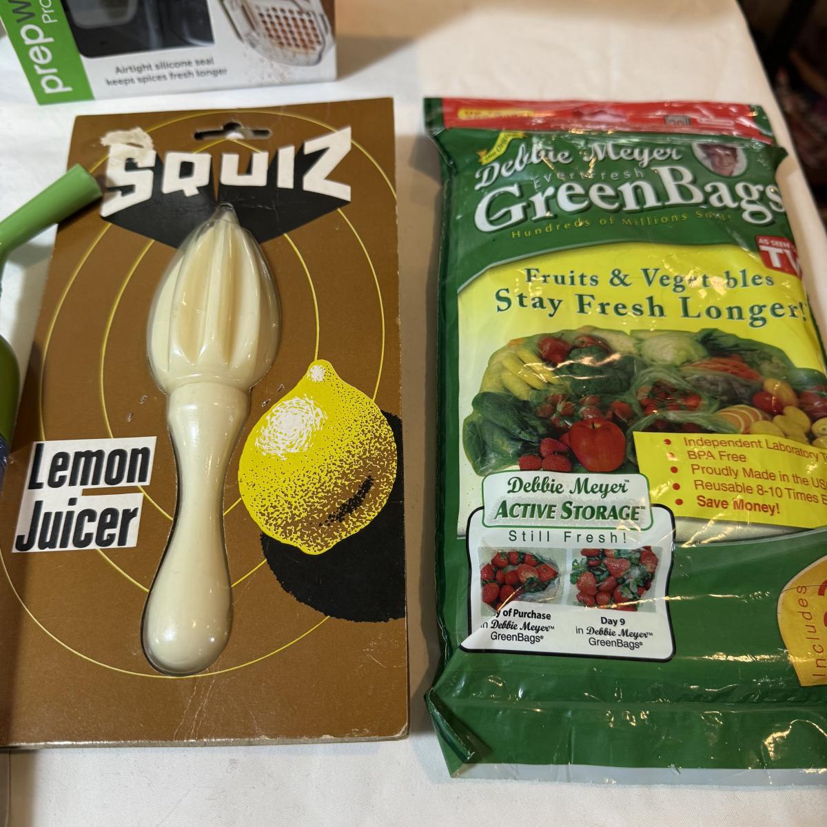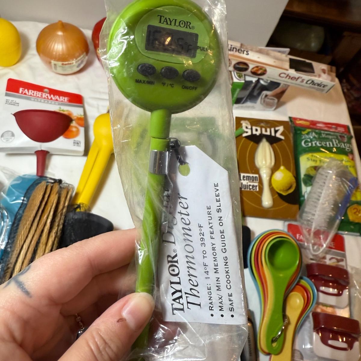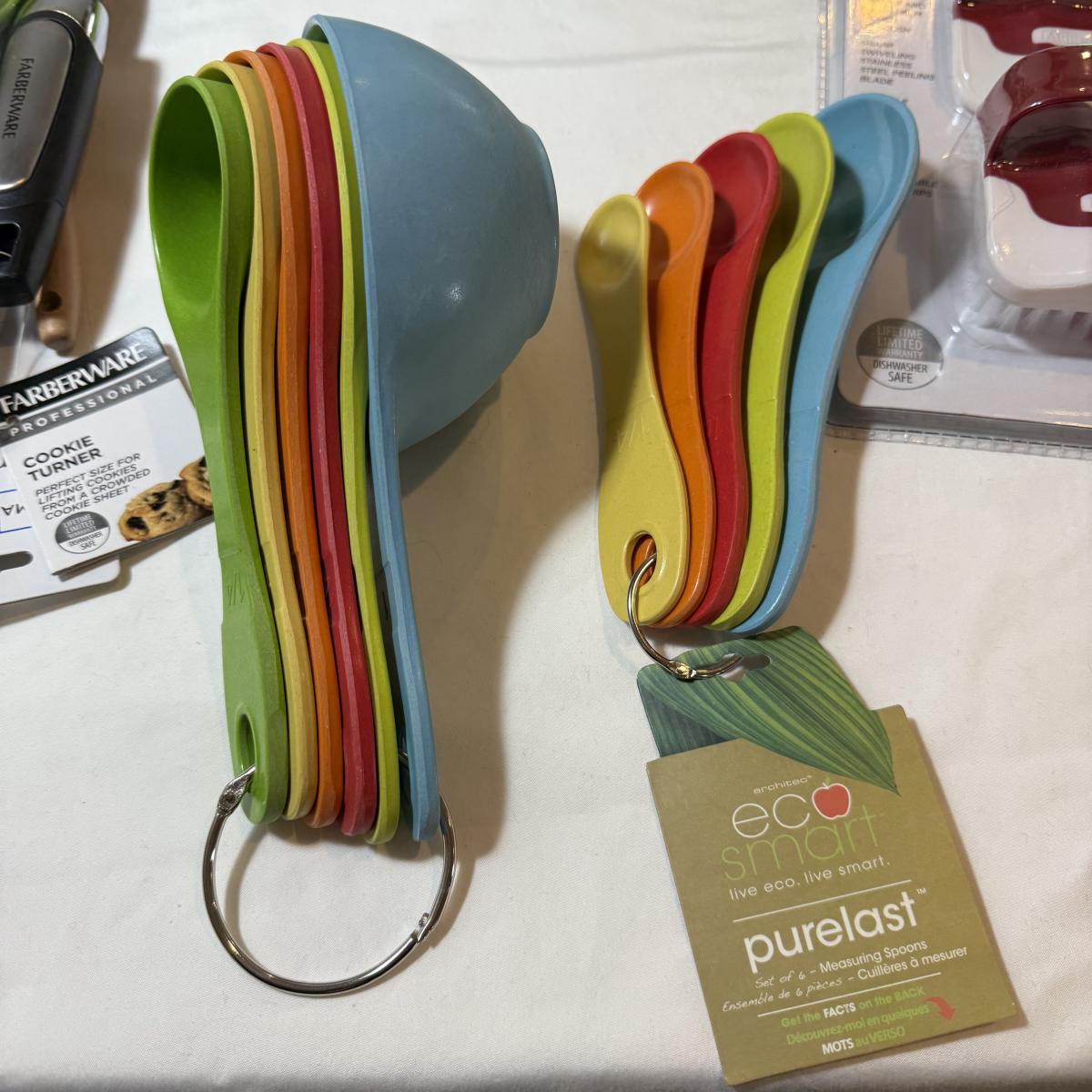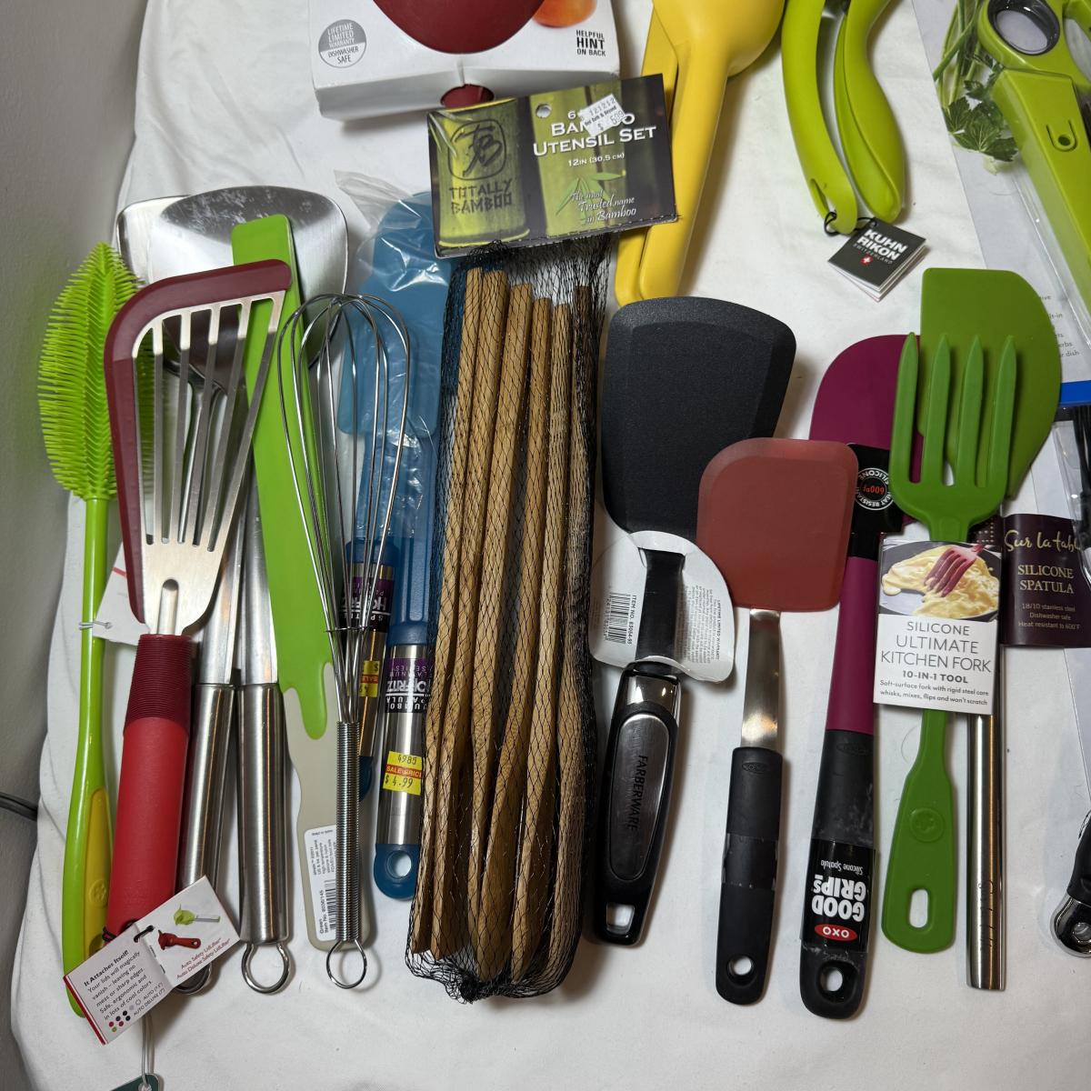 This is a huge lot that contains loads of what appears to be “new in box” kitchen utensils, gadgets and measuring cups. Included are fruit/veggie storage containers, several different styles of spatulas, and spoons, measuring cups, spoons, spice containers, funnels, juicer and more. Items are an assortment of wooden, metal, silicone, and plastic materials. See pictures for details. Shipping available.