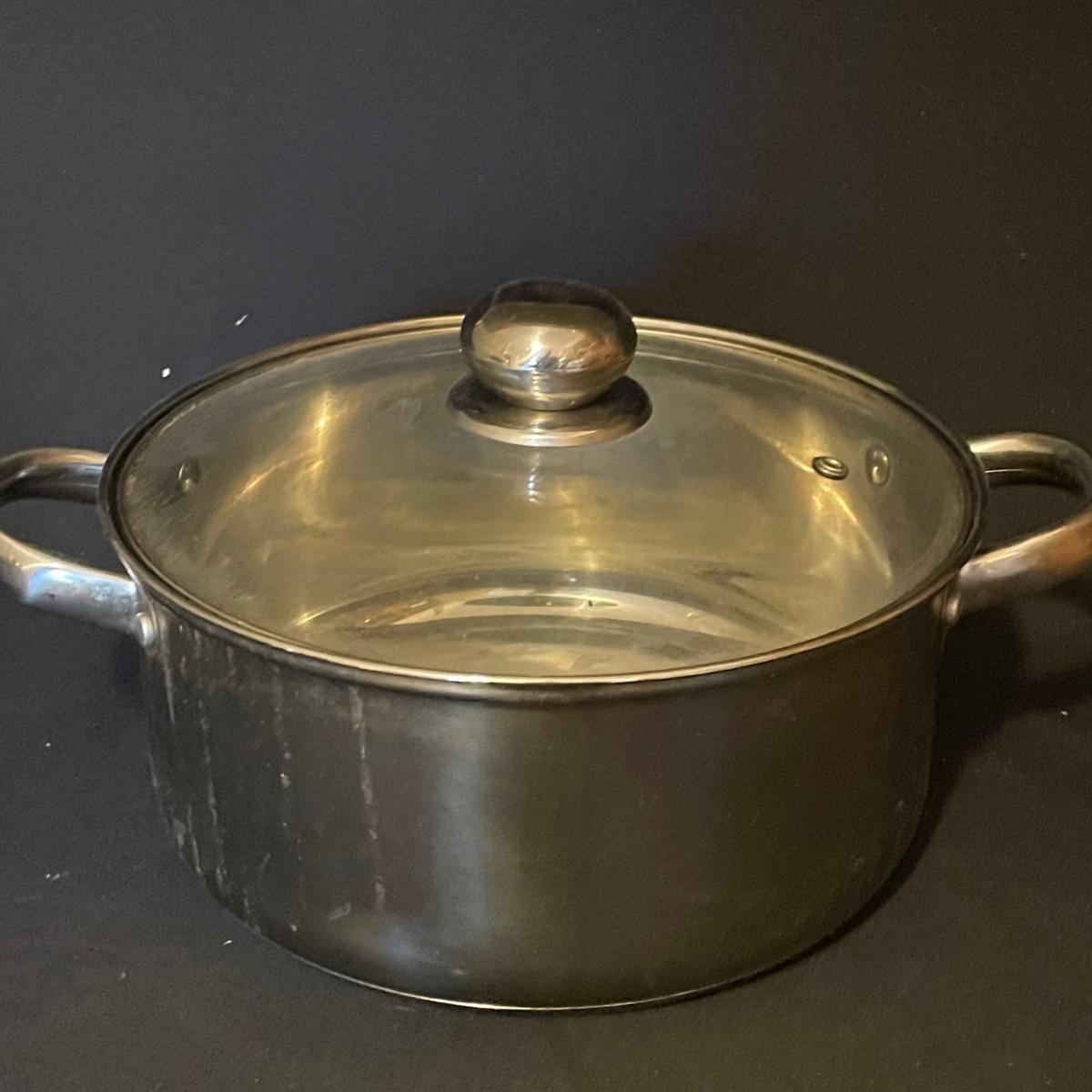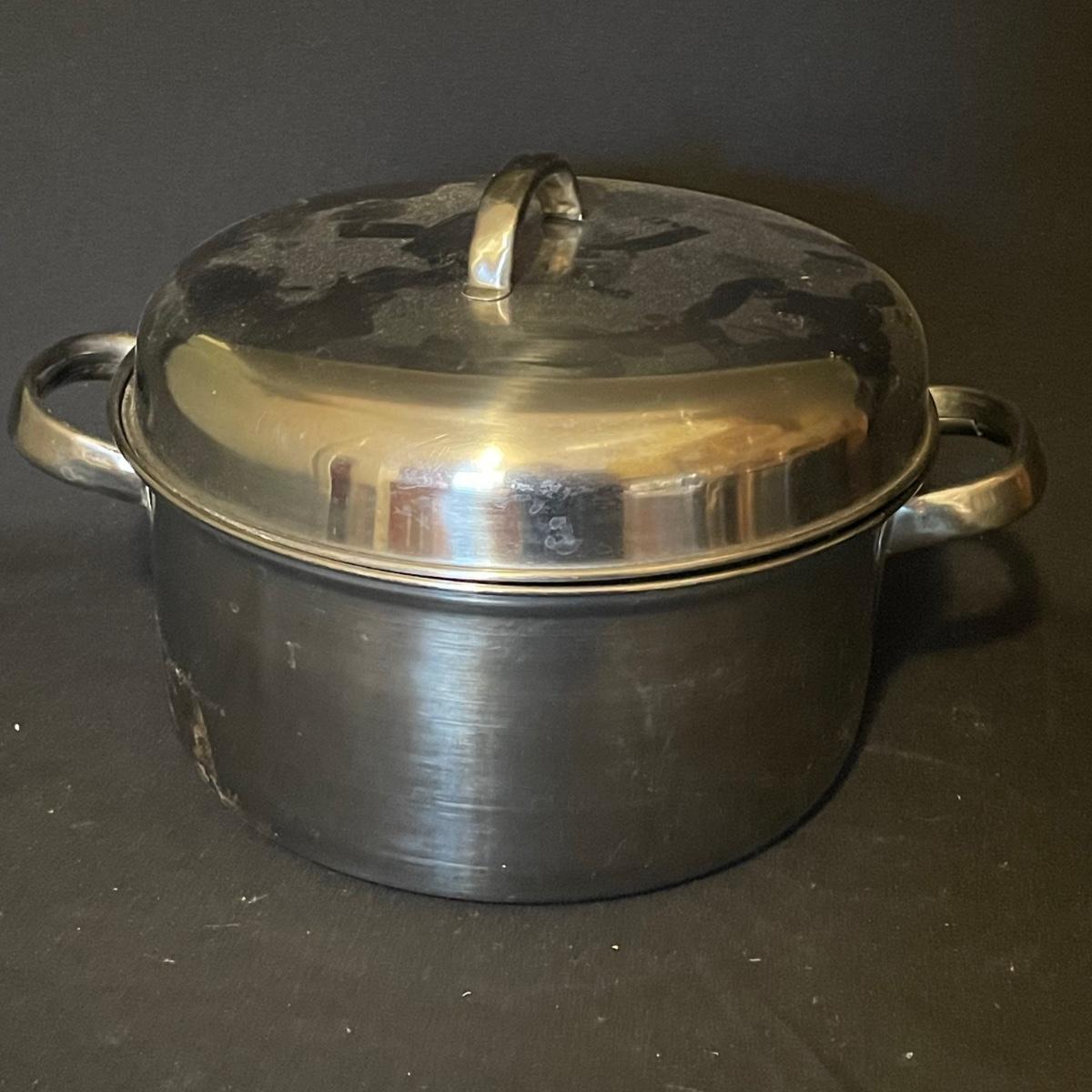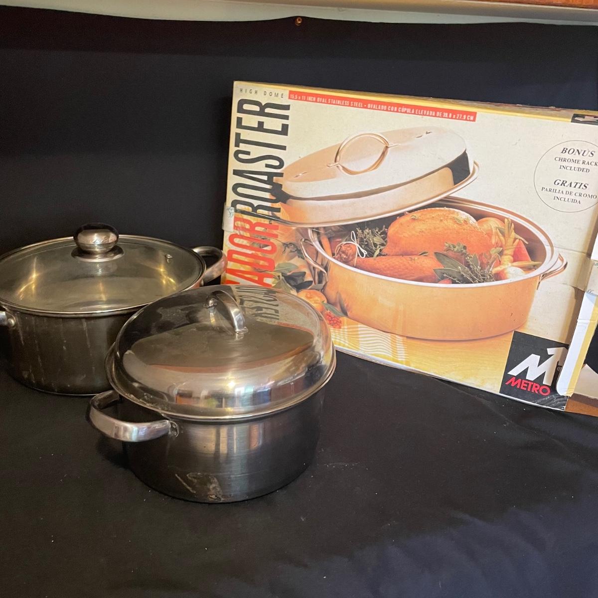 This large Metro roasting pan that is new in box holds up to 23lbs of roast! Lot also includes two lidded cooking pots that do have some scratches and other blemishes that might not come fully clean, see images.