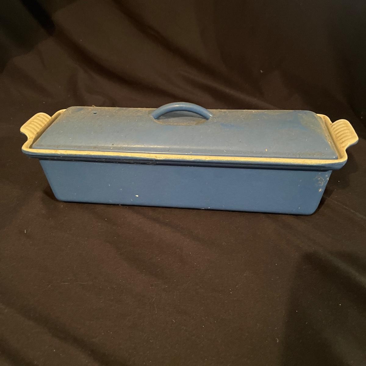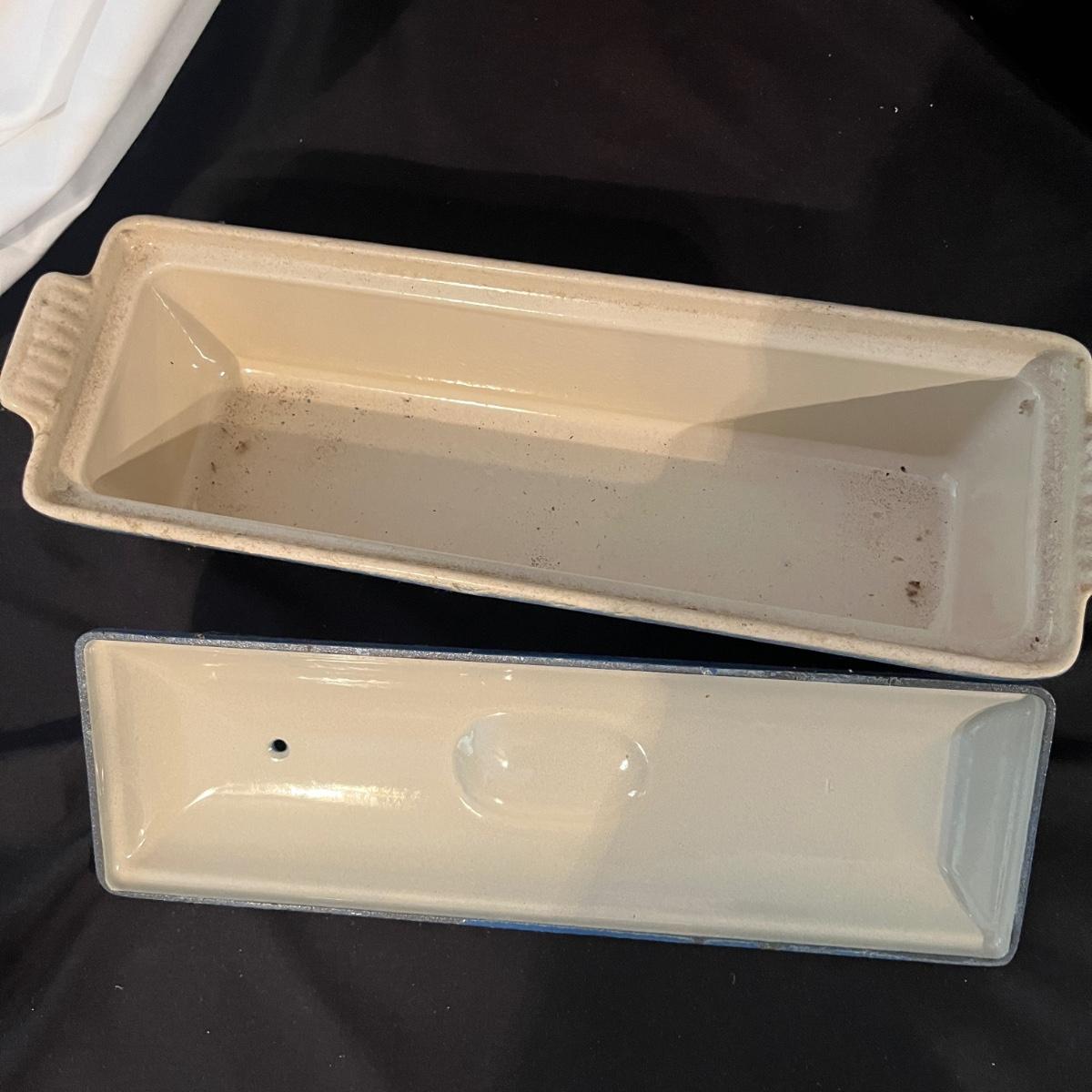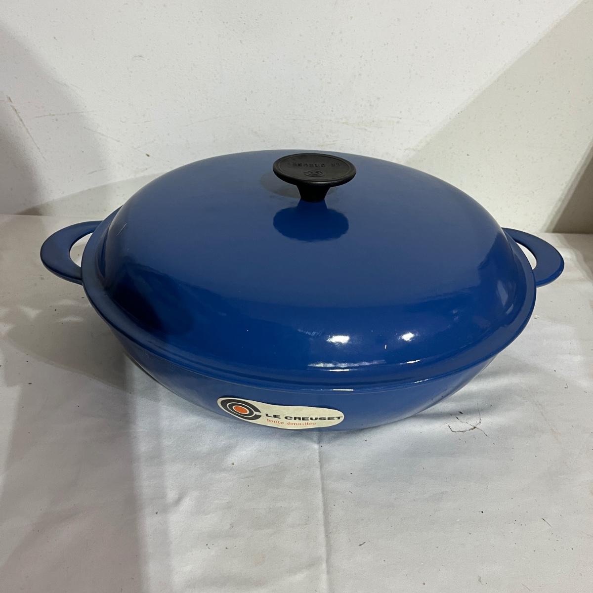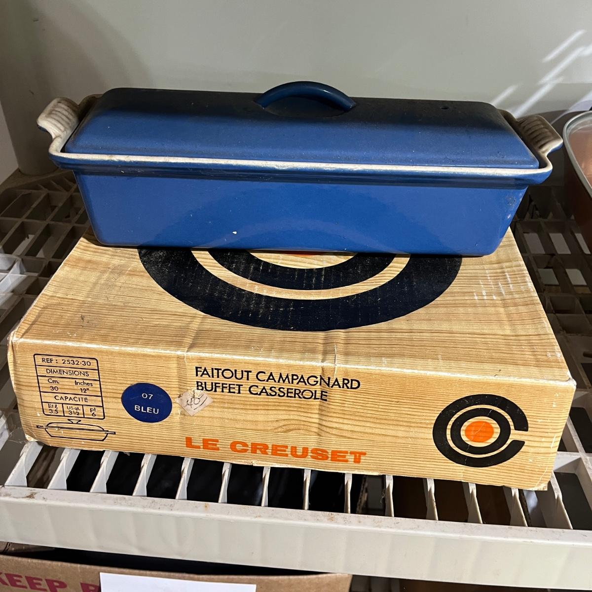 Lot includes a blue Le Creuset cast iron enameled 12”D buffet casserole dish. Item appears to be NIB but the box is dirty. Also includes Le Creuset covered dish.