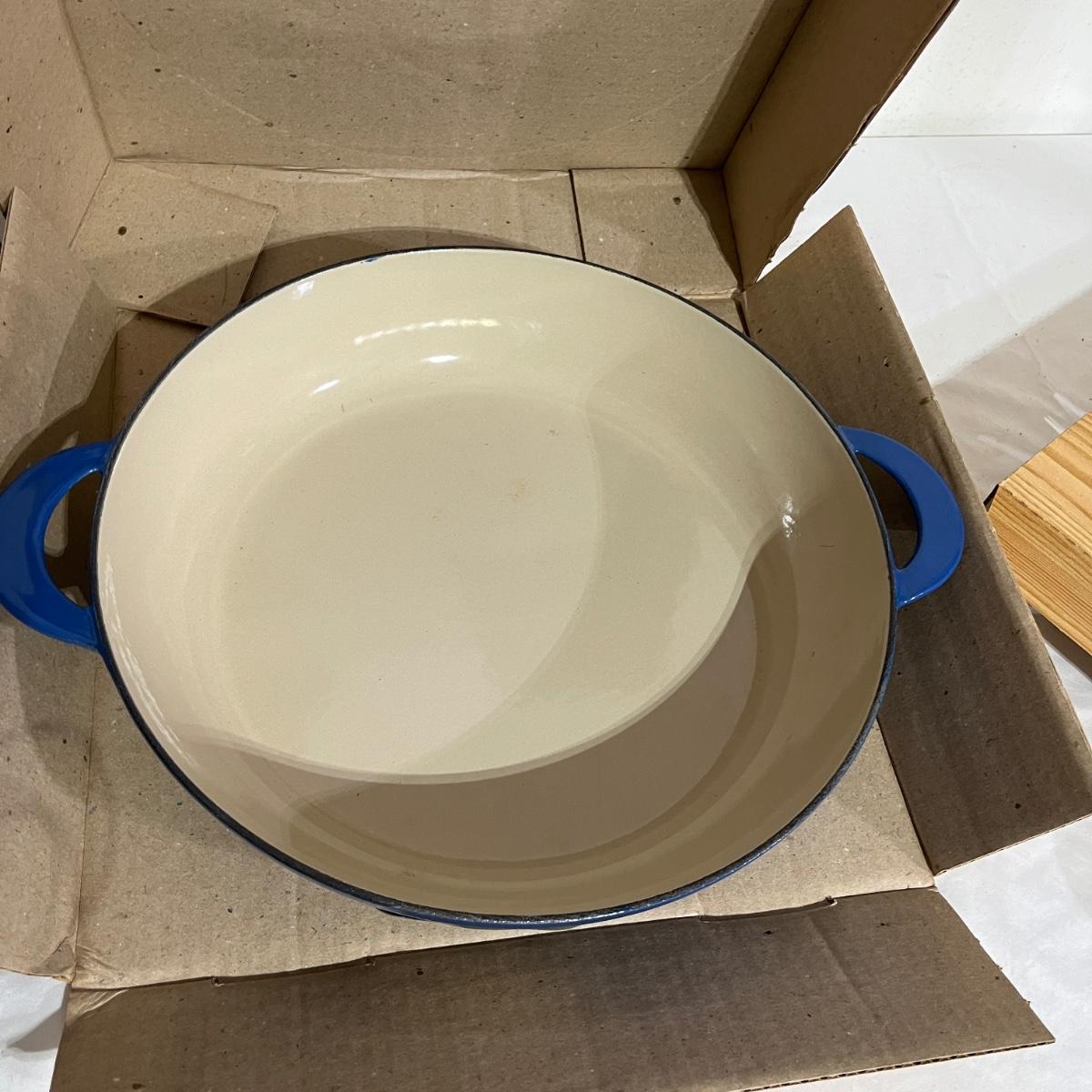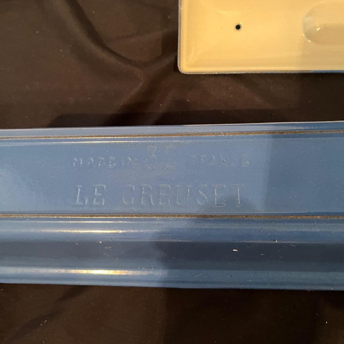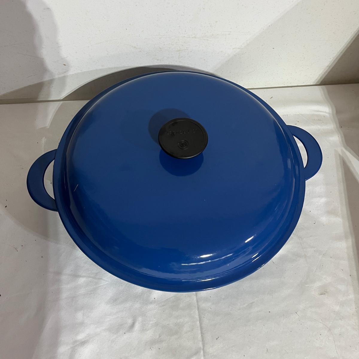 Lot includes a blue Le Creuset cast iron enameled 12”D buffet casserole dish. Item appears to be NIB but the box is dirty. Also includes Le Creuset covered dish.