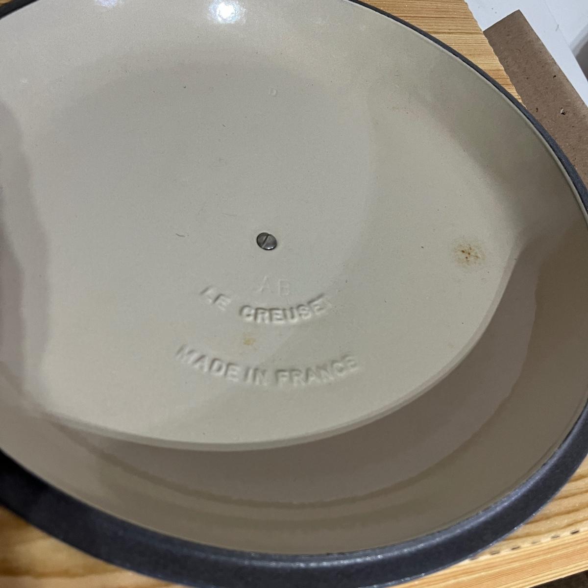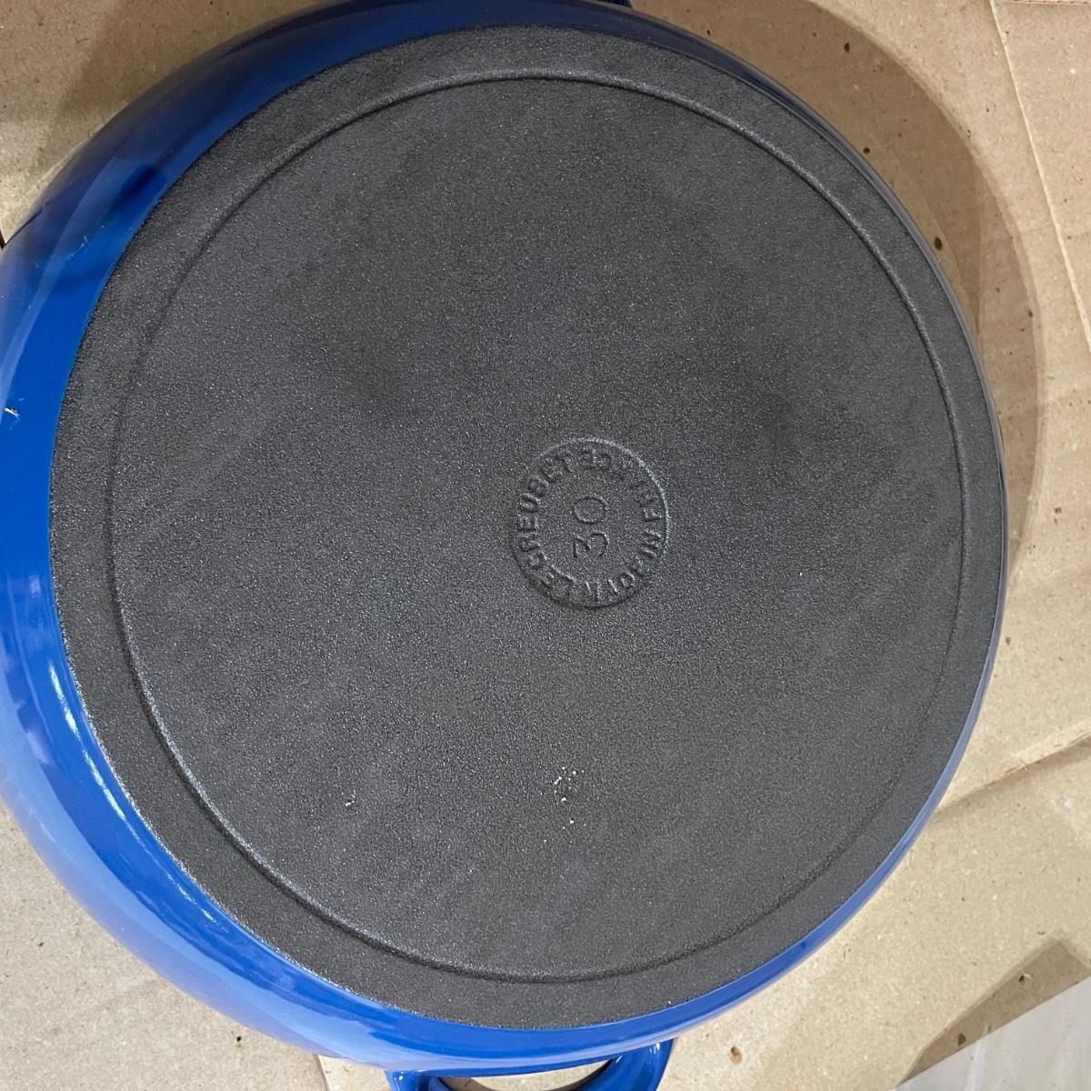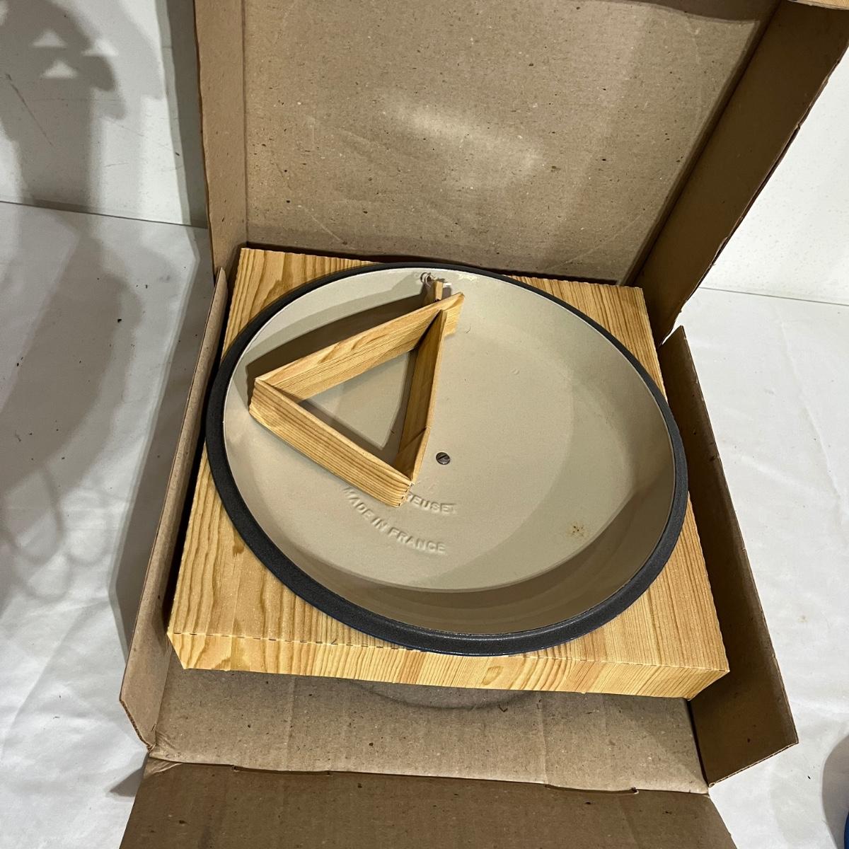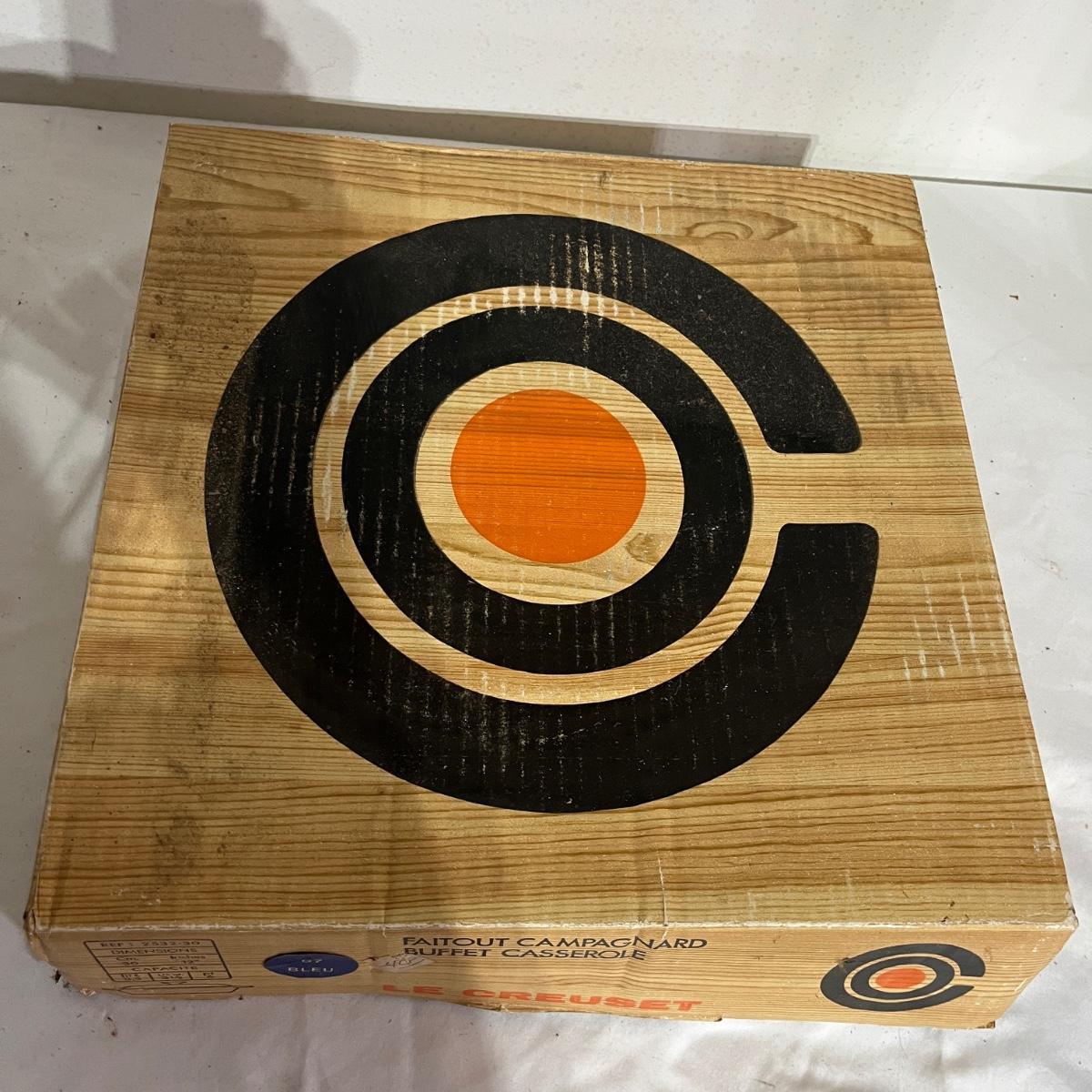 Lot includes a blue Le Creuset cast iron enameled 12”D buffet casserole dish. Item appears to be NIB but the box is dirty. Also includes Le Creuset covered dish.