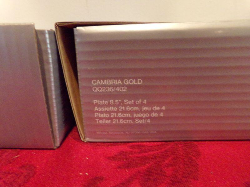 THERE ARE 2 BOXES OF 4 PLATES. 8 PLATES TOTAL AND THESE ARE NEW IN THE BOX. THE NAME OF THESE PLATES IS CALLED "CAMBRIA GOLD" AND THE PLATES MEASURE 8.5".