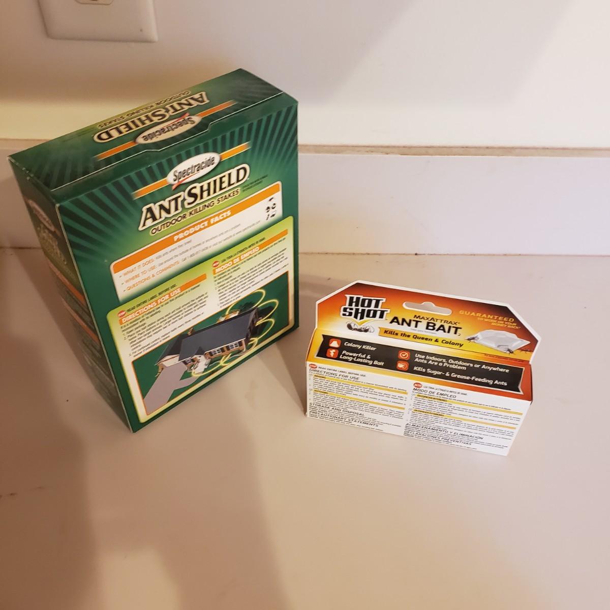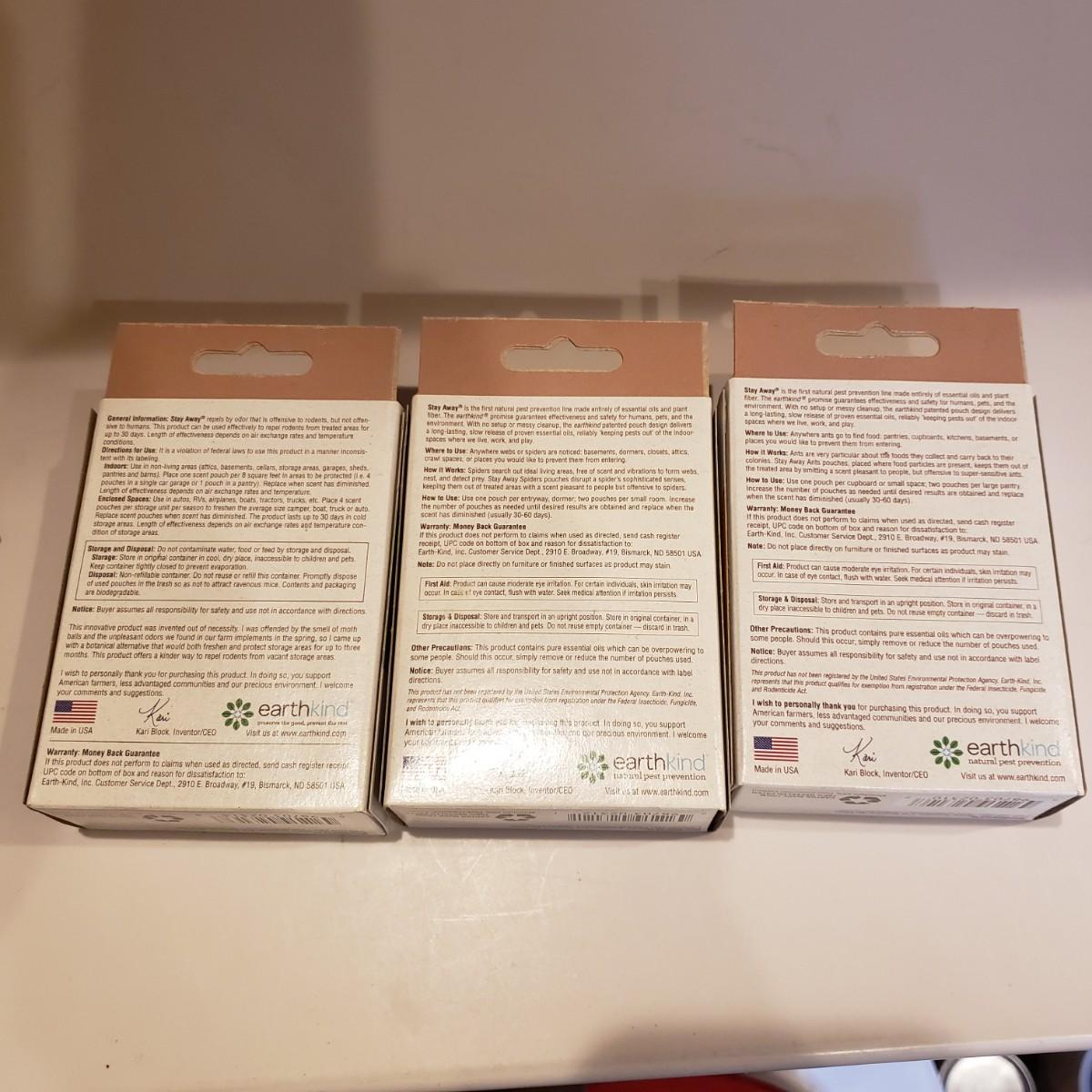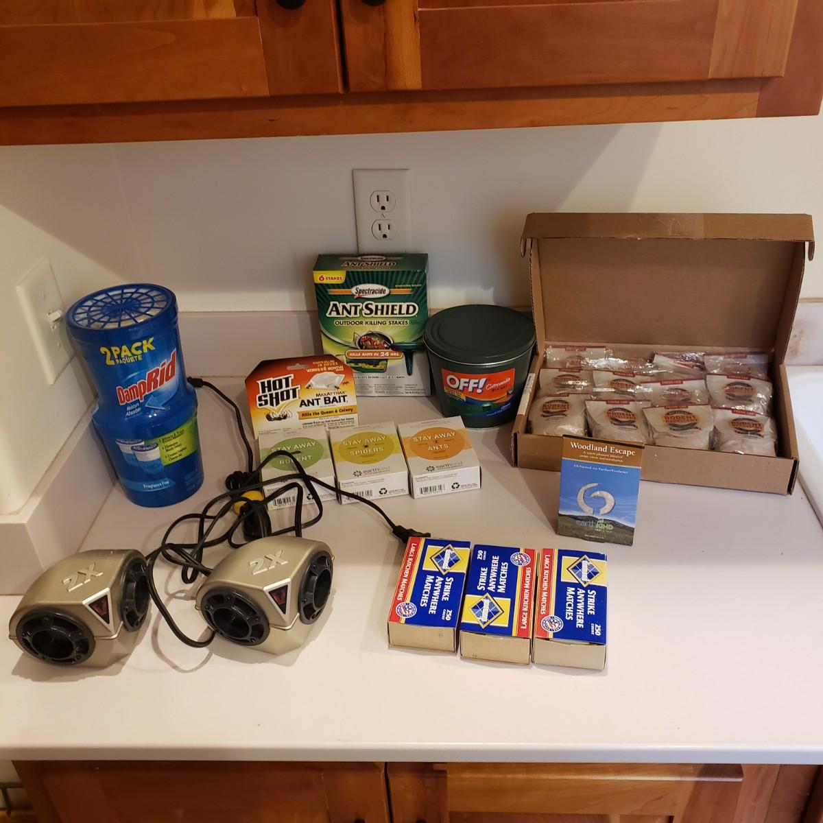 Earthkind New in Box pest control, DampRid, three boxes of matches, OFF! candle, ant traps and two plug in Vector Pest Control machines. Both power on when plugged in.