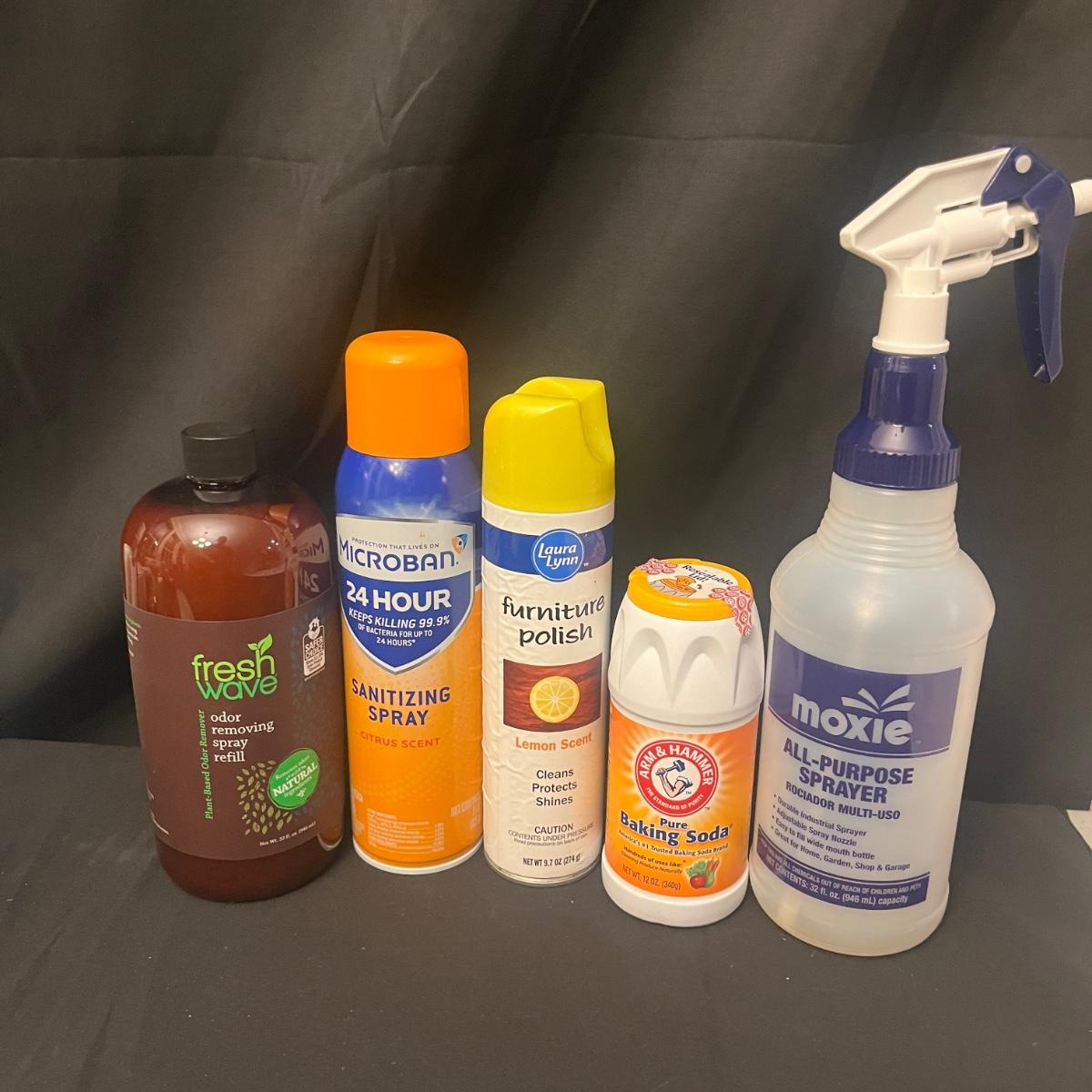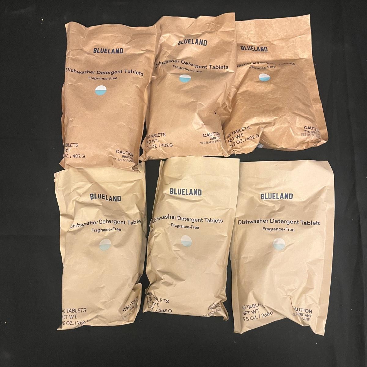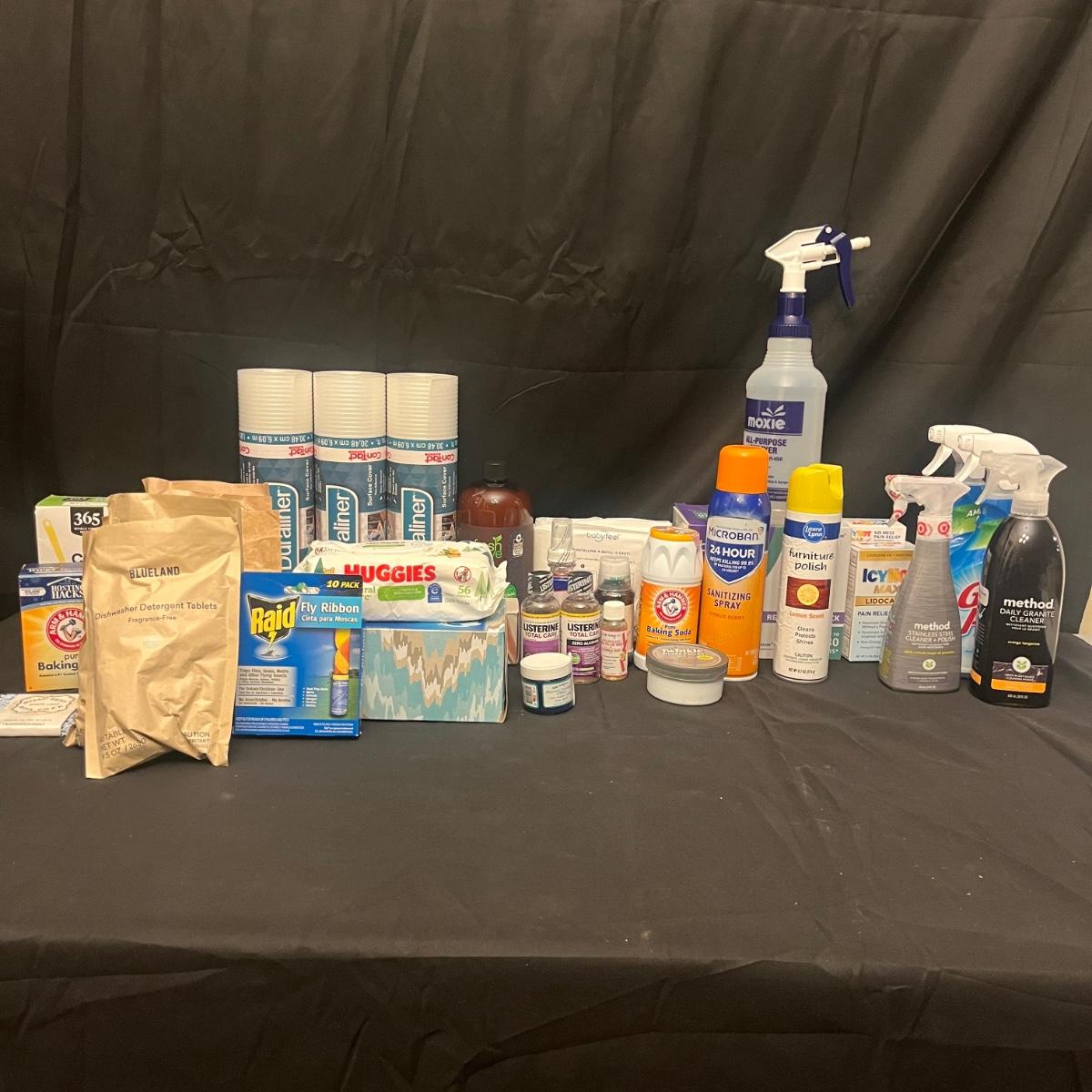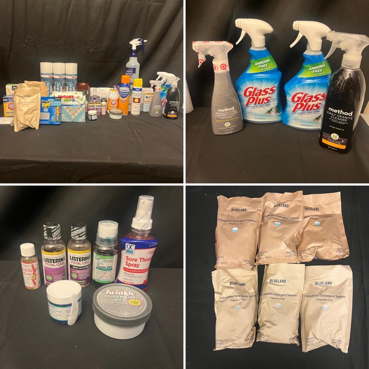 Lot contains a selection of NIB products that includes Blueland Dishwasher detergent tablets, Duraliner surface protector, Glass Plus, Icy Hot, granite cleaner, Kleenex and more.