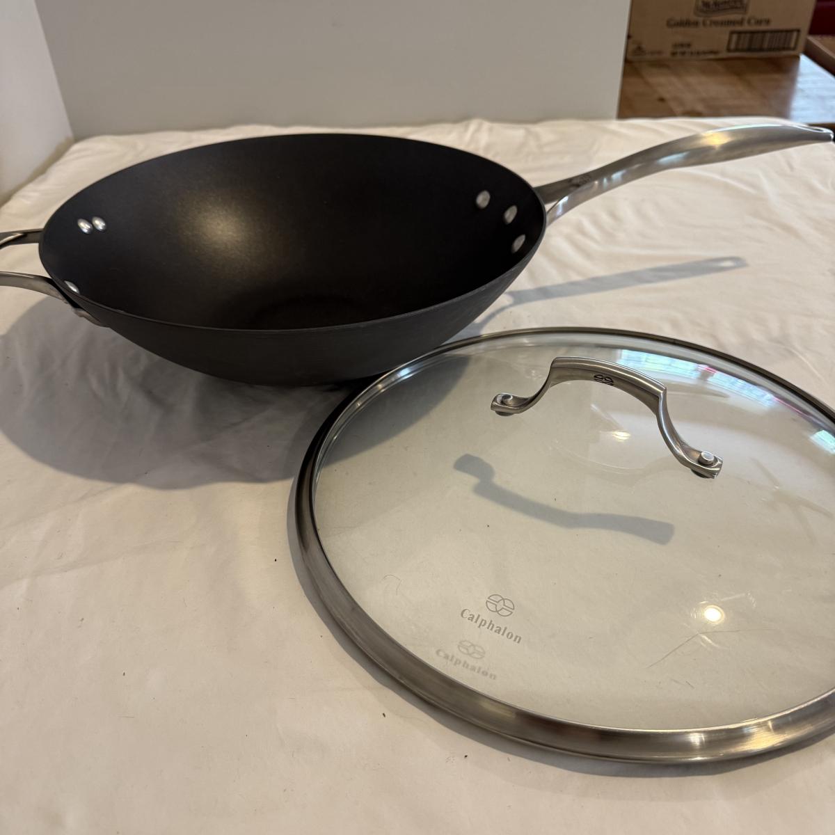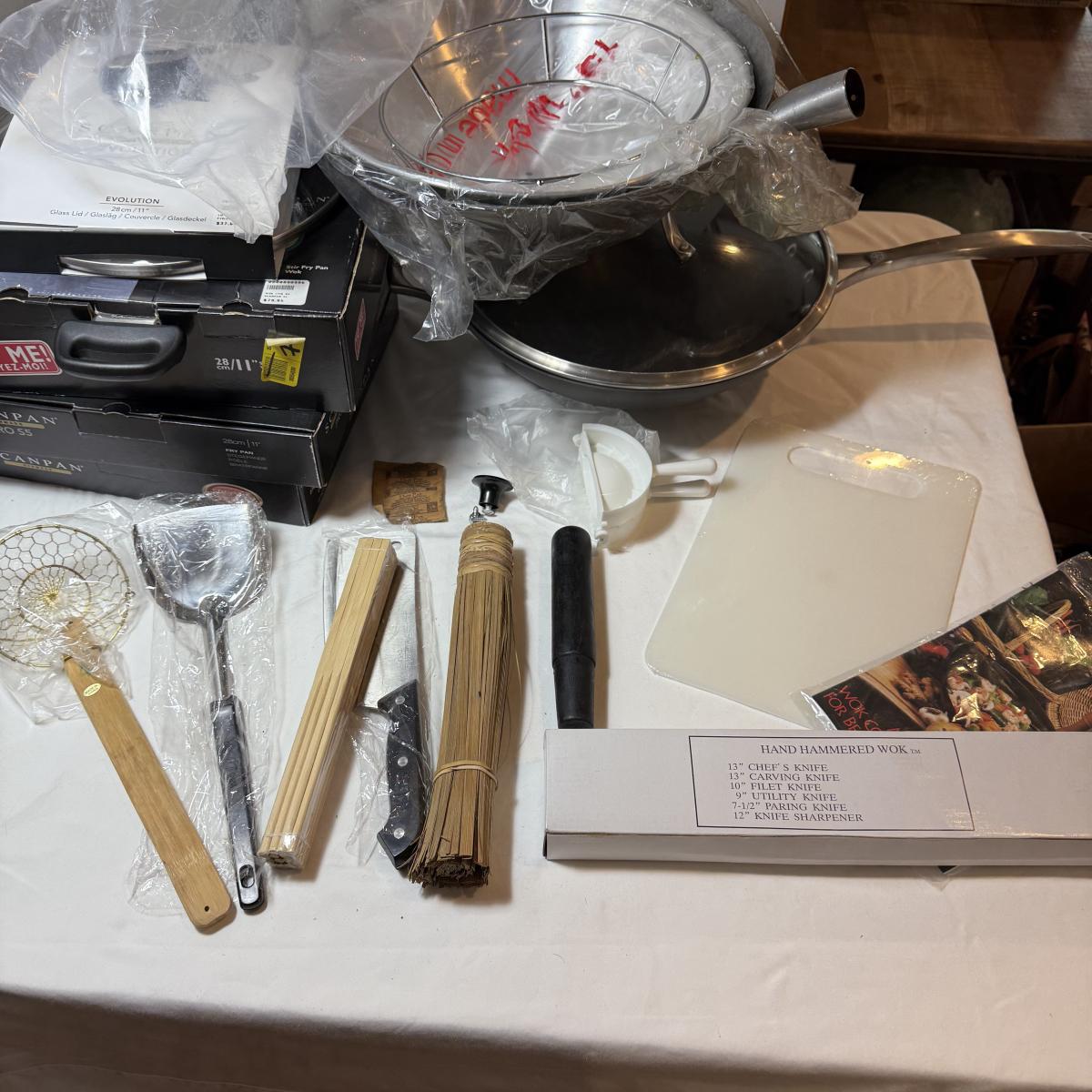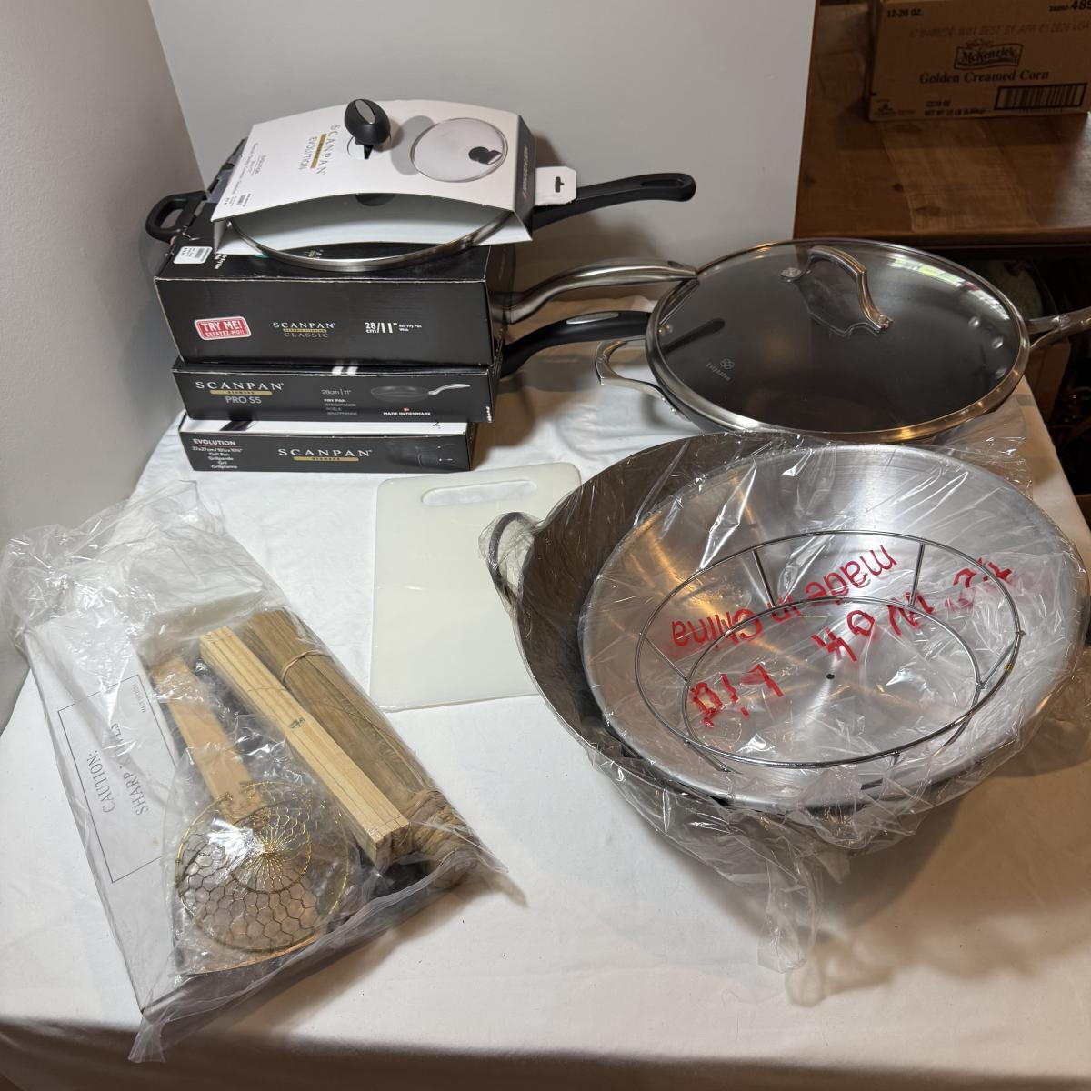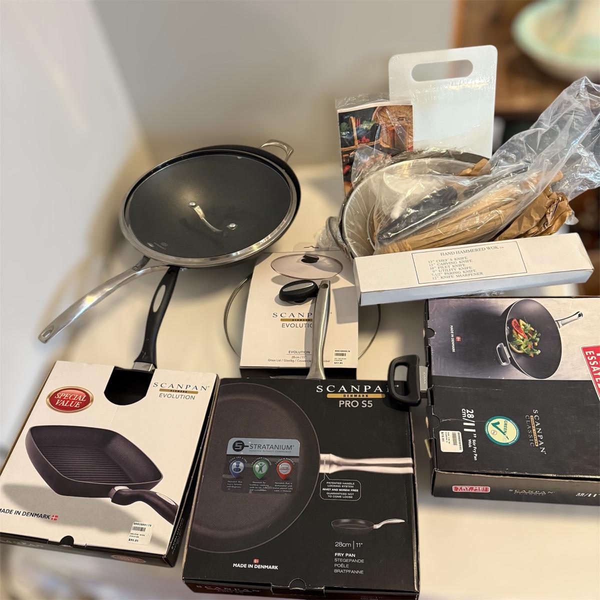 This lot contains a total of six pans and woks. Included is what appears to be new in box Scanpan 11” fry pan, 11” stir fry pan wok, 10.5” grill pan, and a 11” glass lid. Lot also contains a Calphalon 13” wok with a lid (this item was not in packaging). Lastly is a wok set by China Connections. This set is in what appears to be its original packaging and includes several items with it such as a small cutting board, knives, and utensils for various functions. See pictures for details. Shipping available.