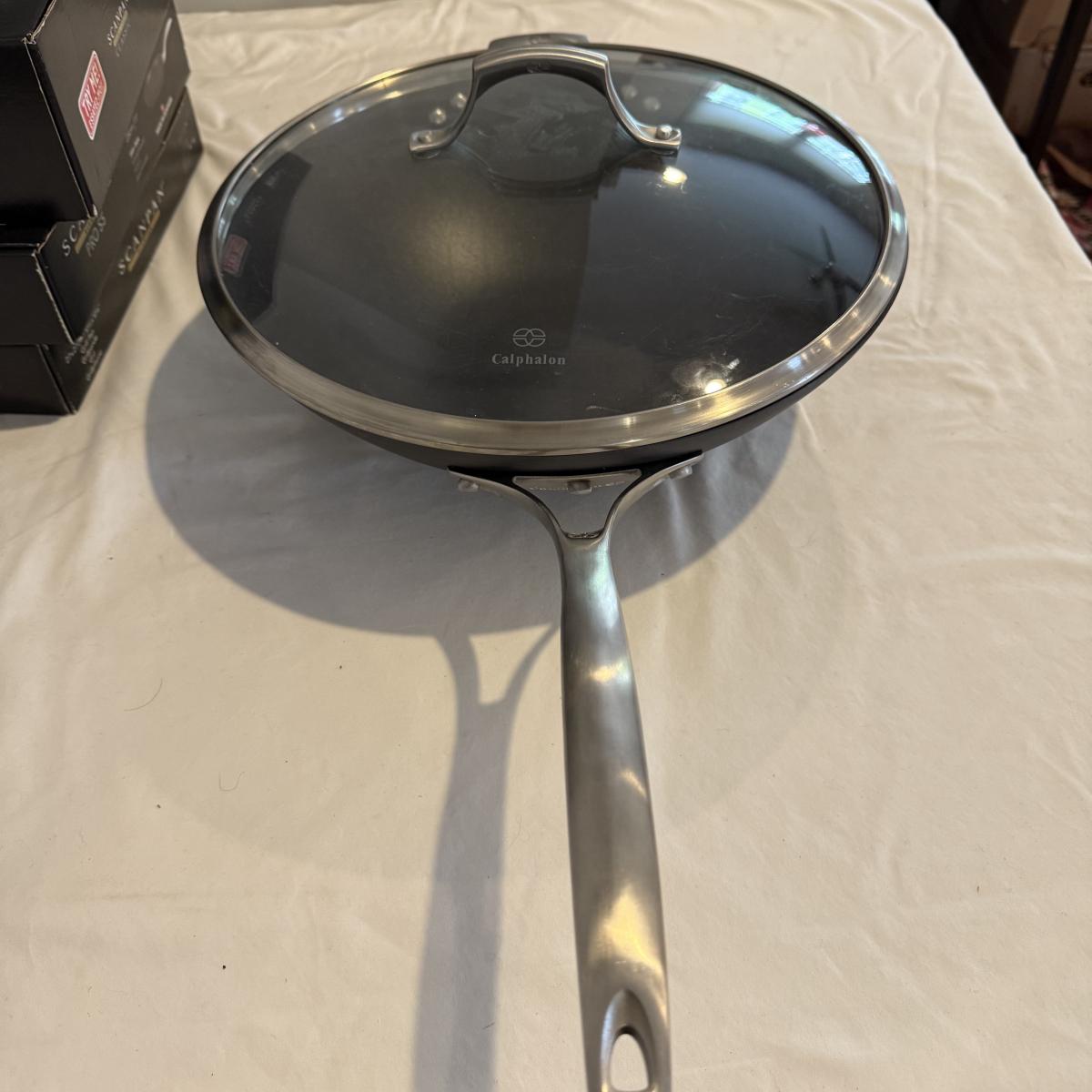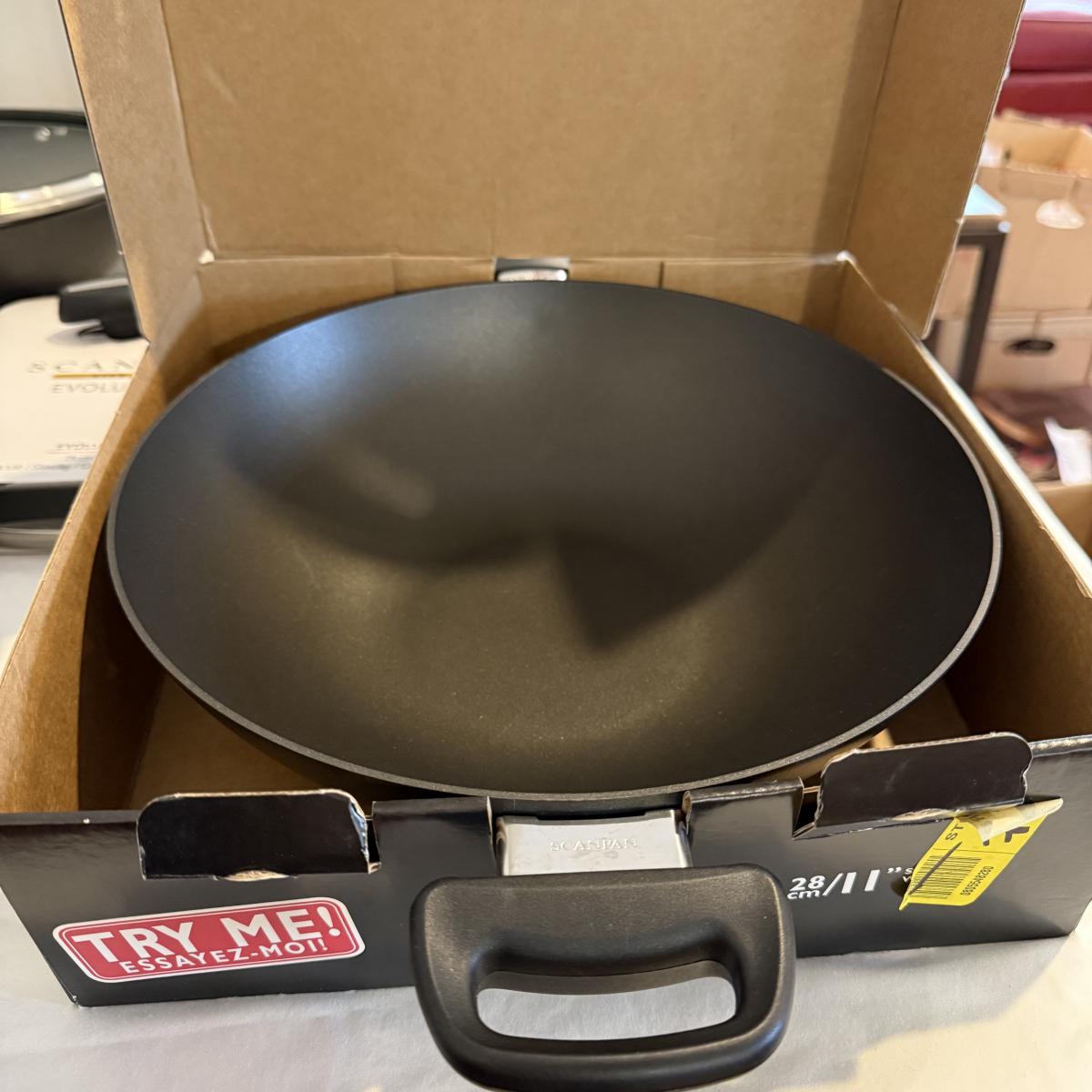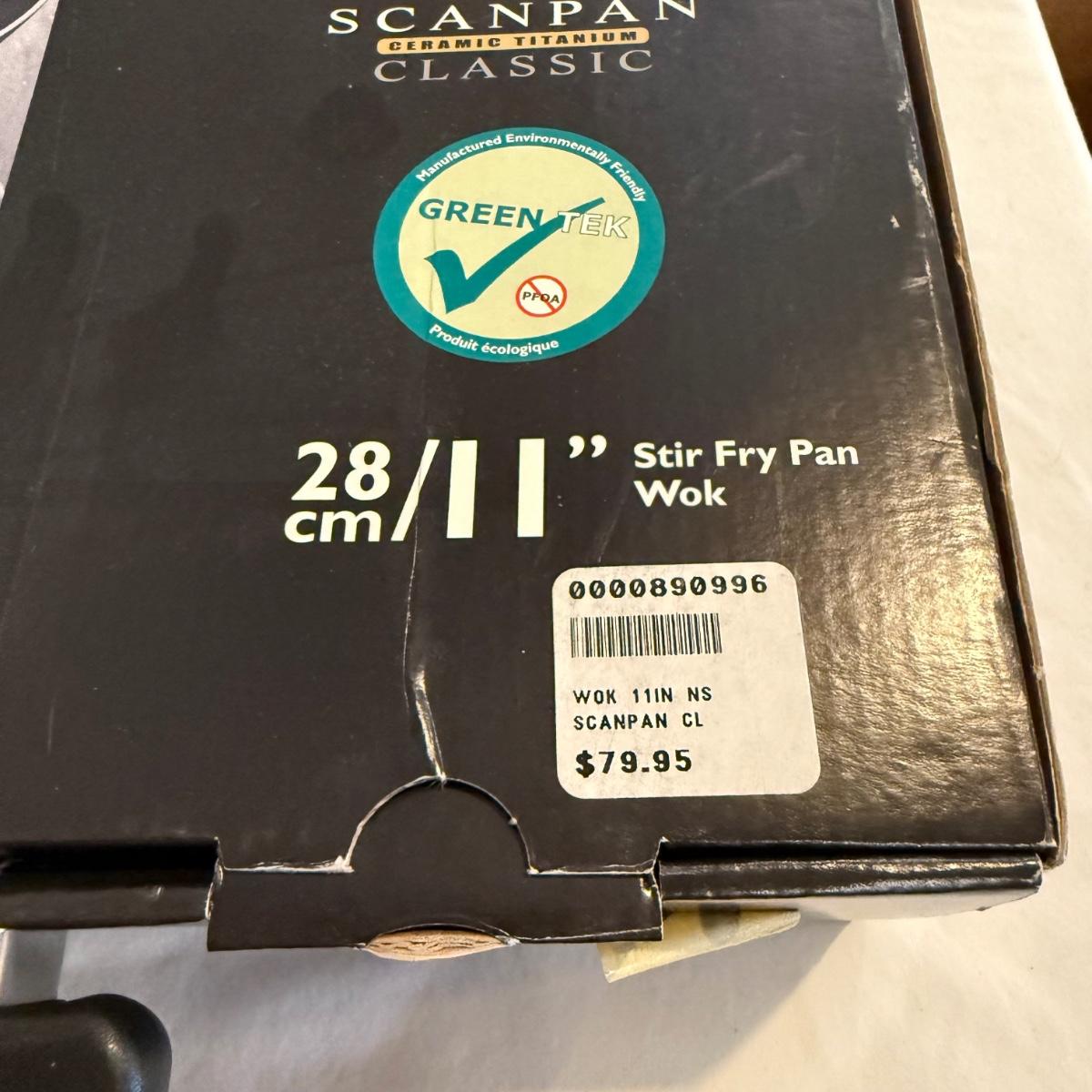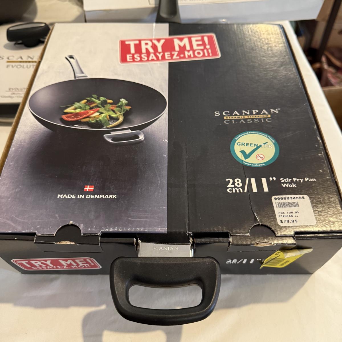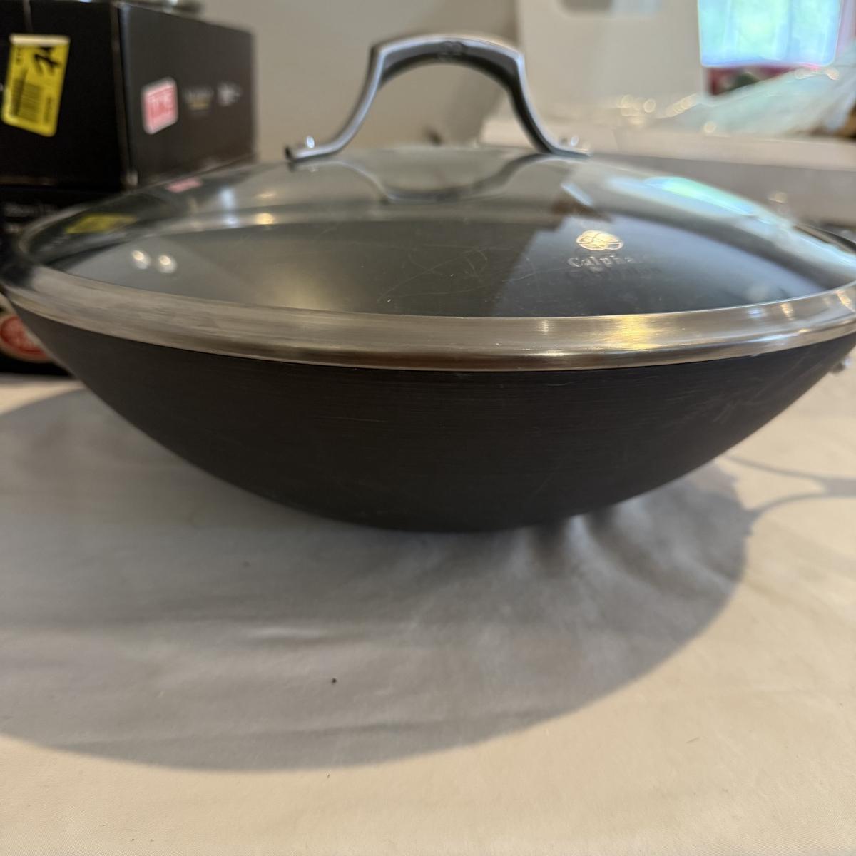 This lot contains a total of six pans and woks. Included is what appears to be new in box Scanpan 11” fry pan, 11” stir fry pan wok, 10.5” grill pan, and a 11” glass lid. Lot also contains a Calphalon 13” wok with a lid (this item was not in packaging). Lastly is a wok set by China Connections. This set is in what appears to be its original packaging and includes several items with it such as a small cutting board, knives, and utensils for various functions. See pictures for details. Shipping available.
