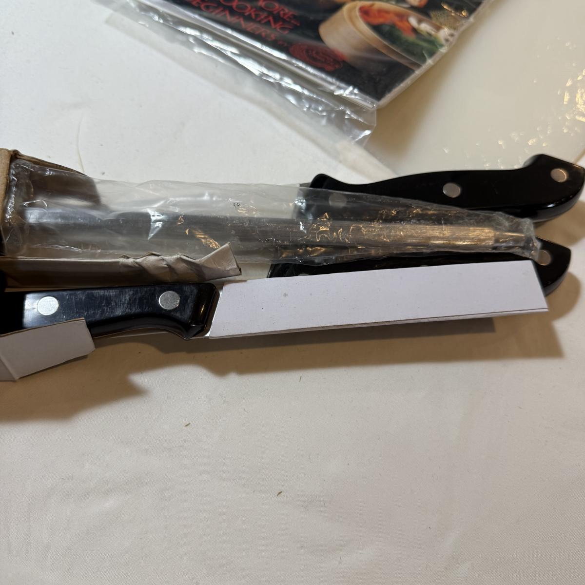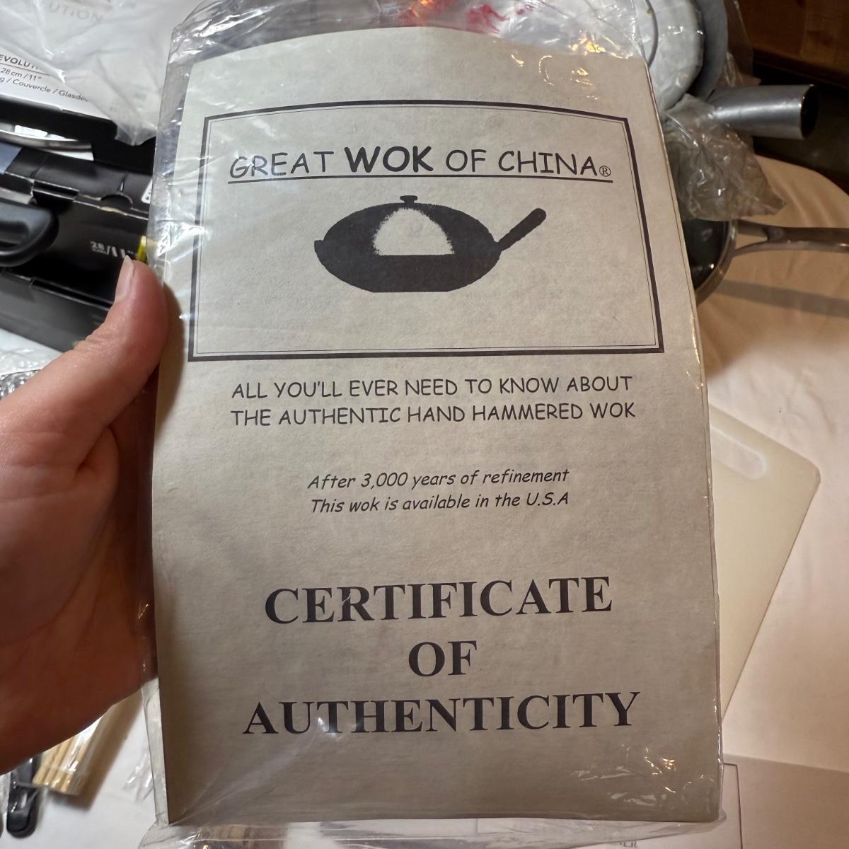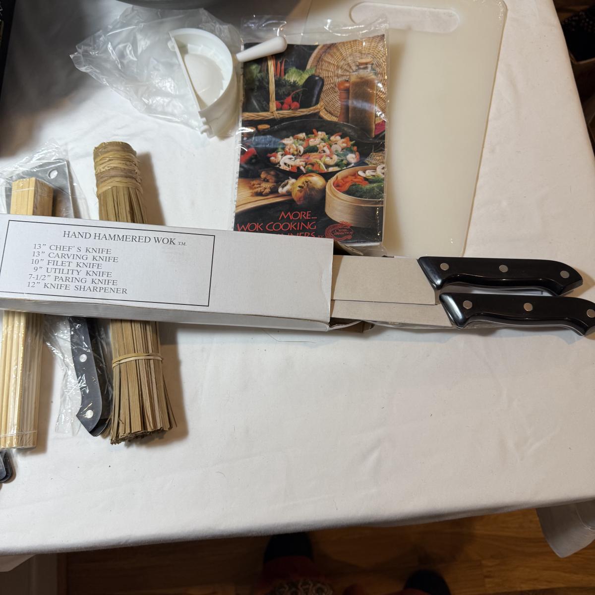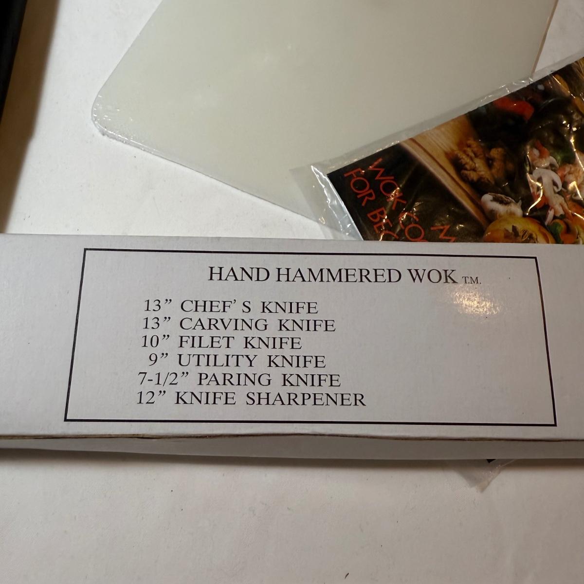 This lot contains a total of six pans and woks. Included is what appears to be new in box Scanpan 11” fry pan, 11” stir fry pan wok, 10.5” grill pan, and a 11” glass lid. Lot also contains a Calphalon 13” wok with a lid (this item was not in packaging). Lastly is a wok set by China Connections. This set is in what appears to be its original packaging and includes several items with it such as a small cutting board, knives, and utensils for various functions. See pictures for details. Shipping available.
