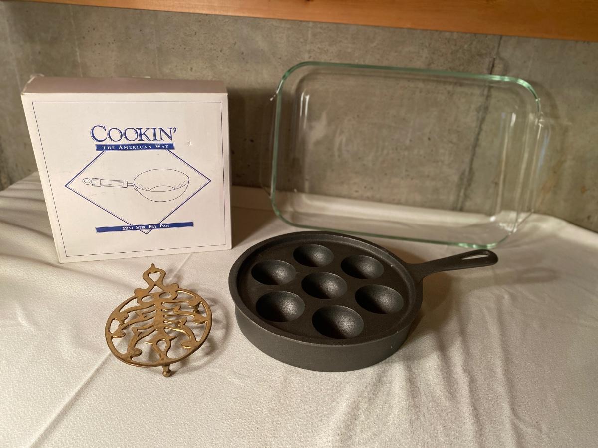 NIB SMALL STIR FRY PAN, NEW CAST IRON AEBLESKIVER, 13x9 GLASS BAKING DISH AND MORE
