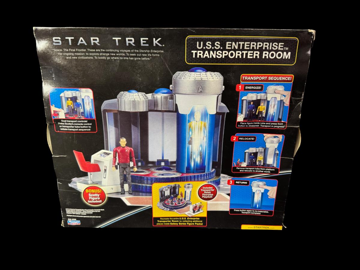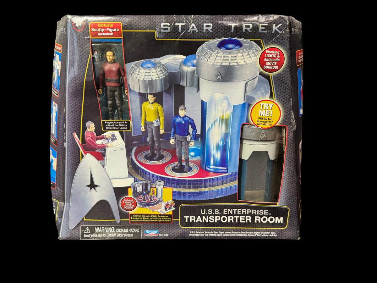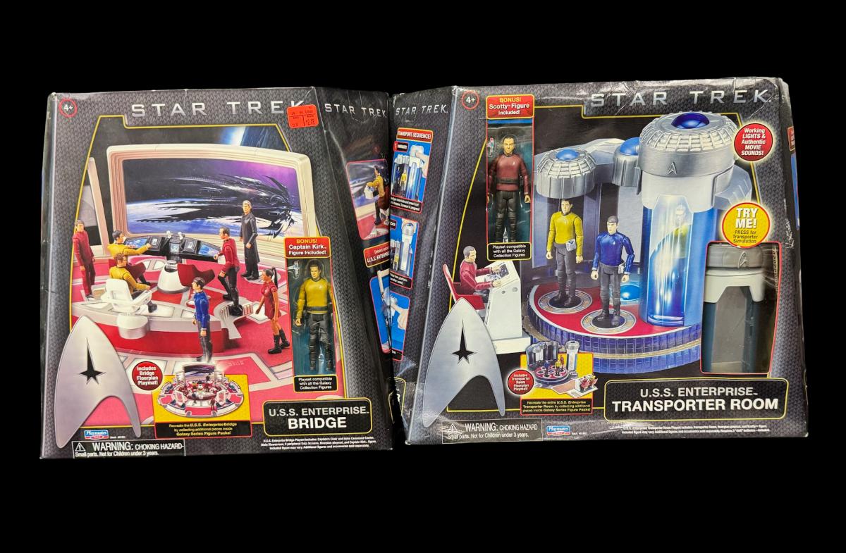 Includes two unopened USS Enterprise pieces: an Enterprise Bridge, and an Enterprise Transporter Room. The boxes show signs of storage wear. Pre-auction estimate: $100-$150.