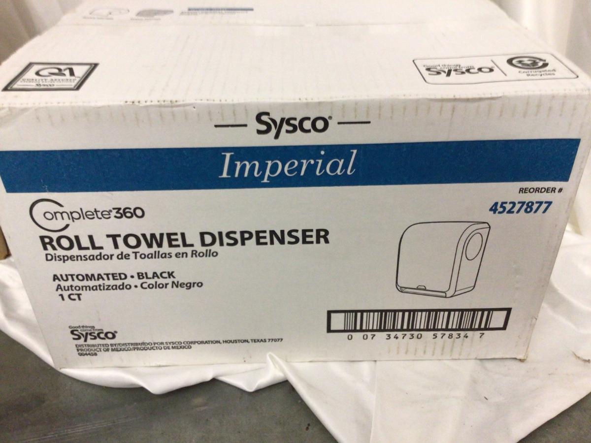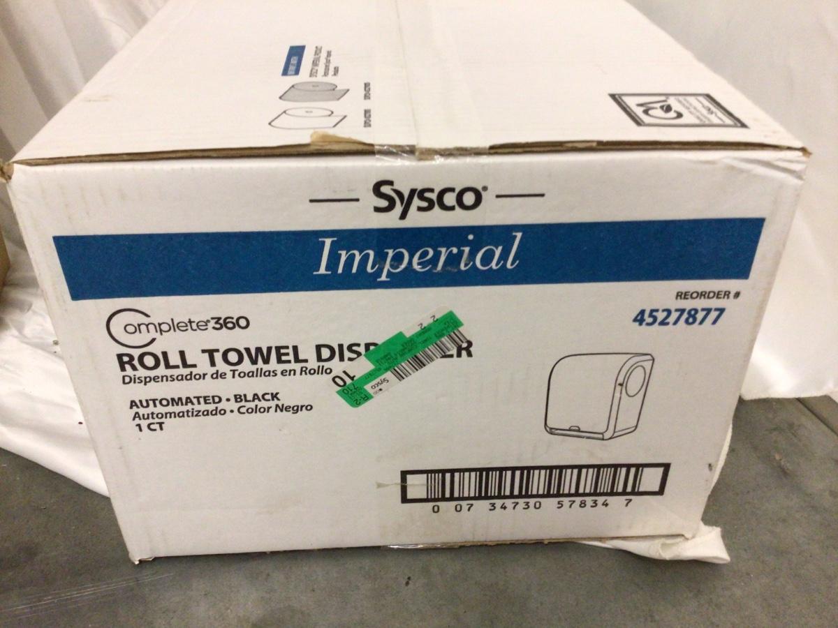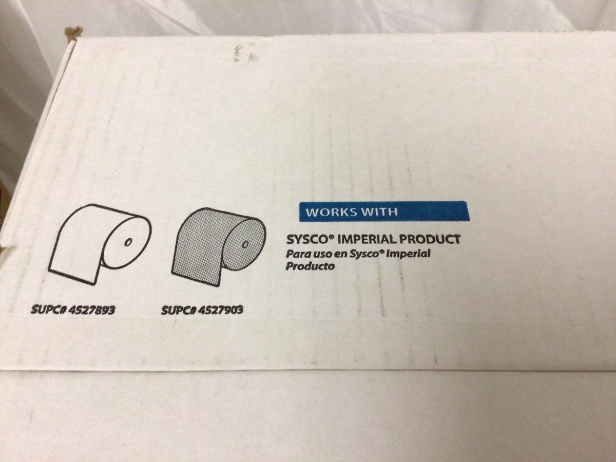 Brand new in sealed box is a Sysco Imperial paper towel dispenser.
