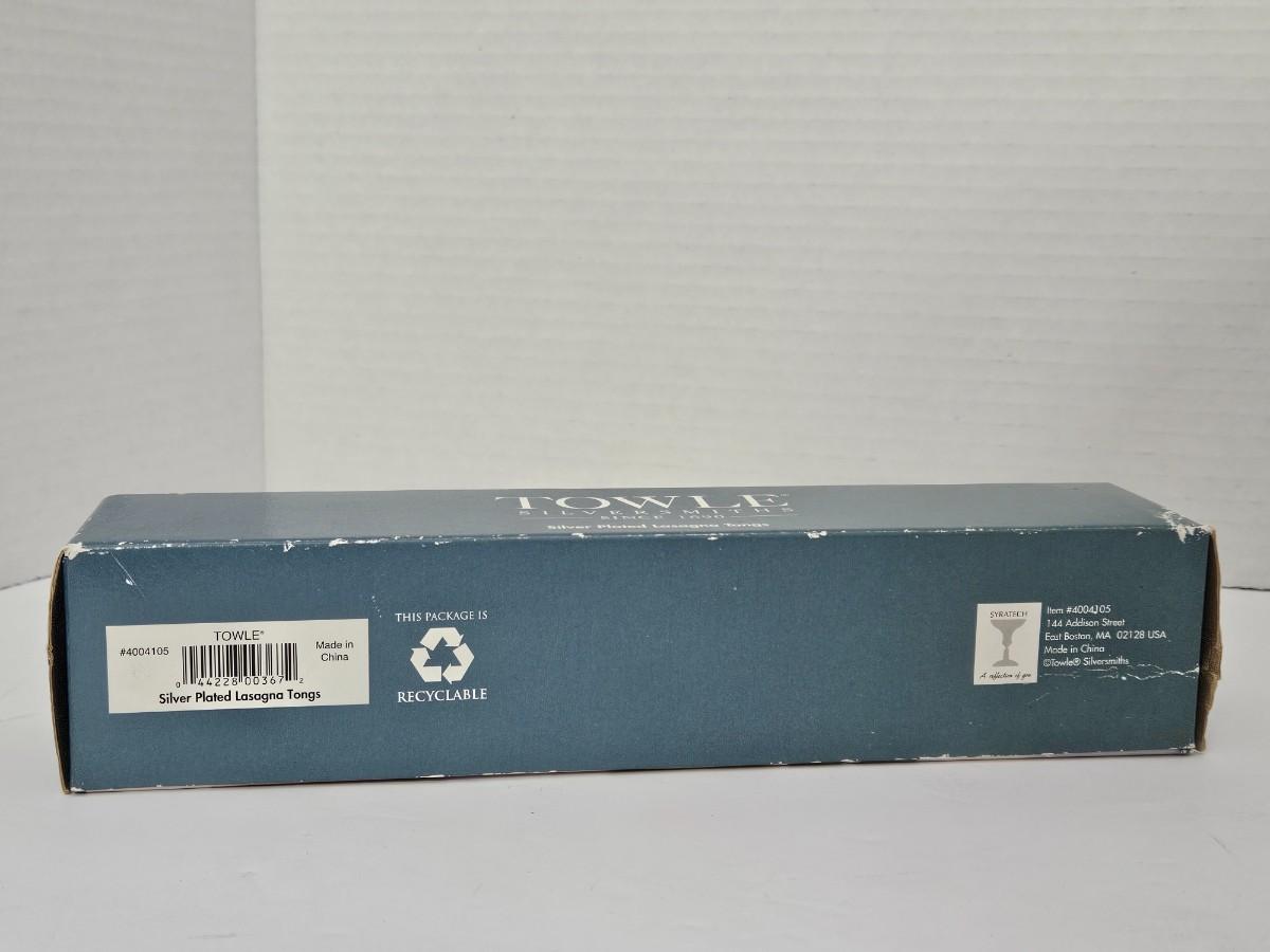 This is a brand-new in box (NIB) pair of Towle Silversmiths silver-plated lasagna tongs. Towle is a respected American brand with history dating back to a colonial silversmith in 1690 Massachusetts. This specific serving piece features an elegant, ornate design on the handles and a functional clawed end for serving lasagna, cake, or pastries. It is a stylish addition to any table setting or flatware collection.