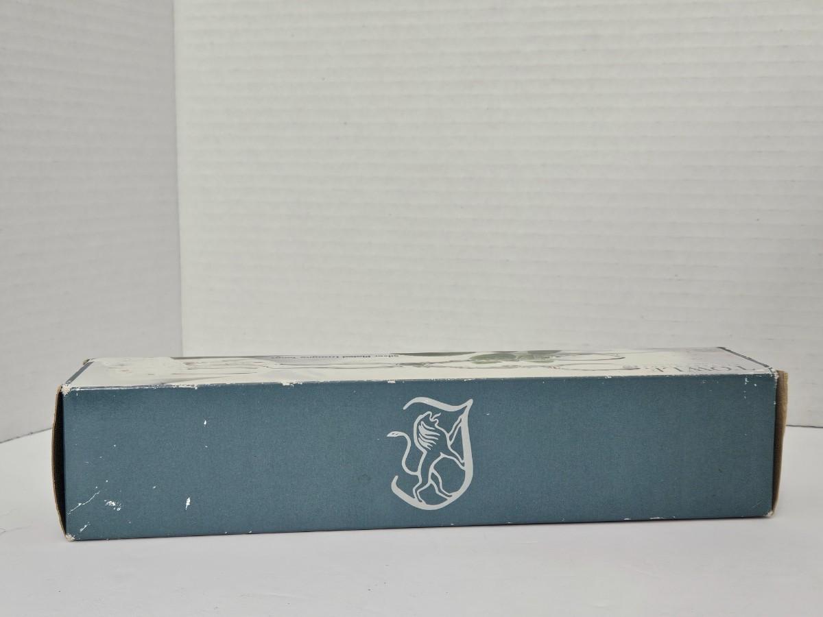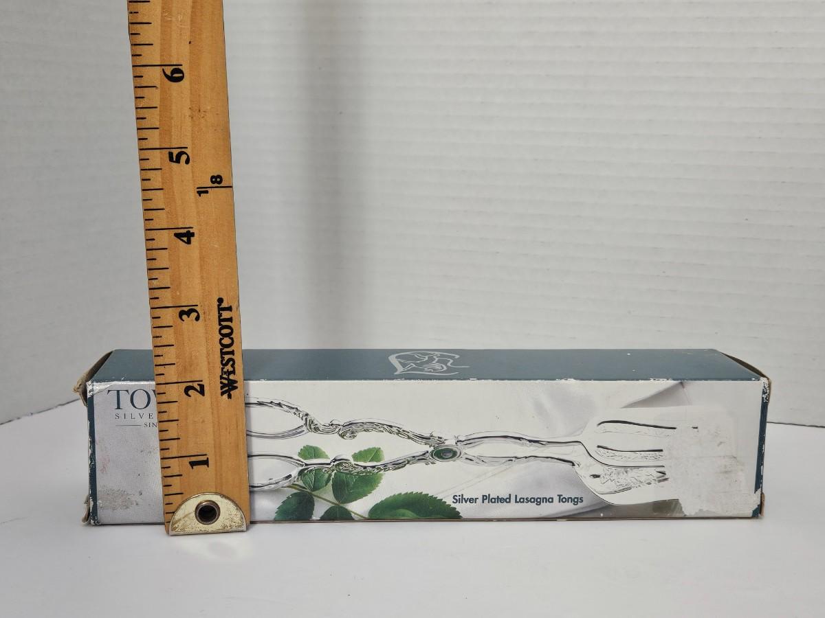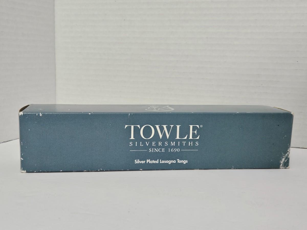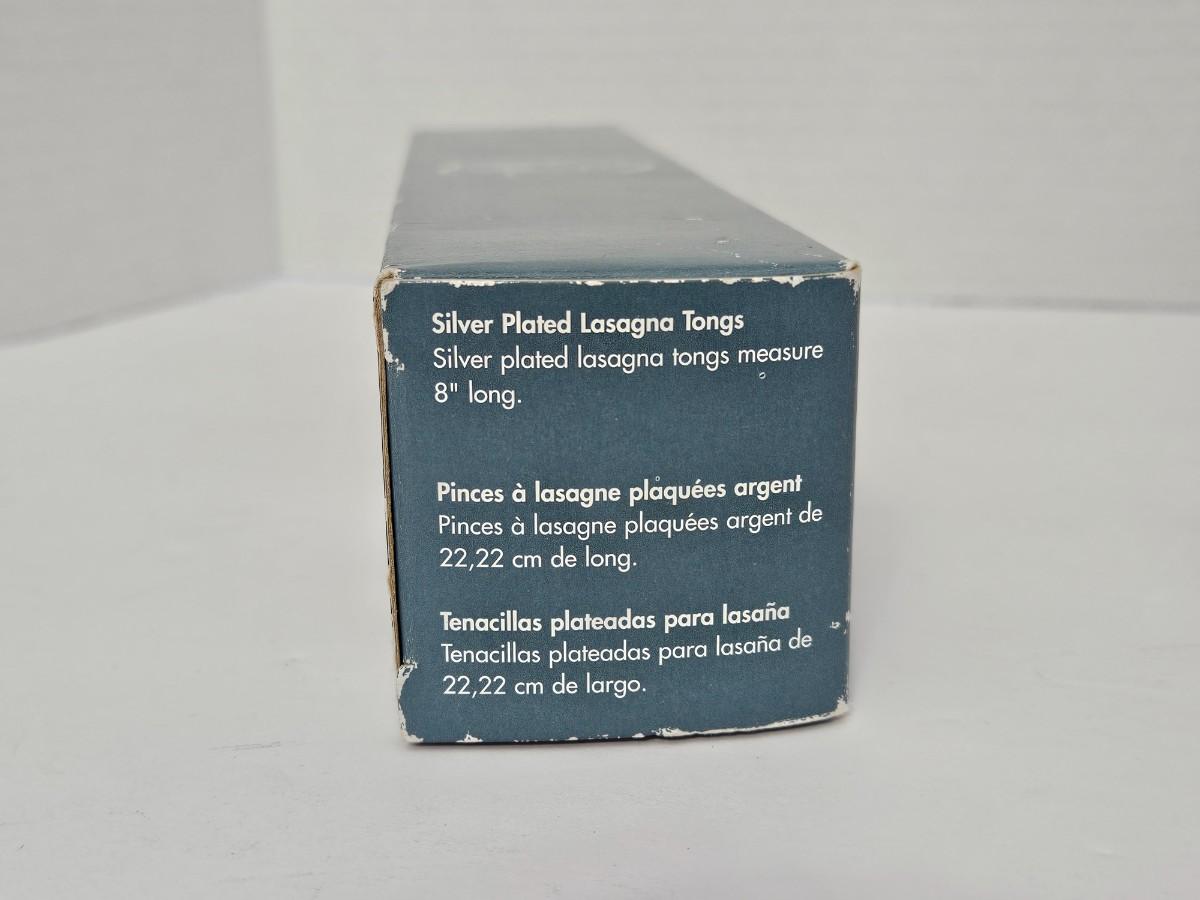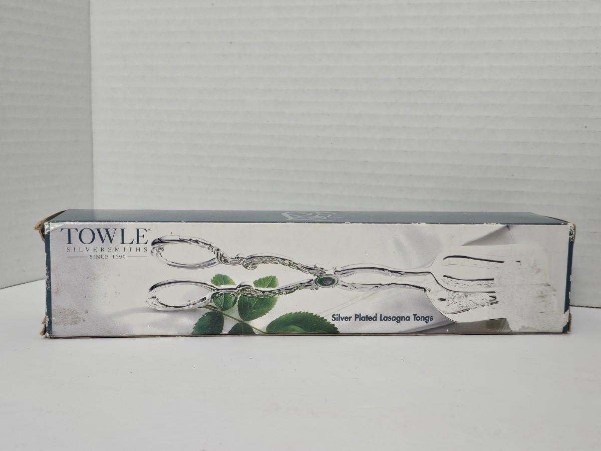 This is a brand-new in box (NIB) pair of Towle Silversmiths silver-plated lasagna tongs. Towle is a respected American brand with history dating back to a colonial silversmith in 1690 Massachusetts. This specific serving piece features an elegant, ornate design on the handles and a functional clawed end for serving lasagna, cake, or pastries. It is a stylish addition to any table setting or flatware collection.