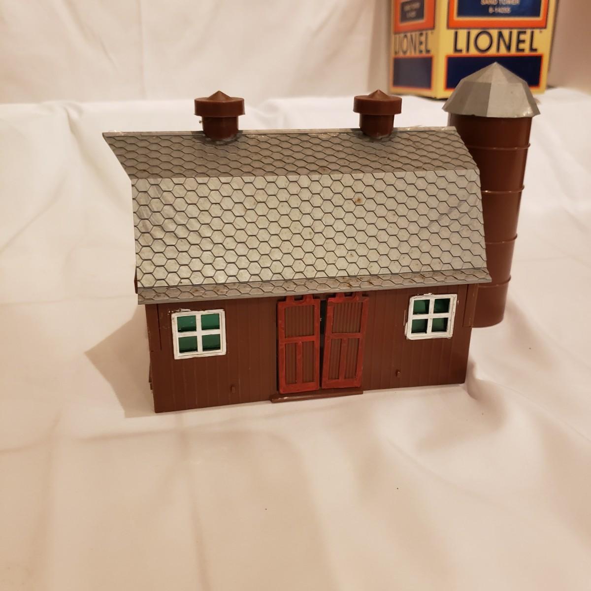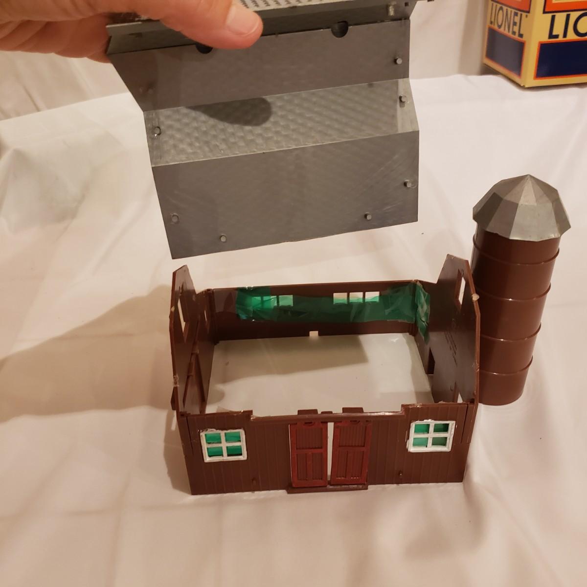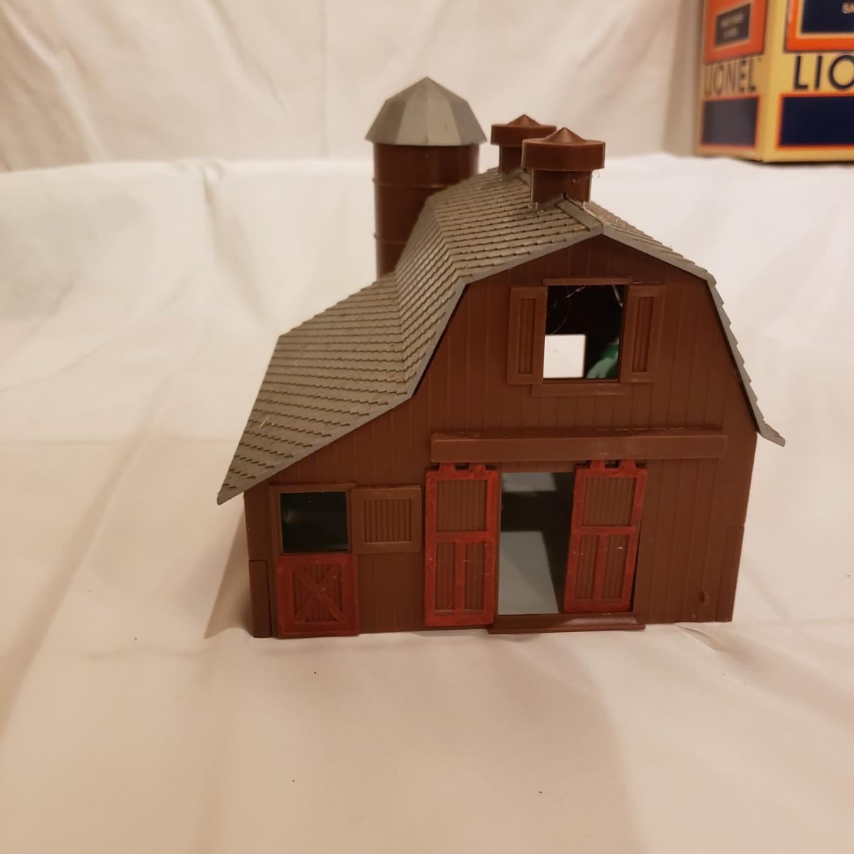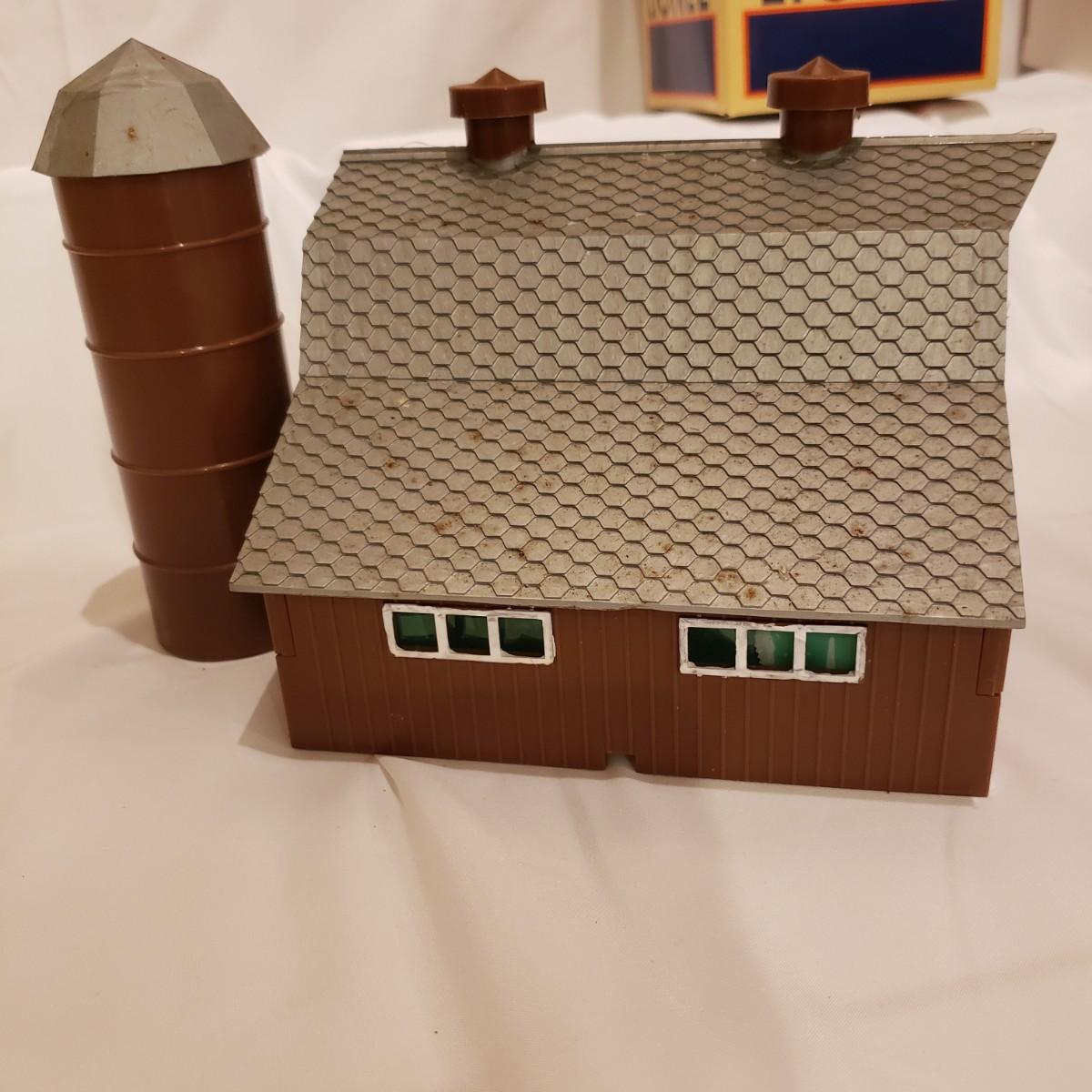 This train building lot features six NIB buildings and one that comes with the original box. The Whistling Freight Shed has been used, but has it's original box. The barn measures 9" x 6" x 6"H. The roof is removable. See pictures for details.