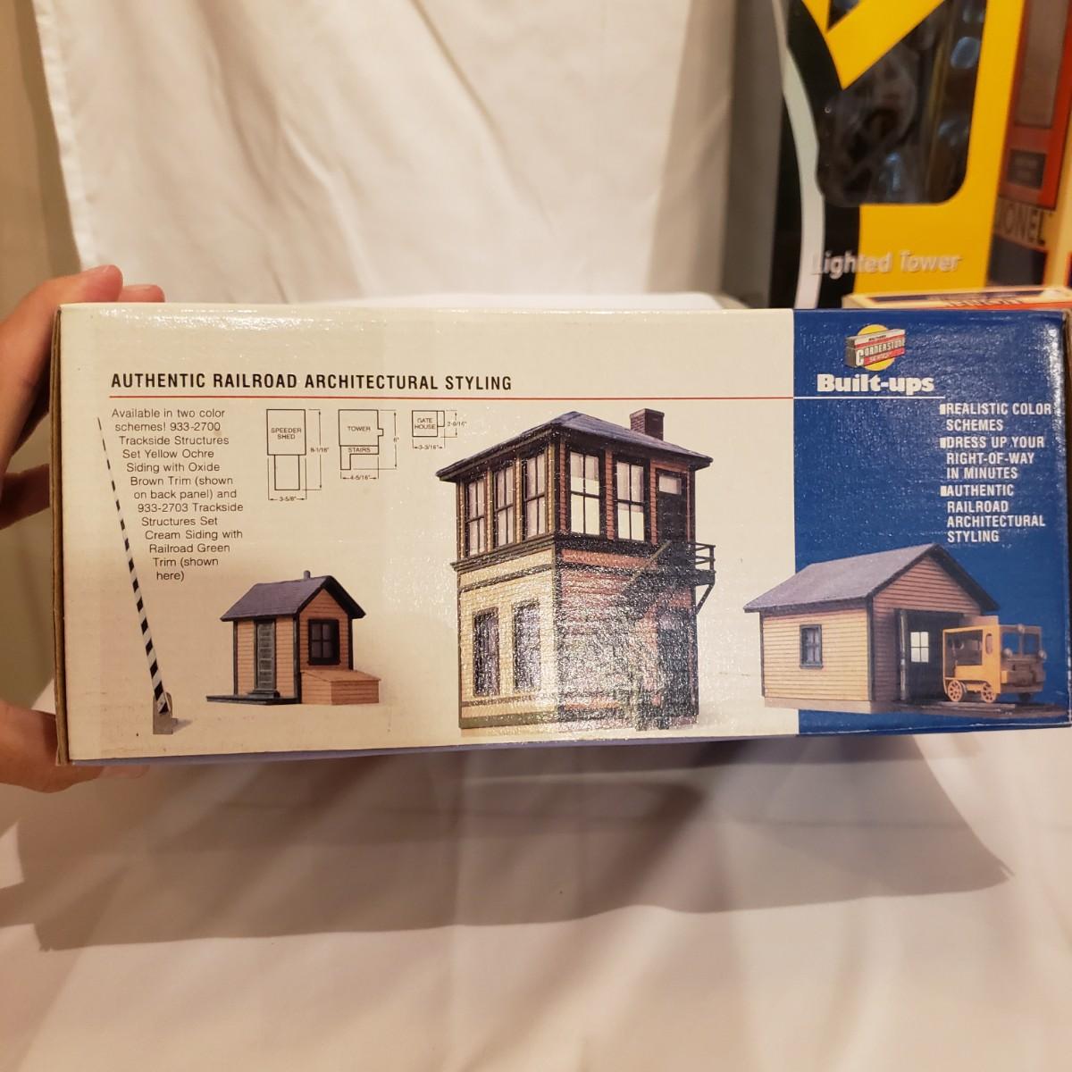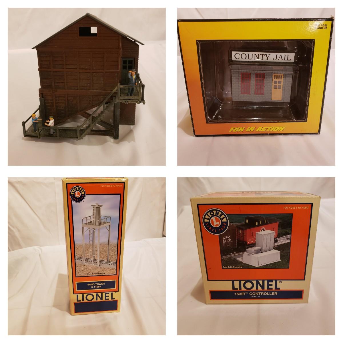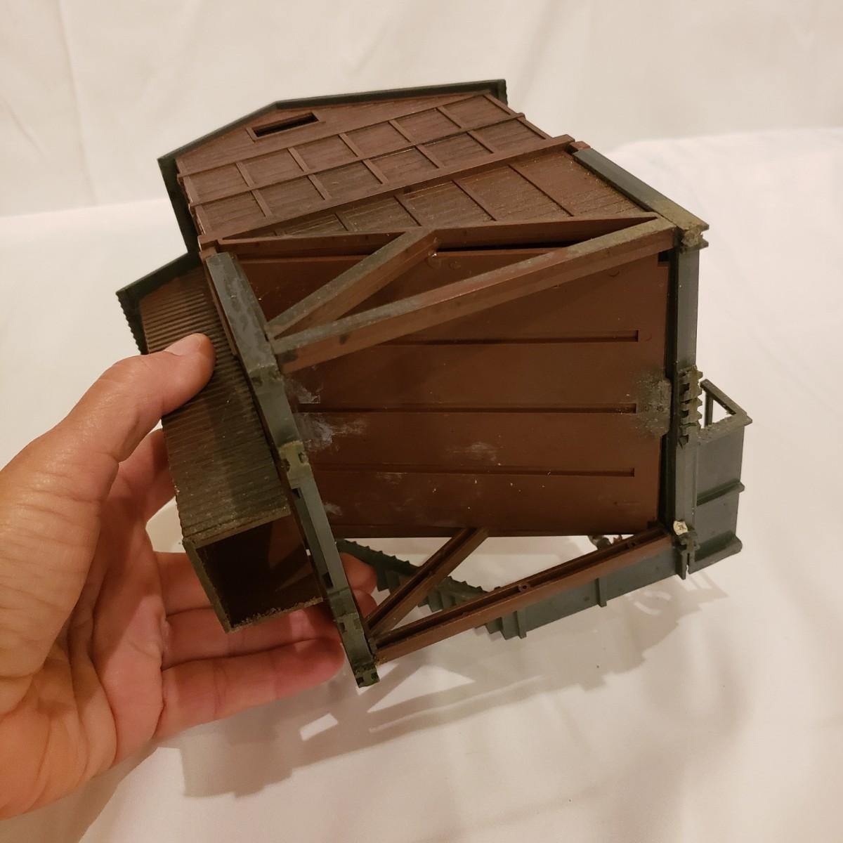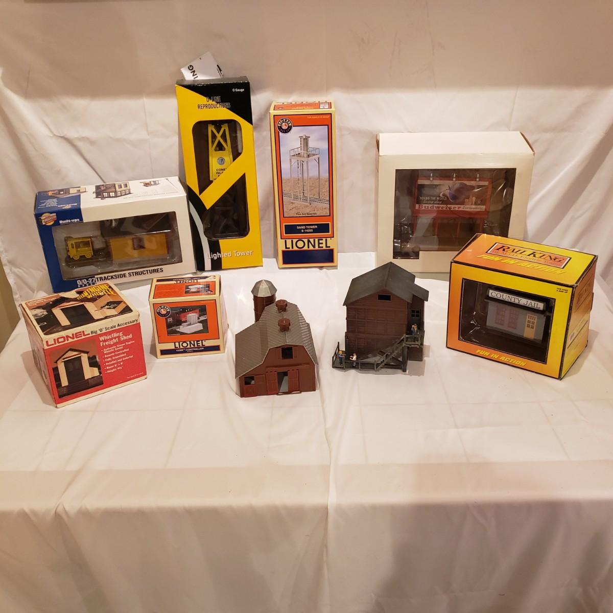 This train building lot features six NIB buildings and one that comes with the original box. The Whistling Freight Shed has been used, but has it's original box. The barn measures 9" x 6" x 6"H. The roof is removable. See pictures for details.