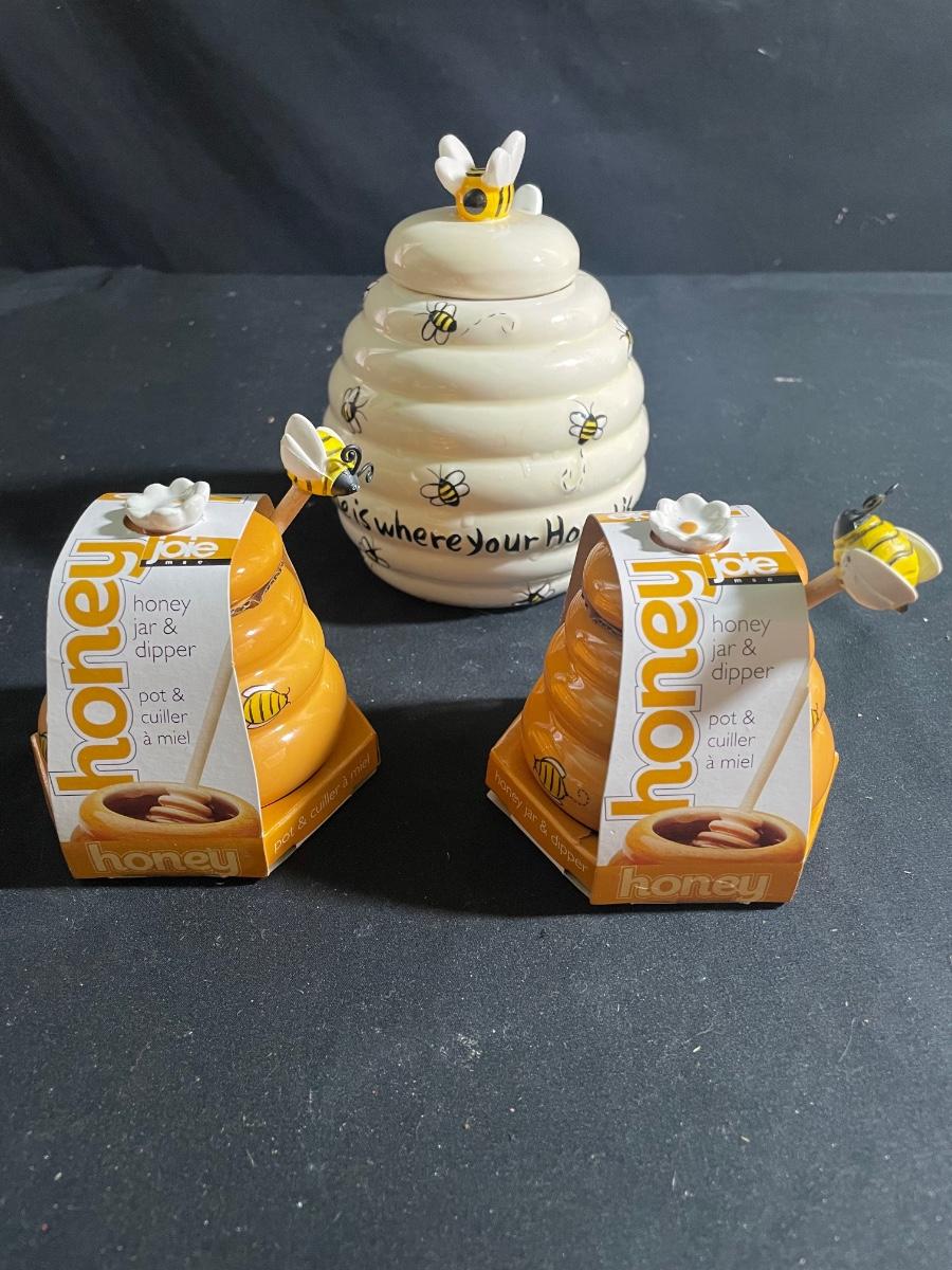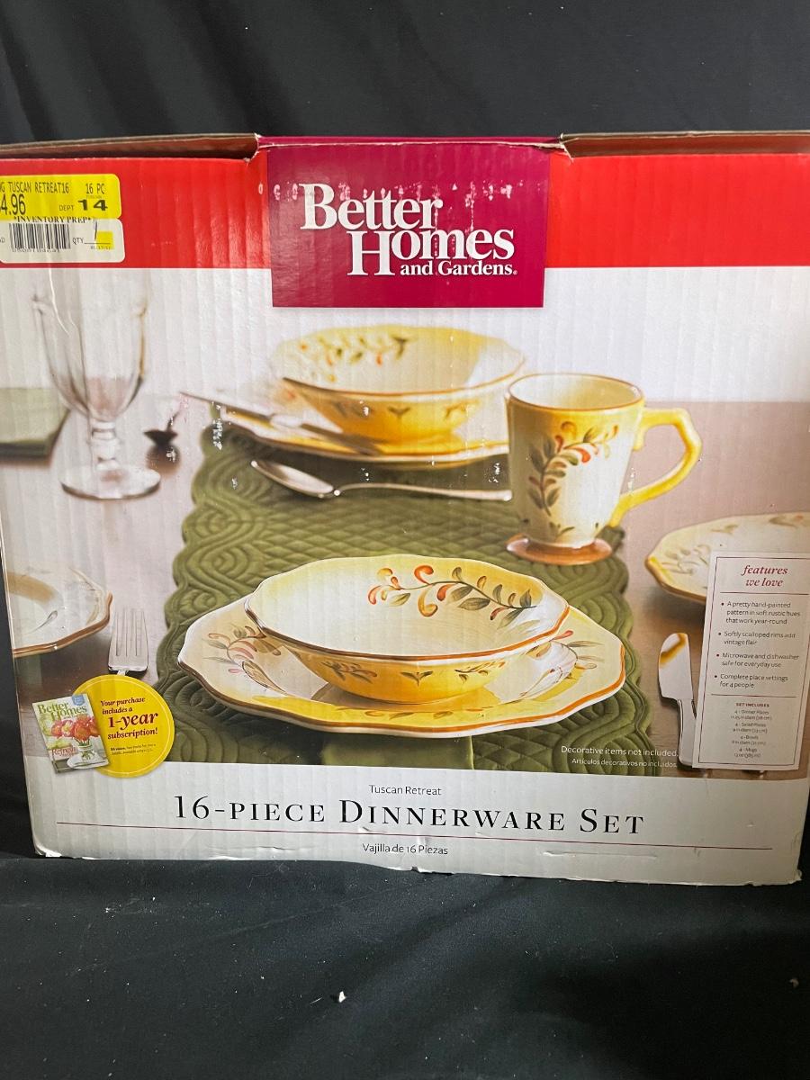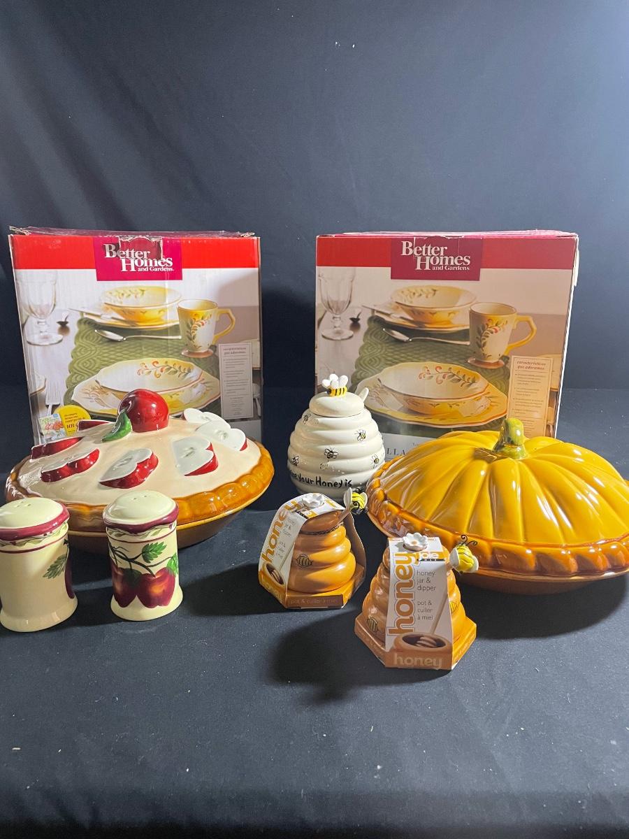Two new in box Better Homes & Gardens dinnerware sets, see images for box contents. Lot also includes more ceramic items, all in great condition with 2 pie keeps that are 10” diameter, 3 honey jars and a matching ceramic sugar bowl, salt and pepper shakers.