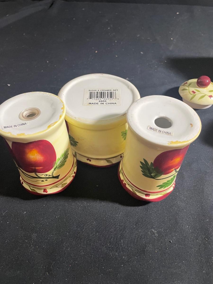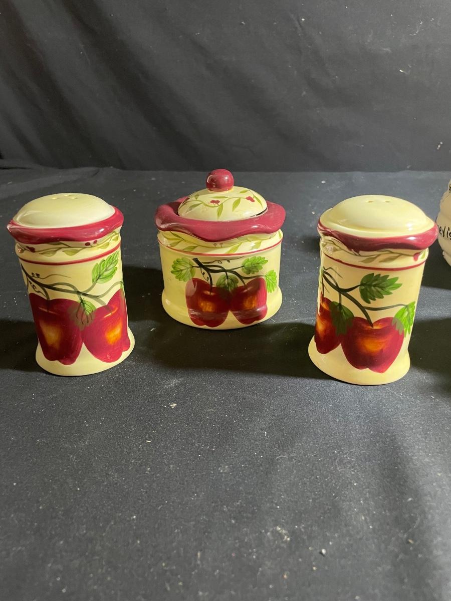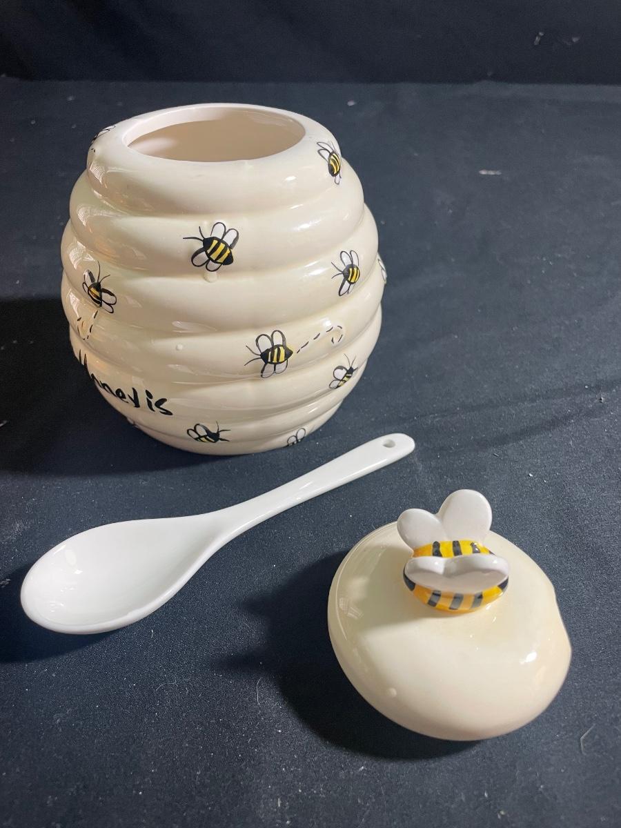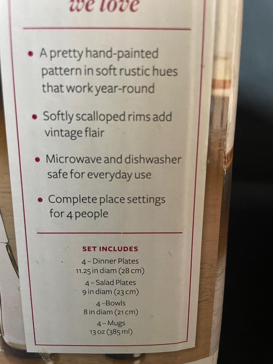Two new in box Better Homes & Gardens dinnerware sets, see images for box contents. Lot also includes more ceramic items, all in great condition with 2 pie keeps that are 10” diameter, 3 honey jars and a matching ceramic sugar bowl, salt and pepper shakers.