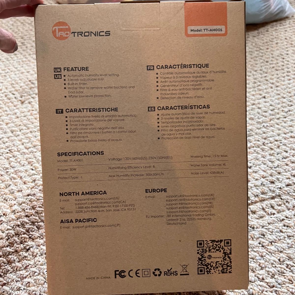 NIB TAO TRONICS Model: TT-AH001 Ultrasonic Cool Mist Humidifier NEW