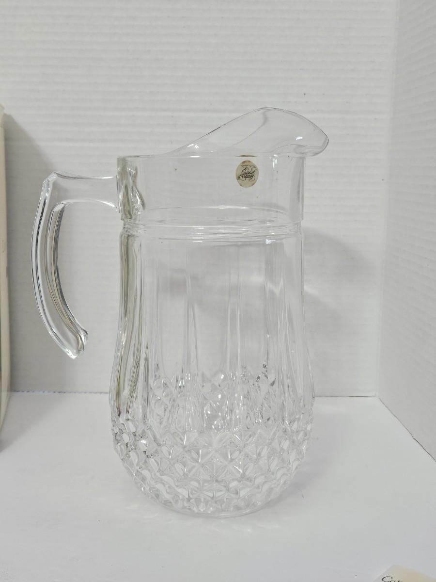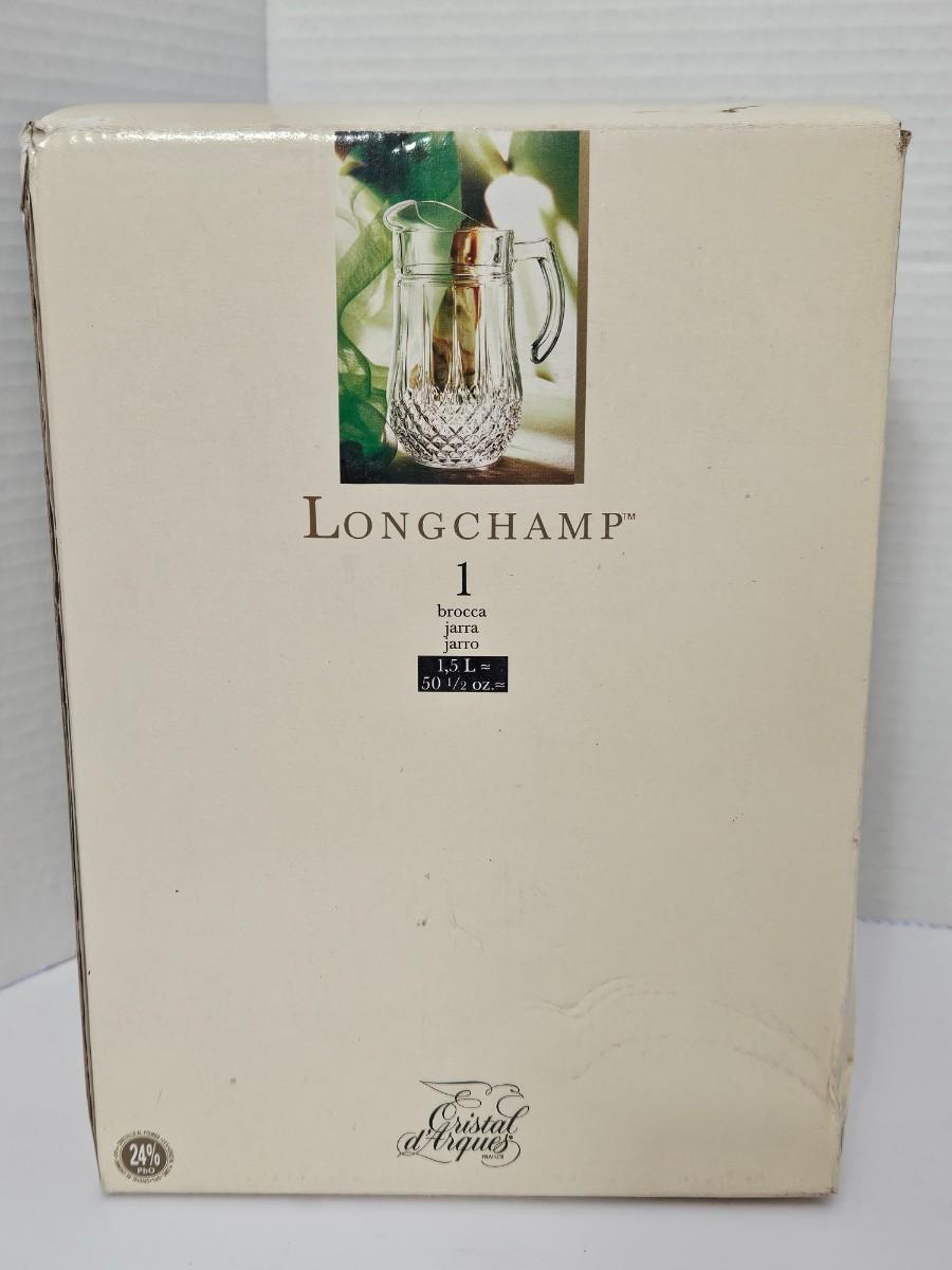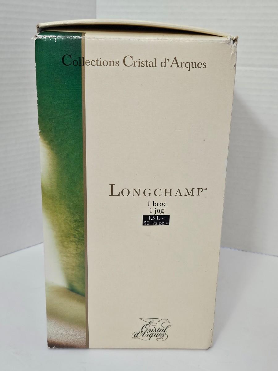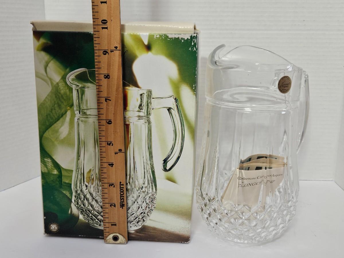 This is a stunning, brand-new in box (NIB) Cristal d'Arques-Durand Longchamp pattern pitcher, crafted in France. This iconic and timeless piece features the brilliant clarity and substantial weight of genuine 24% lead crystal and the signature diamond cut pattern around the base. It is a classic design that adds a sophisticated touch to any table setting or collection.