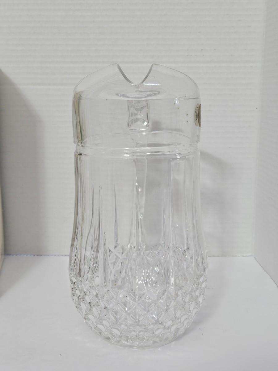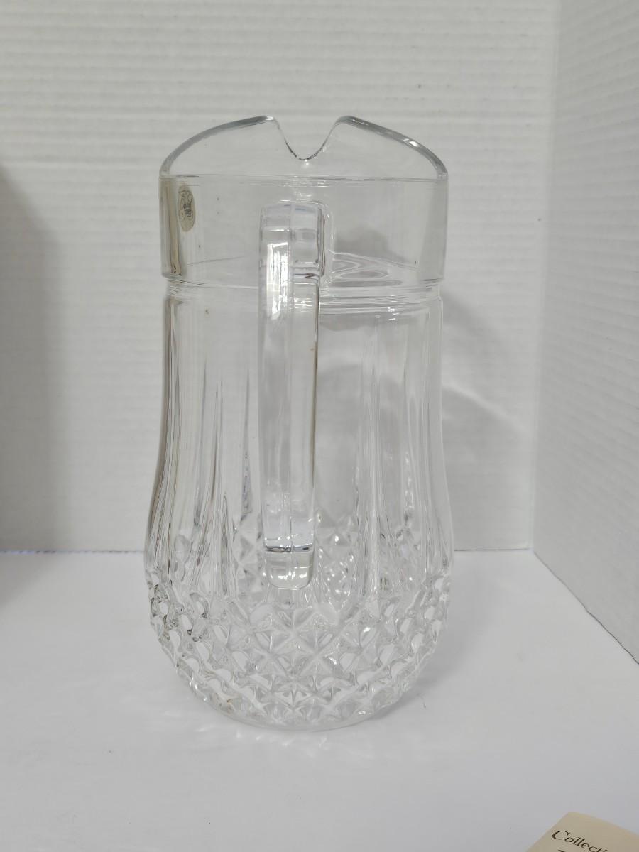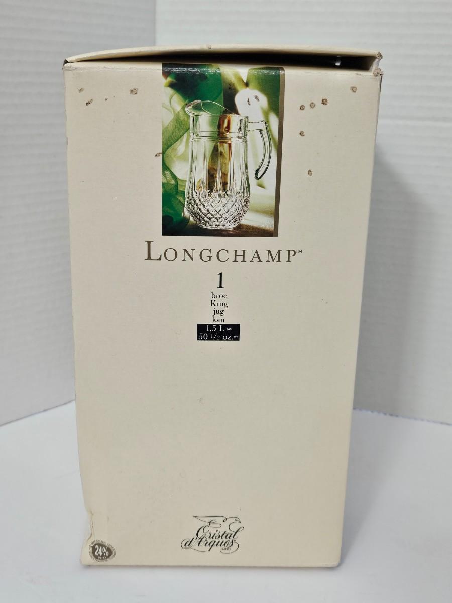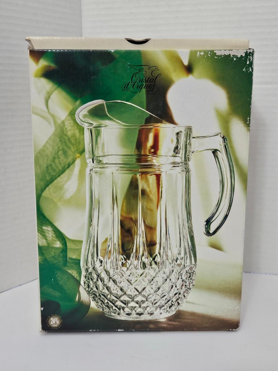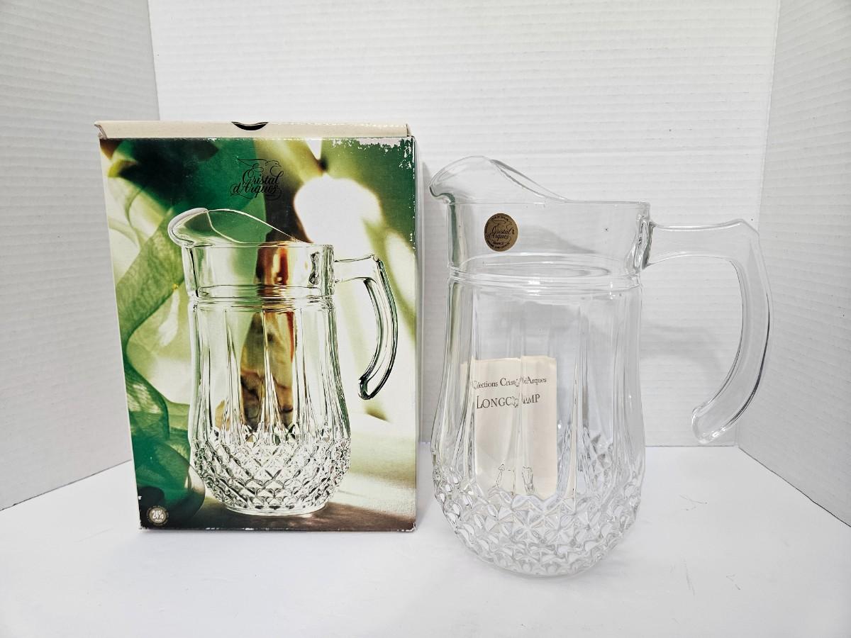 This is a stunning, brand-new in box (NIB) Cristal d'Arques-Durand Longchamp pattern pitcher, crafted in France. This iconic and timeless piece features the brilliant clarity and substantial weight of genuine 24% lead crystal and the signature diamond cut pattern around the base. It is a classic design that adds a sophisticated touch to any table setting or collection.