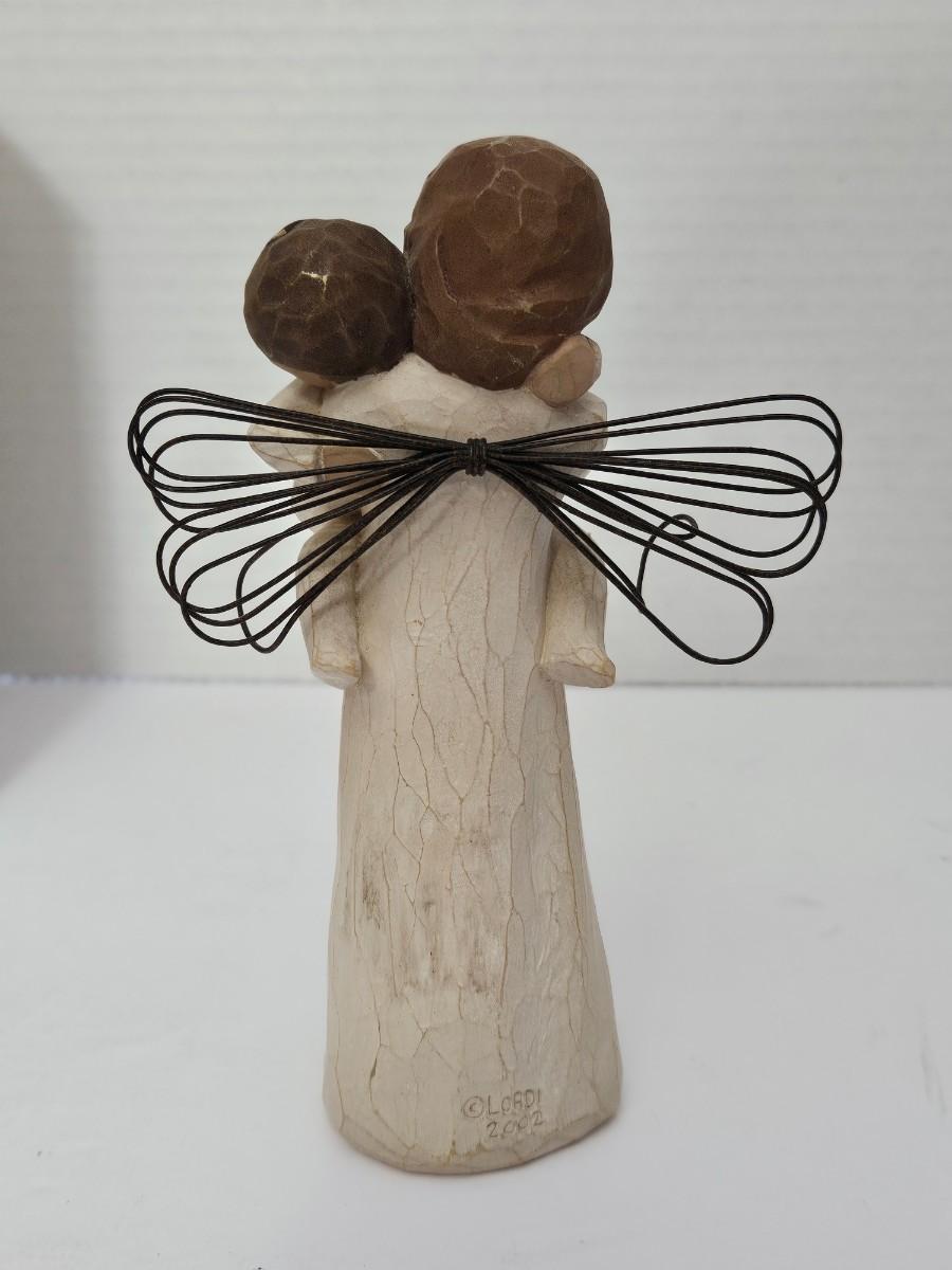 This is a brand-new in box (NIB) Willow Tree figurine titled "Angel's Embrace". Sculpted by artist Susan Lordi and distributed by DEMDACO, this piece was introduced in 2002 and carries the sentiment: "Hold close that which we hold dear". The figure depicts an angel in a cream dress with wire wings, embracing a child. It serves as a meaningful gift to celebrate a new baby, a baptism, or simply to express comfort and protection.