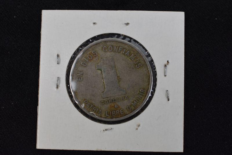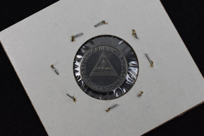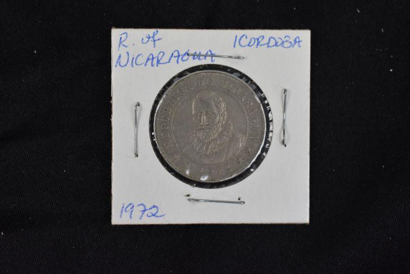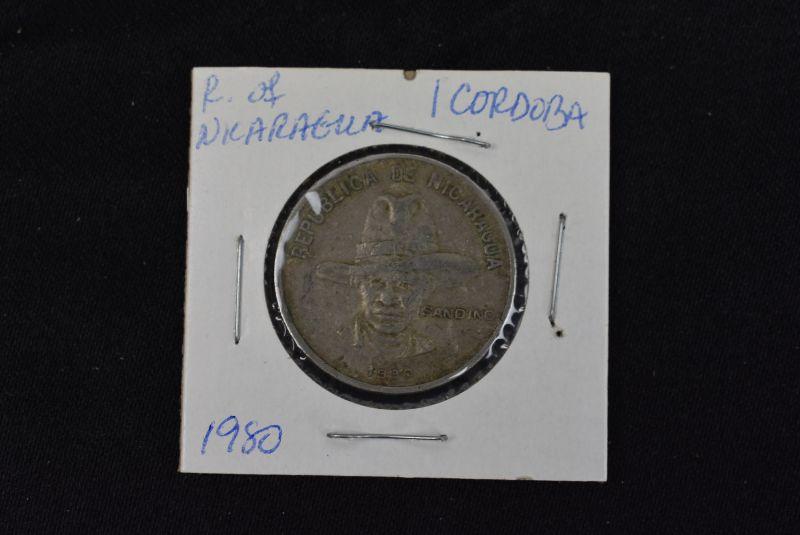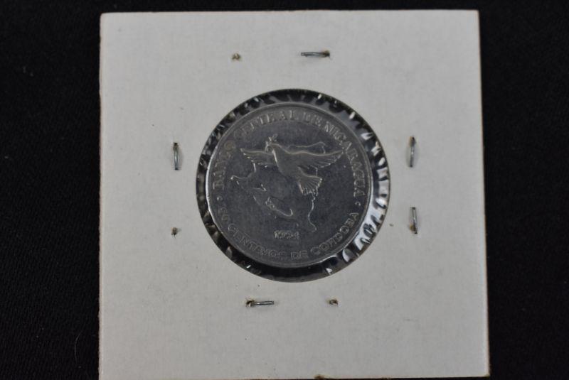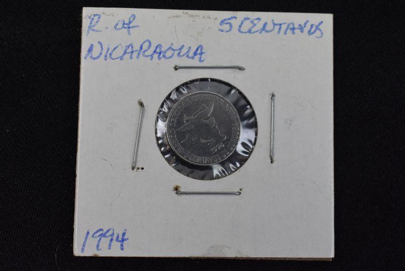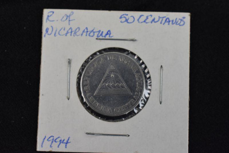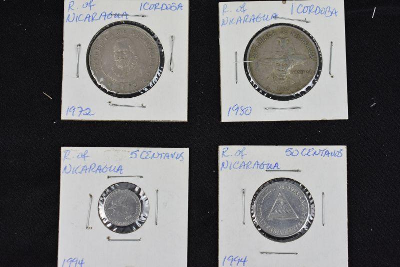 1972 Republic of Nicaragua 1 Cordoba, 1980 Republic of Nicaragua 1 Cordoba, 1994 Republic of Nicaragua 5 Centavos, and 1994 Republic of Nicaragua 50 Centavos
