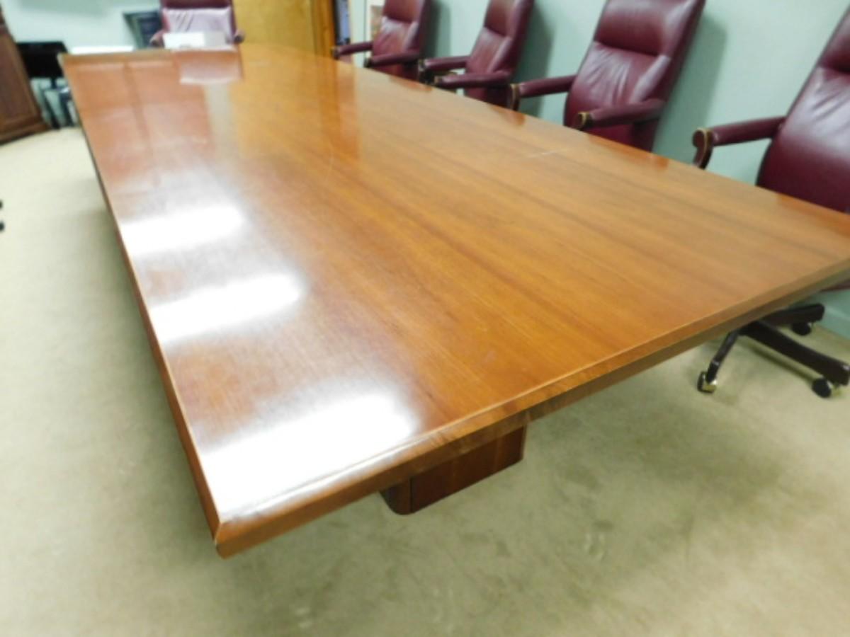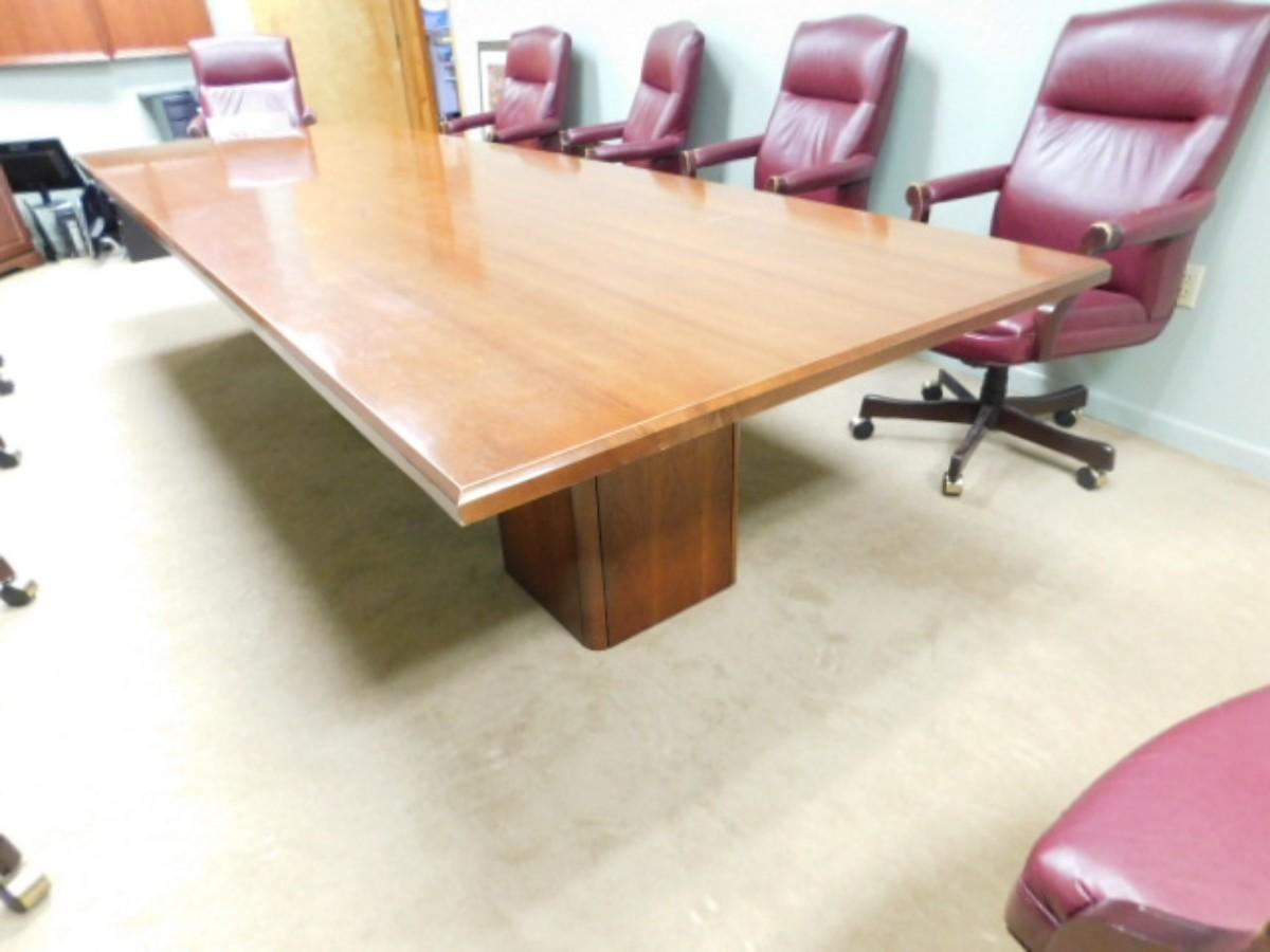 Nice 12' Walnut Finish Conference Table (No Chairs) Expect some wear or scratches to finish. Shipping option available via freight or local mover at Buyer's expense. Buyer must have all shipping scheduled within the stated dates and times of pickup. Recommended local mover is Beaty Bros. Moving 828-201-2982