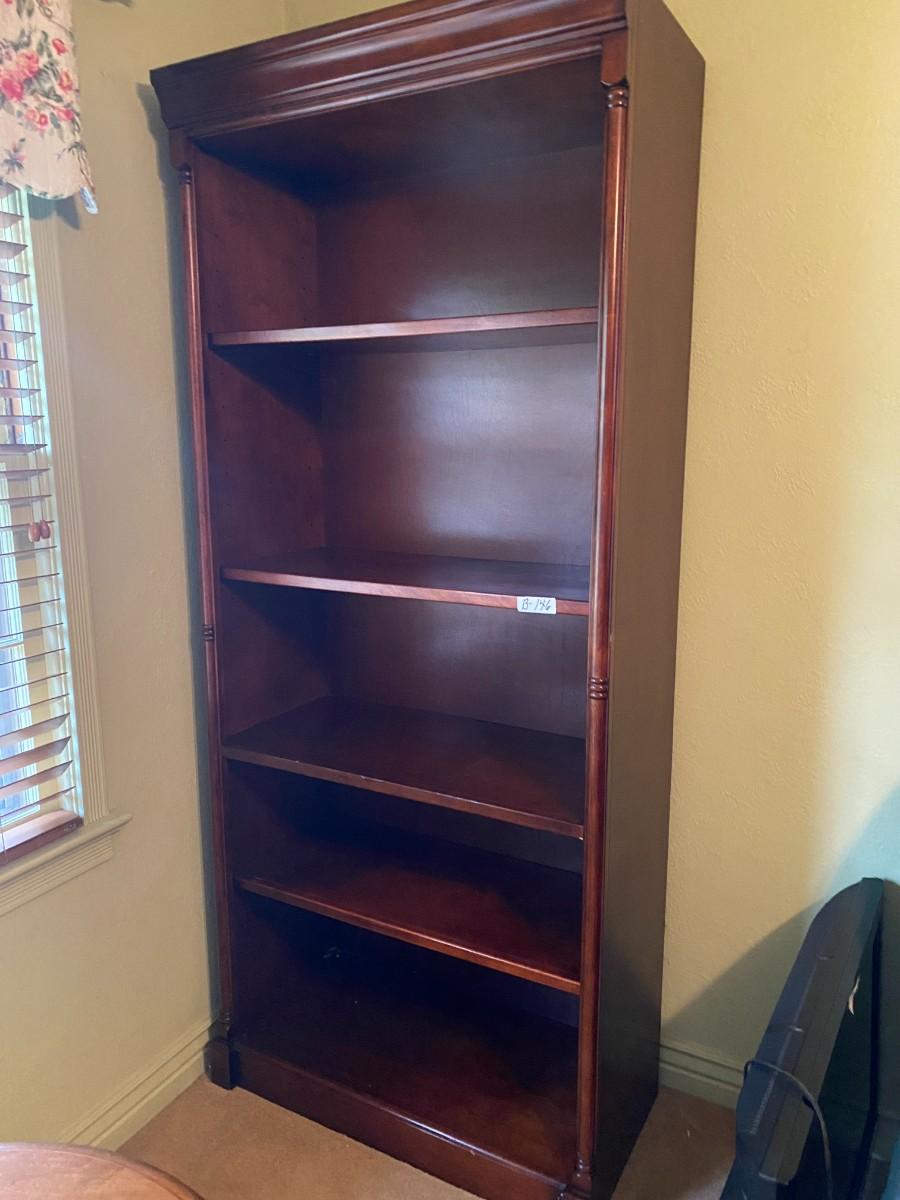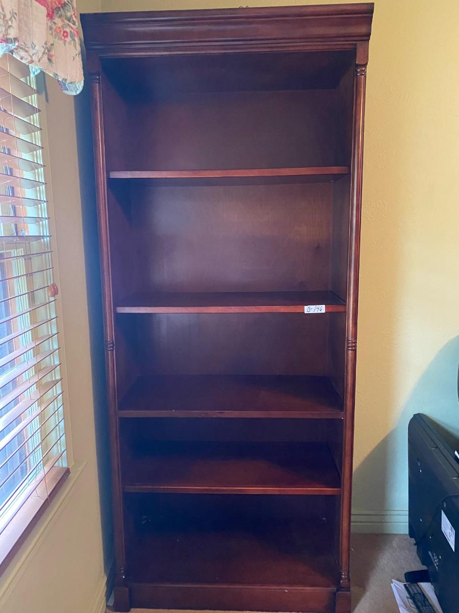 5-Adjustable Shelf Dark Cherry Finish Shelf. 16" x 33.5 x 79"a Purchased at American Furniture Warehouse. Looks good. (sold separately two more that matching bookshelves at Lots 147 and 148).