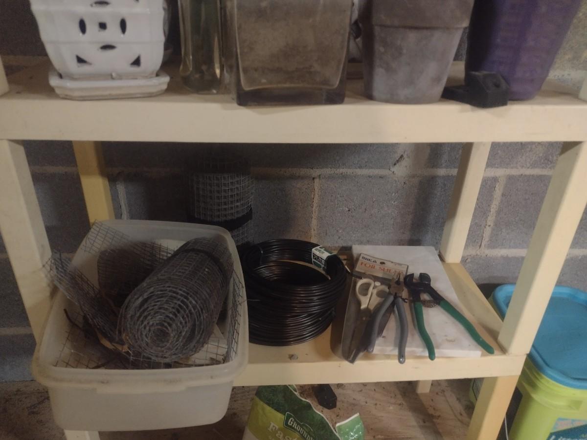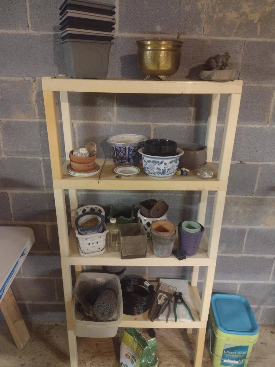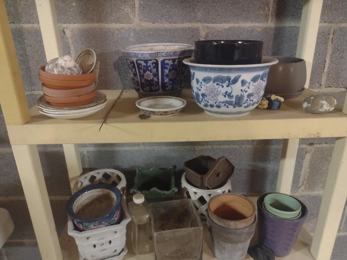 Nice Assortment of Ceramic, Pottery, and Composite Planter Pots, Trays, and Gardening Items. Includes shelf.