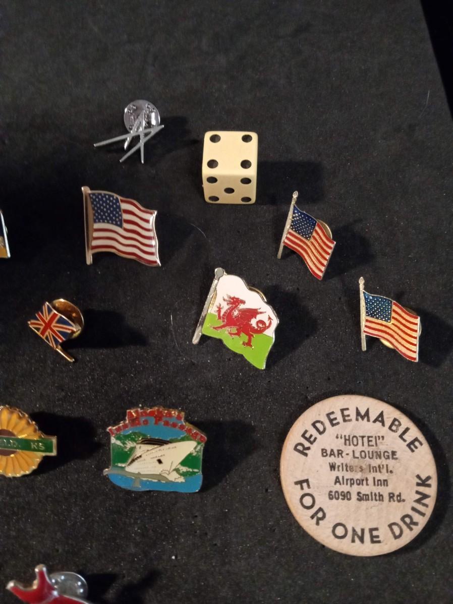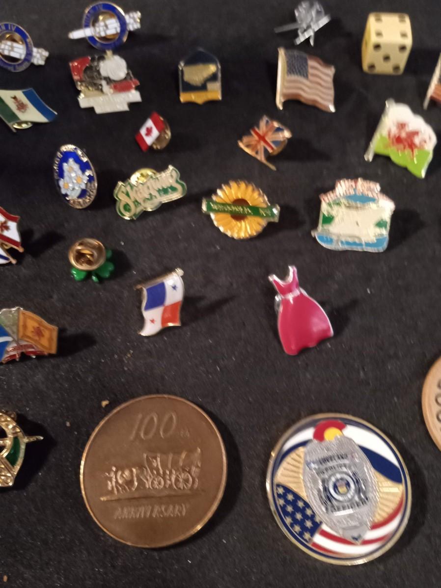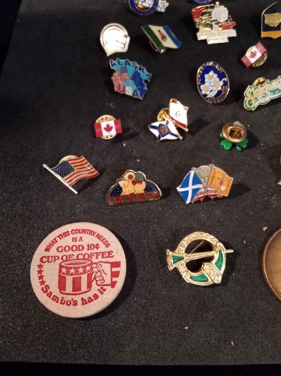 NICE ASSORTMENT OF HAT PINS AND VARIOUS FAUX COINS