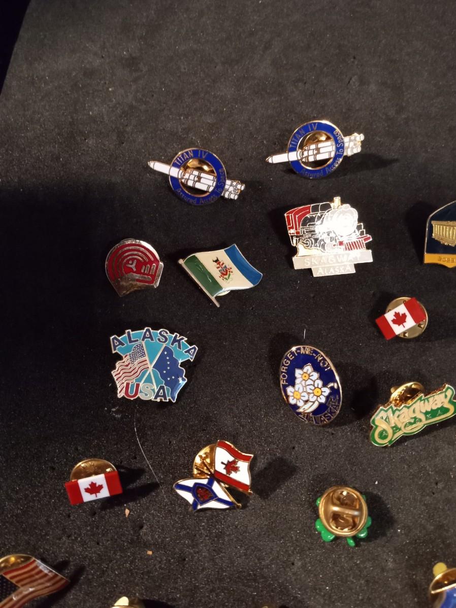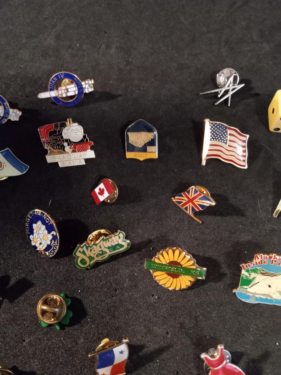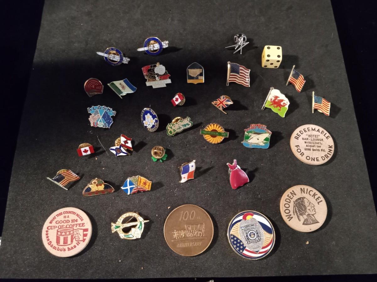 NICE ASSORTMENT OF HAT PINS AND VARIOUS FAUX COINS