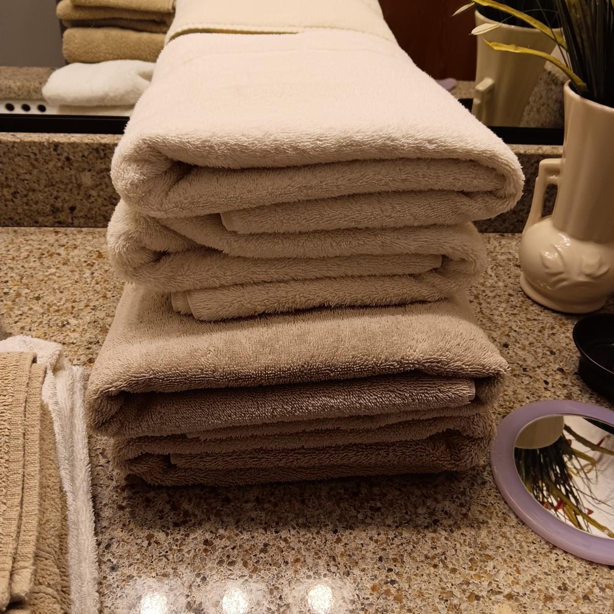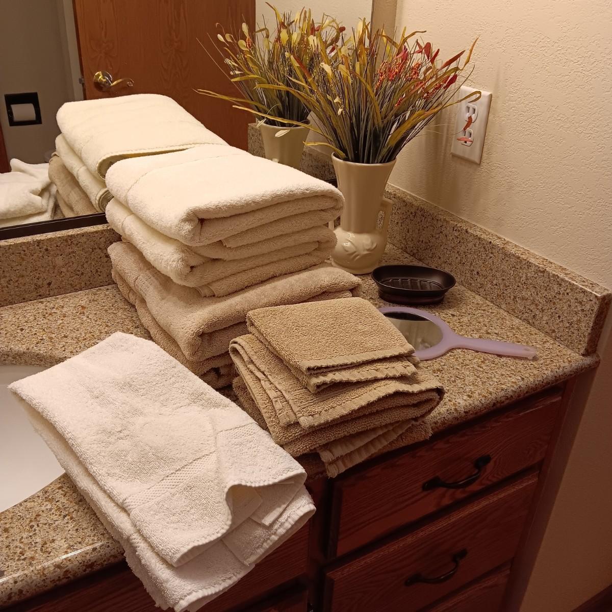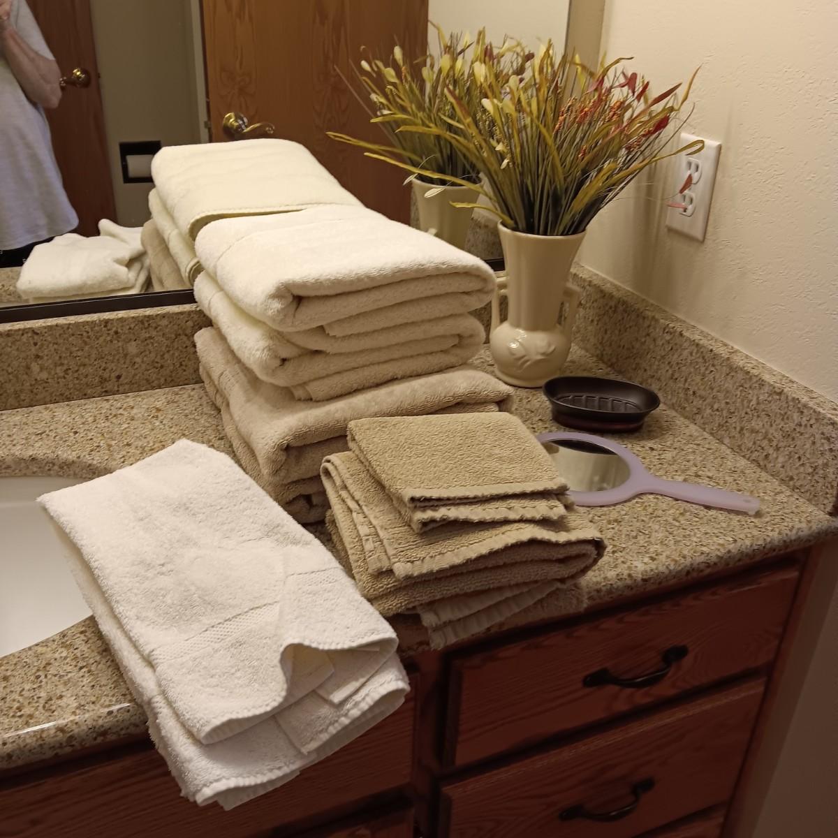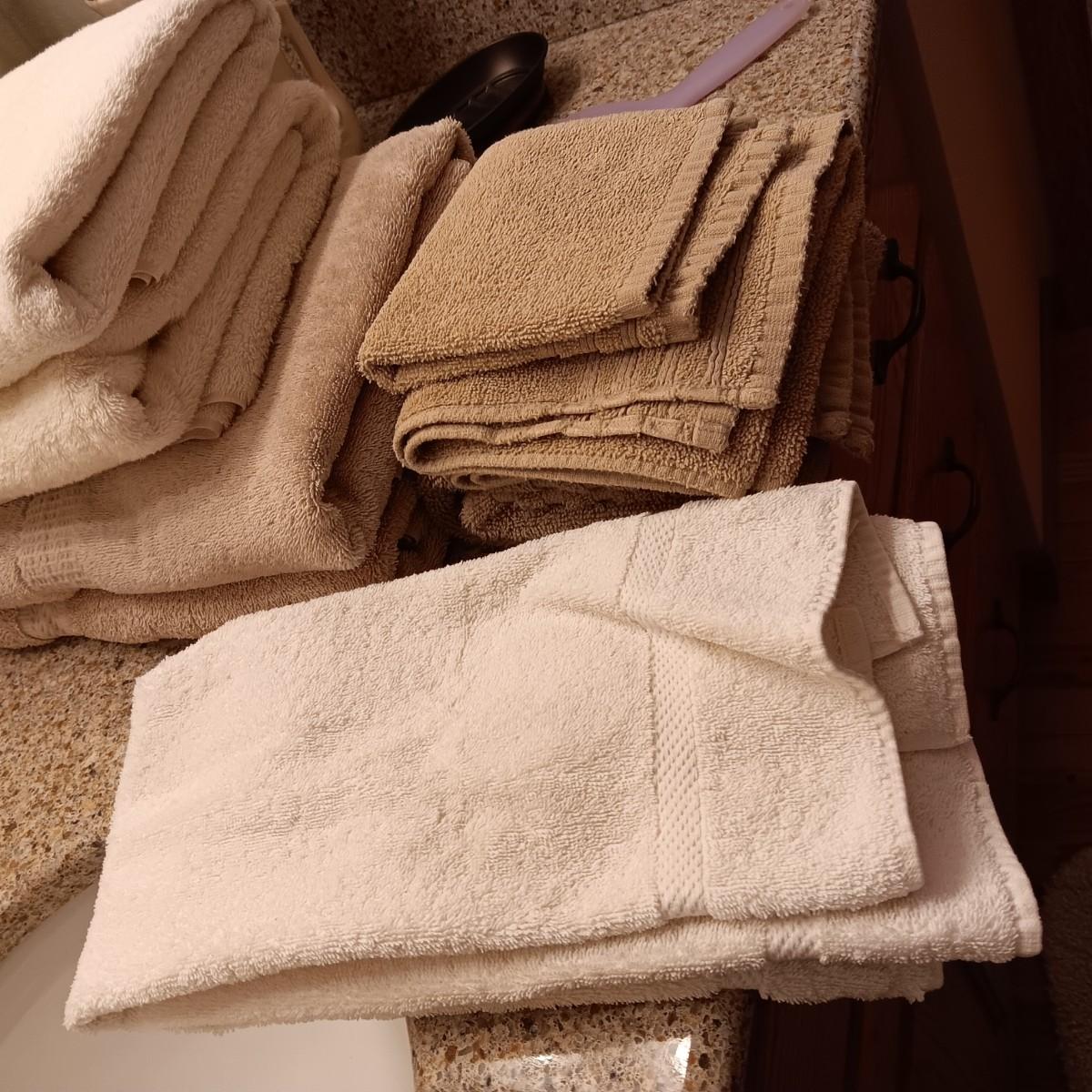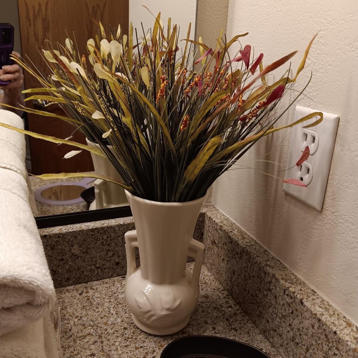 NICE BATH TOWELS, MCCOY VASE WITH FAUX FLOWERS AND MORE