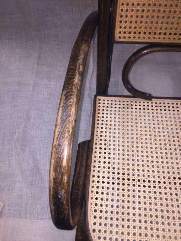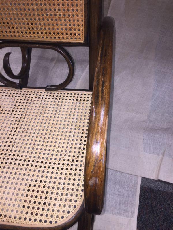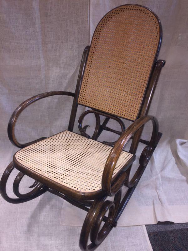 Lovely Bentwood Rocker with caning in excellent condition. Some finish wear on arms, otherwise in good structural condition. Measures 22.5"w x 41"d x 40"t
