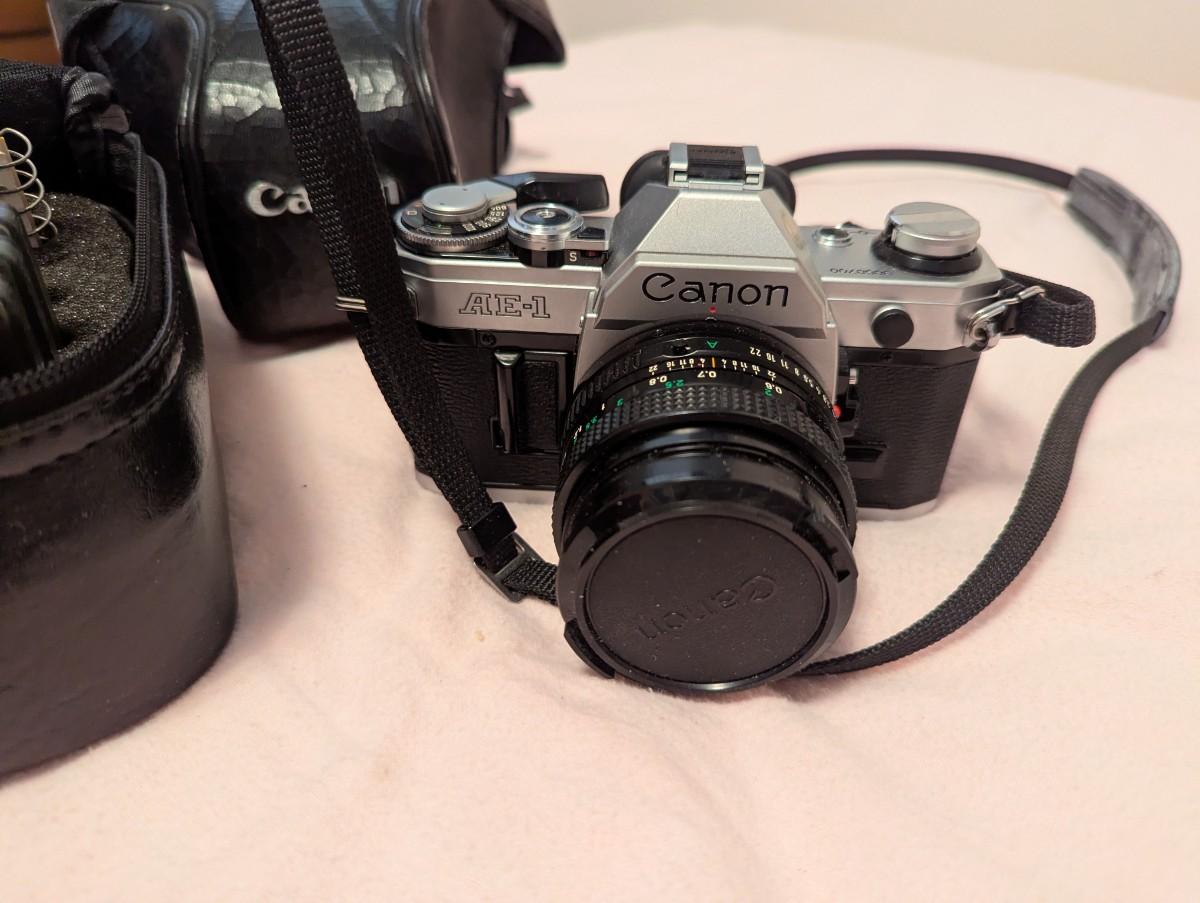 Cannon AE 1 film camera with an extra lens, filters, and tripod. All in excellent condition.