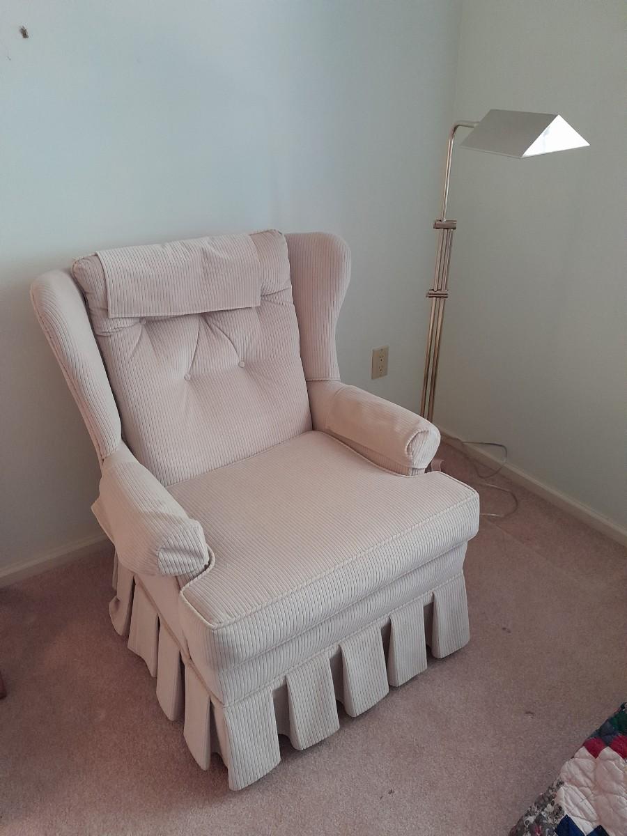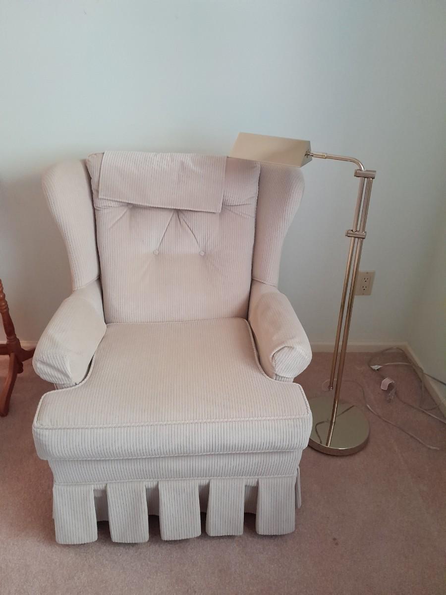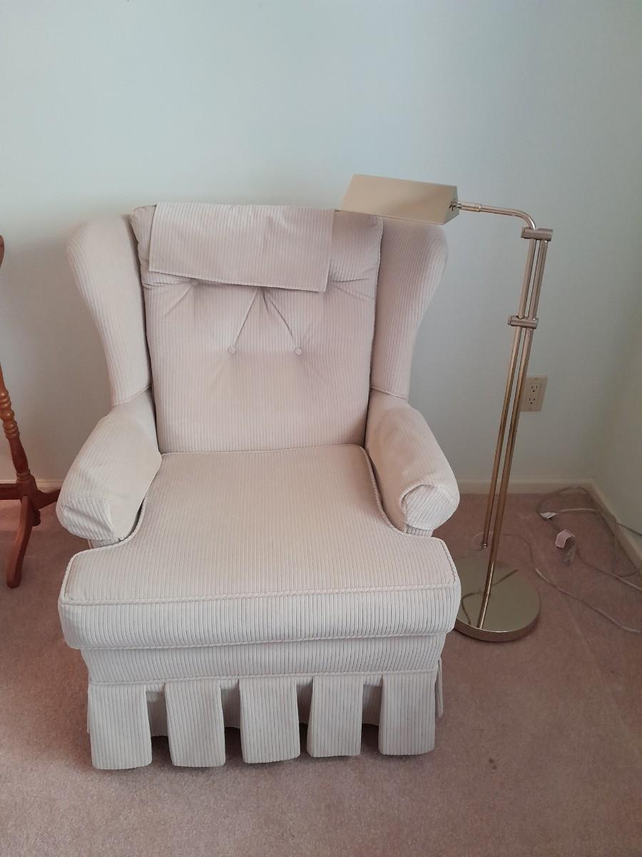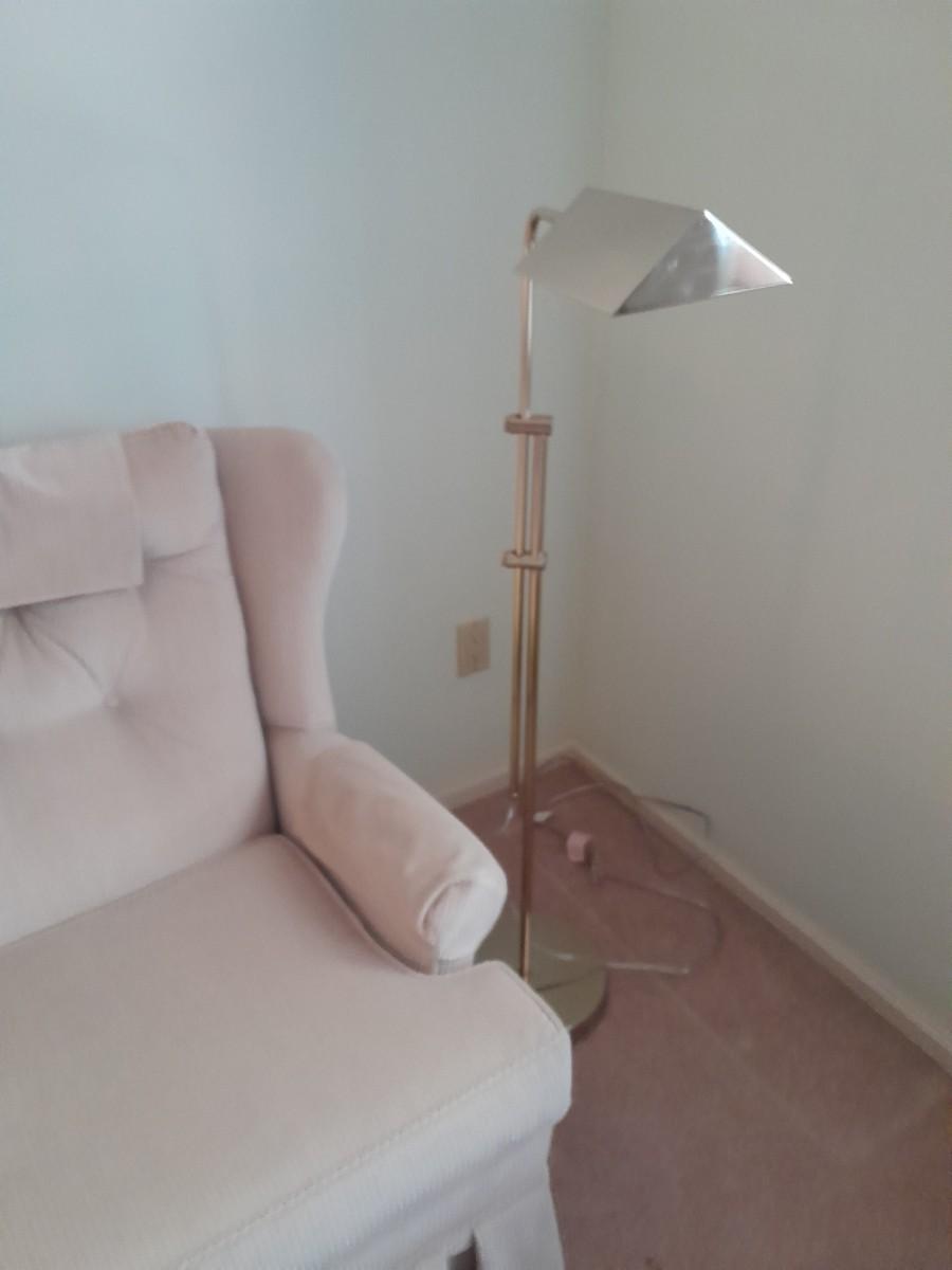NICE CLEAN ARMCHAIR 33" X 28" X 25" WITH ADJUSTABLE BRASS FLOOR / OFFICE LAMP