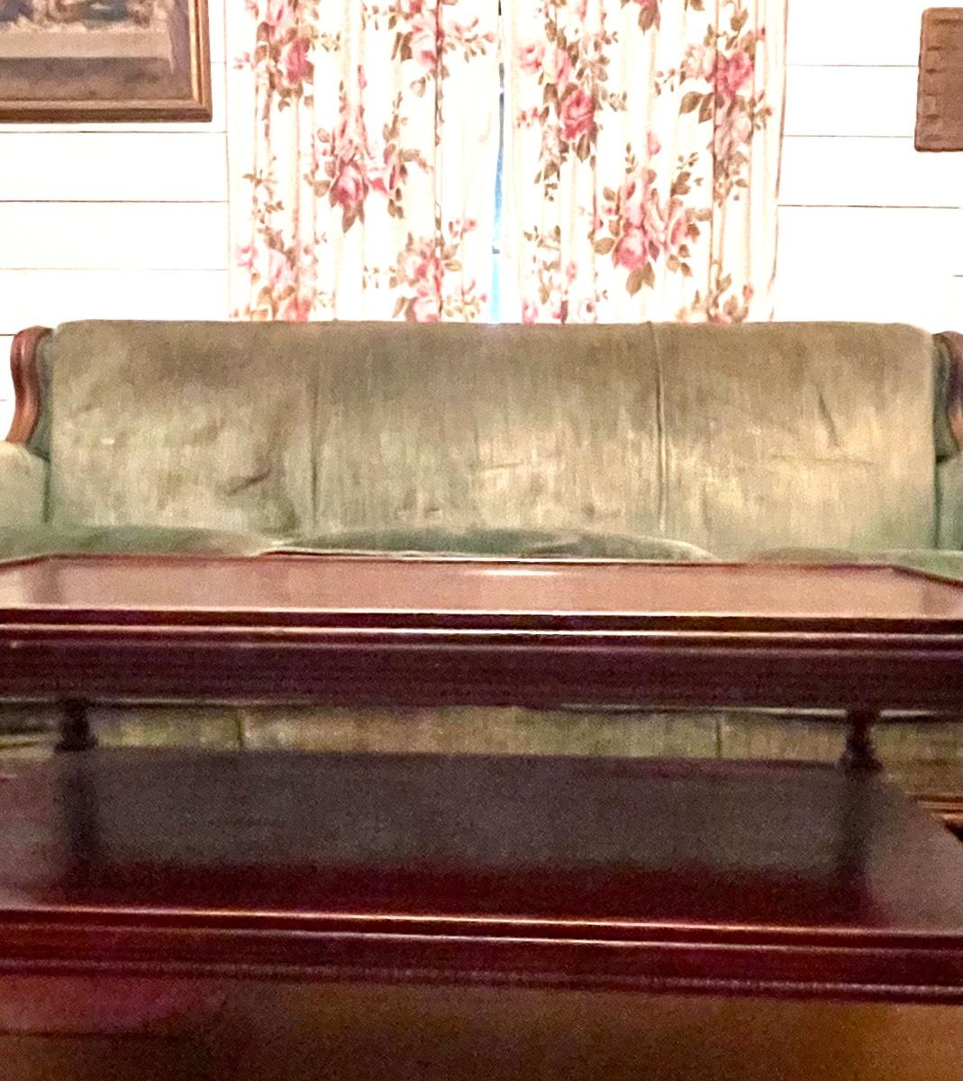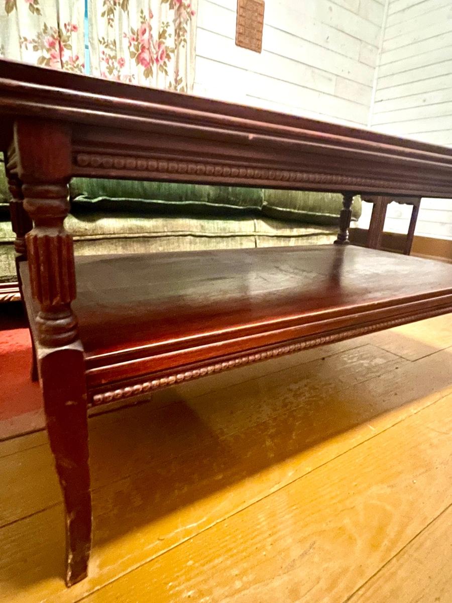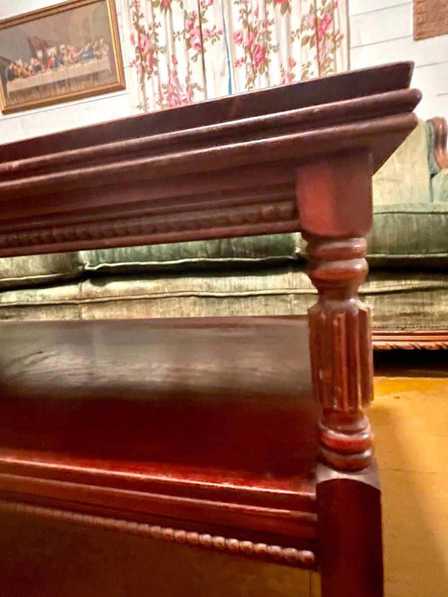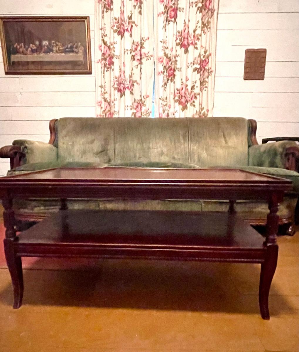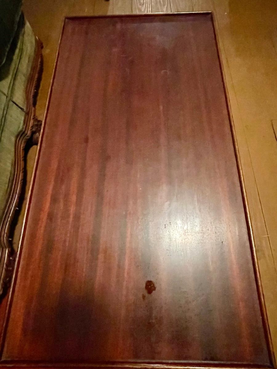 Nice solid wood coffee table. Nice edges and rich color. Scuffs and scratches present. Signs of age and use. Use as is or give it a coat of paint to match those two end tables. Nice cottage/ farmhouse look.