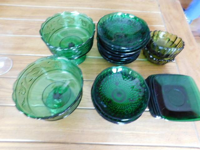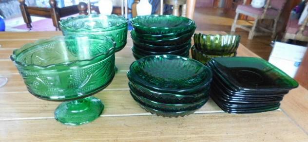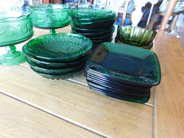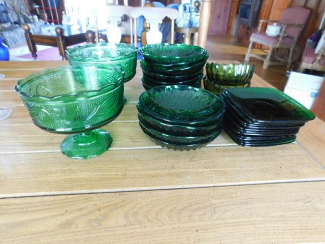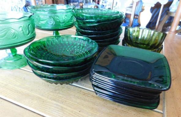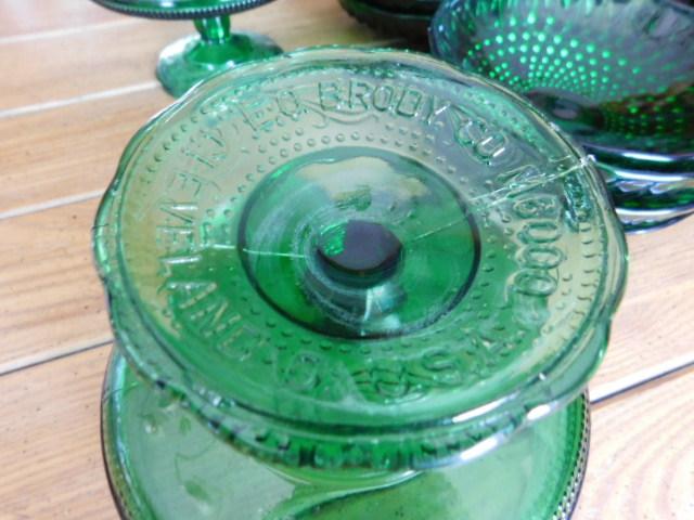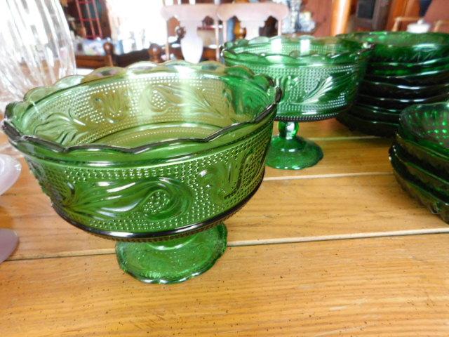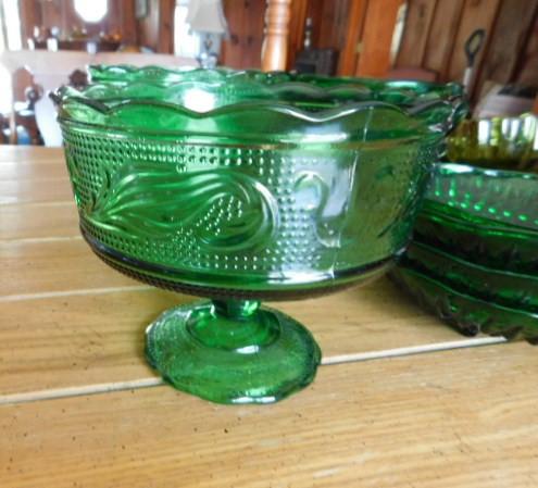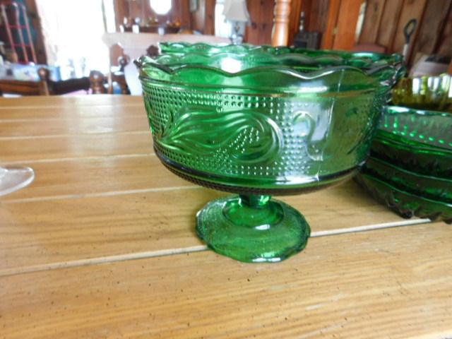 Nice Collection of Green Glass Including Two E.O. Brody Compotes